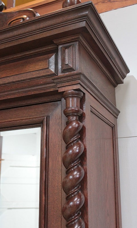 Elle est encadrée de deux colonnes torsadées et repose sur des pieds galette.