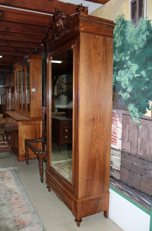Armoire en noyer massif ouvrant par une porte à glace et un tiroir en partie basse. Fronton sculpté. Intérieur garni de 4 étagères et d’un tiroir. Époque 1920. Finition cirée.