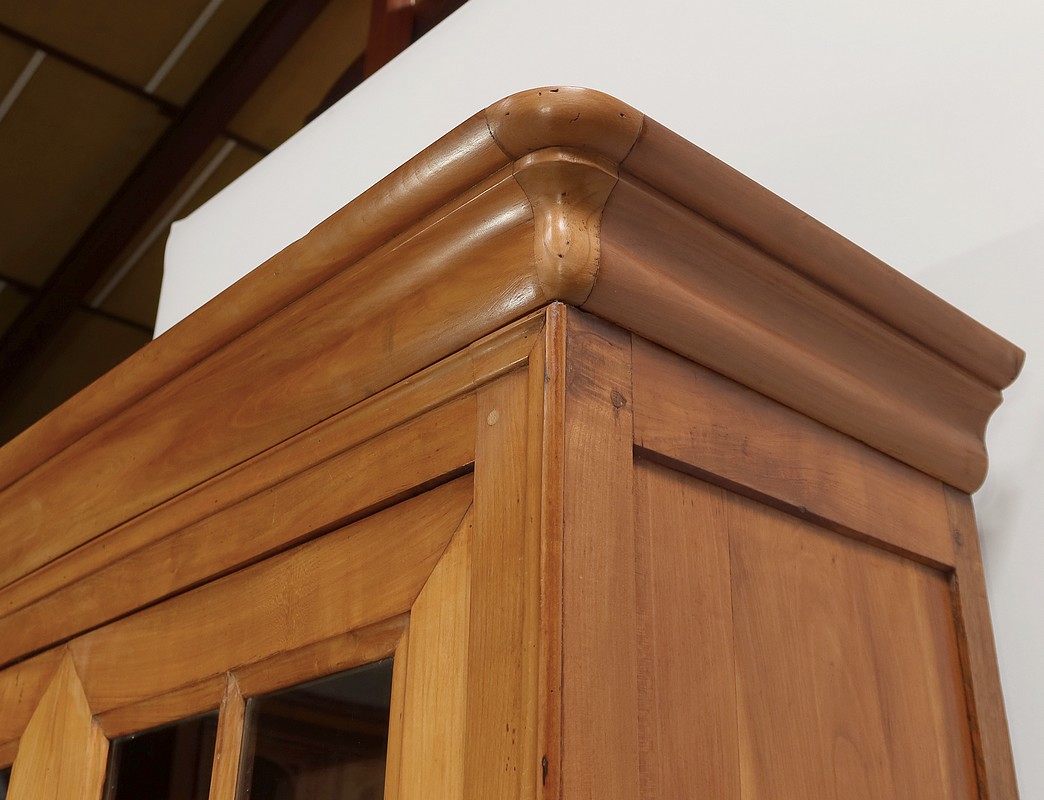Cette armoire bibliothèque est sommée d’une corniche à doucine.