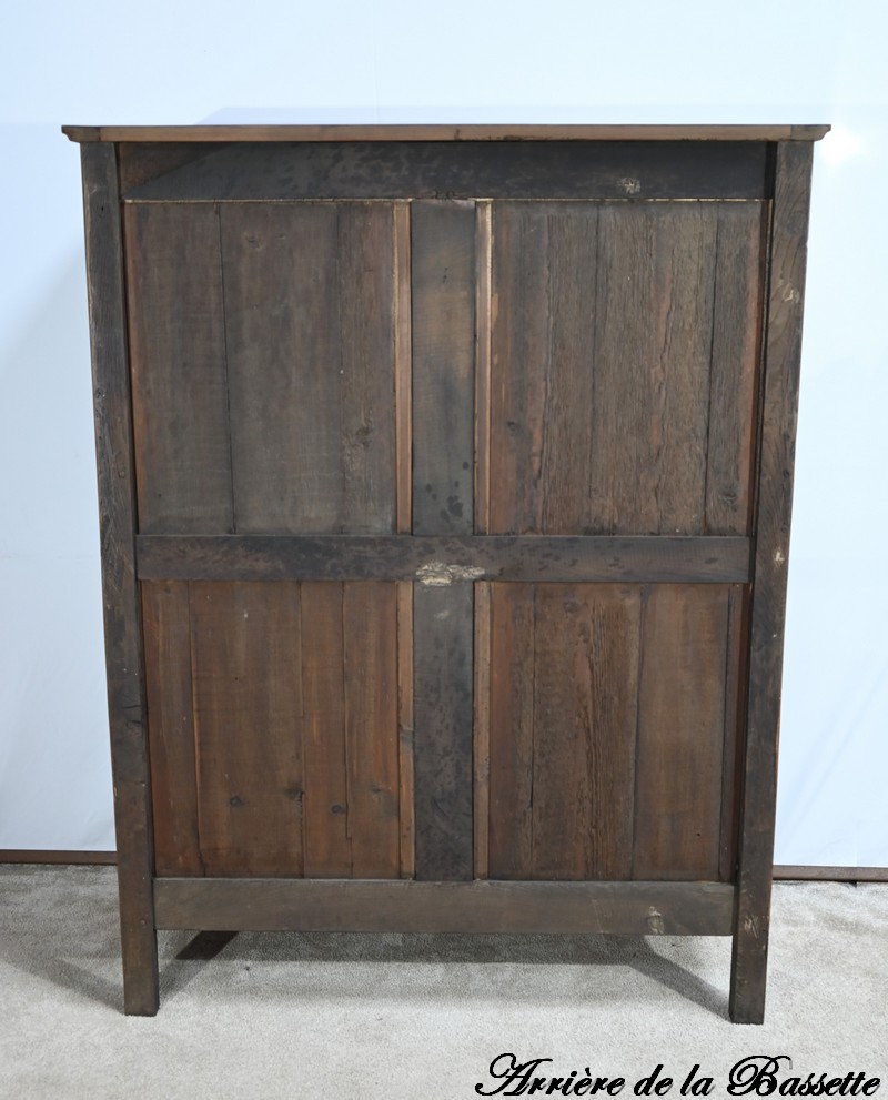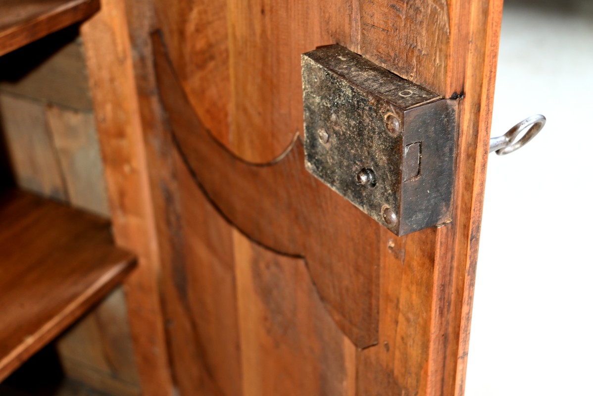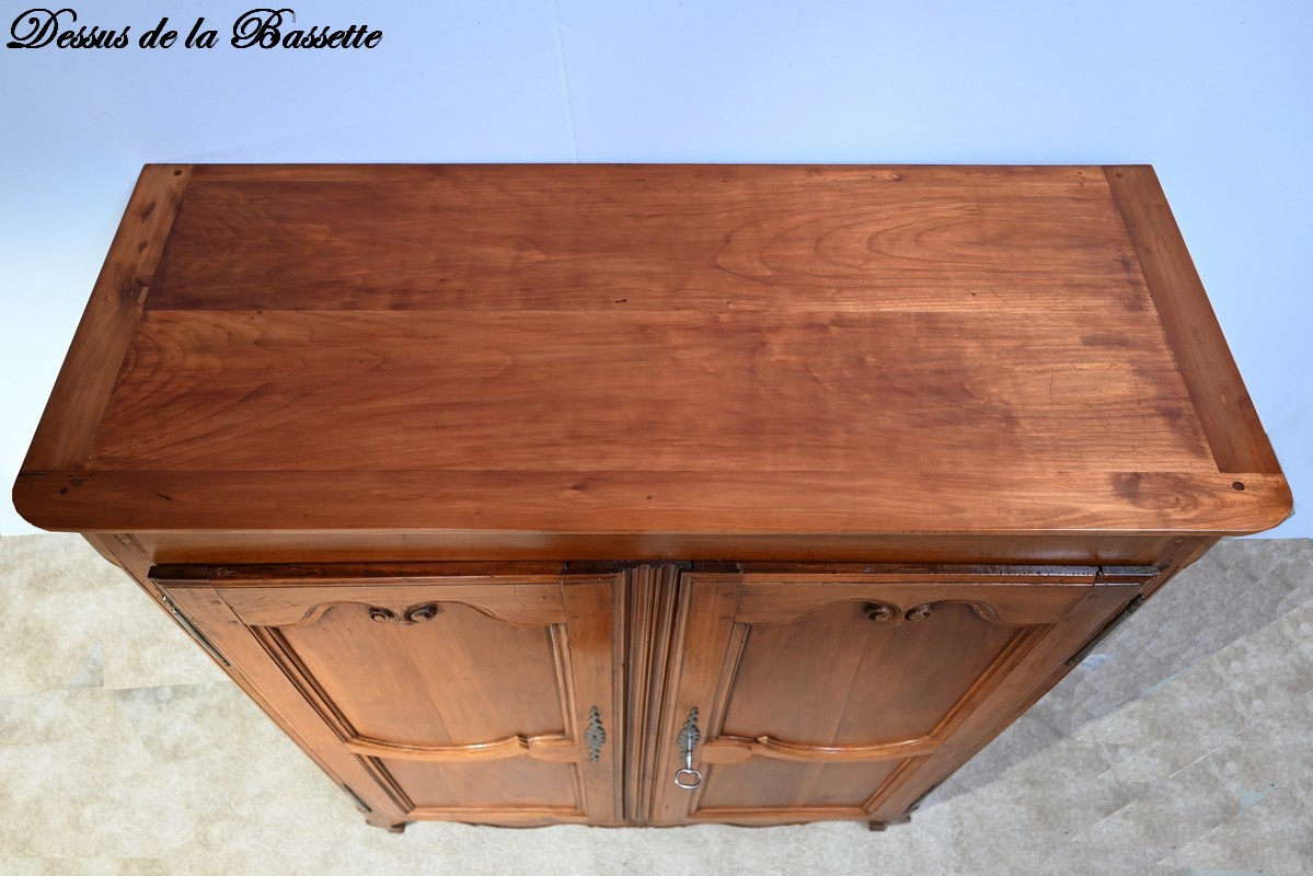 Cette petite armoire, communément appelée « Bassette », présente un corps en merisier massif et des côtés en chêne.