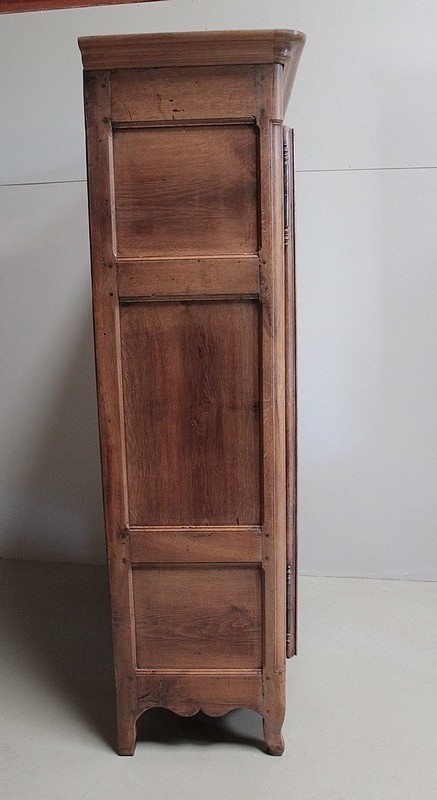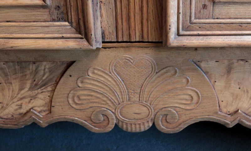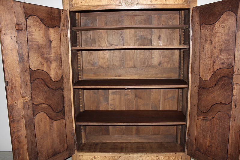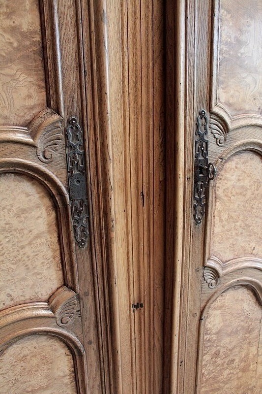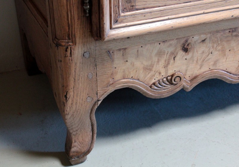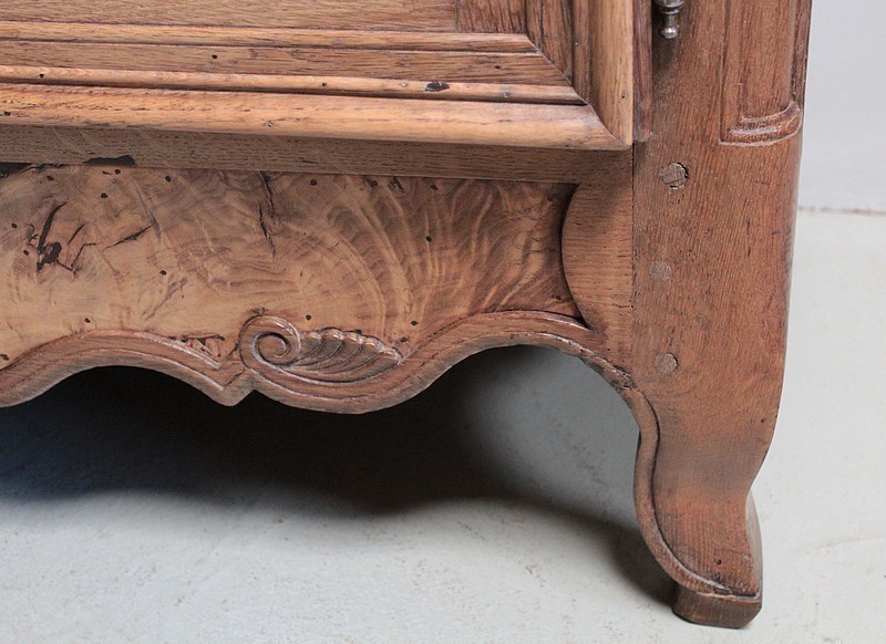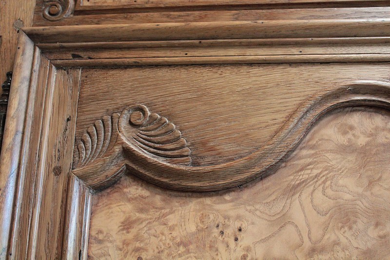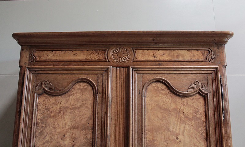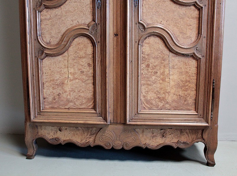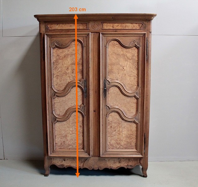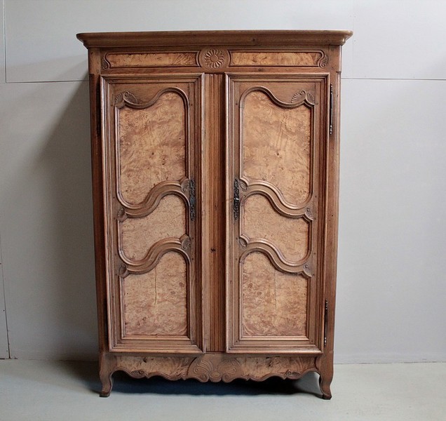 Armoire de style Louis XV en chêne naturel ouvrant par 2 portes à panneaux chantournés en loupe de frêne.