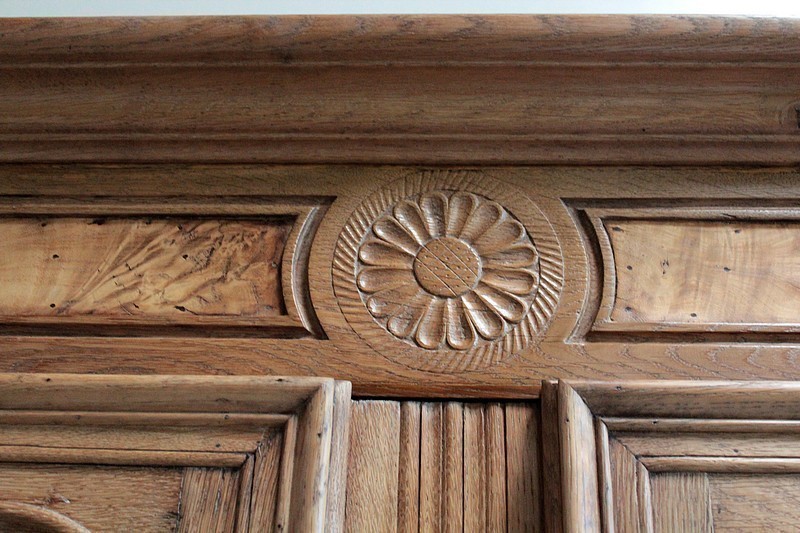 Les traverses et les portes sont sculptées de feuillages et de rosaces.