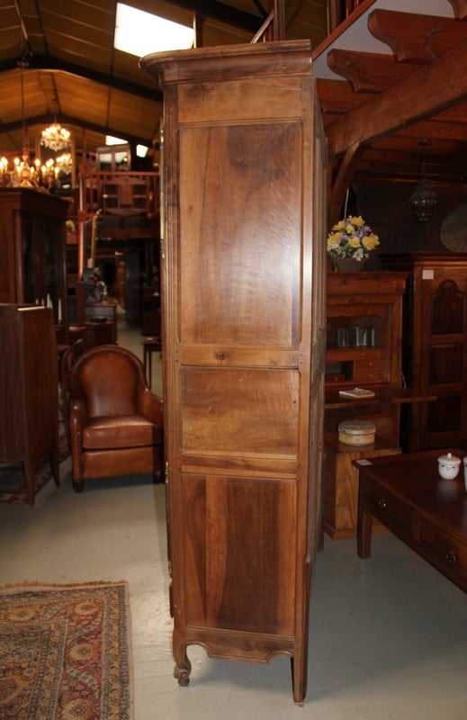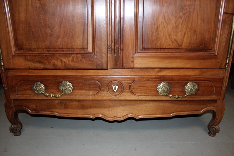 Elegante armoire Louis XV en noyer blond ouvrant par 2 portes et un grand tiroir en partie basse. Pieds à enroulement, portes à traverse. Ses fiches, entrées et poignées sont en cuivre, L’intérieur est garni de 3 étagères et 2 tiroirs.Région du Sud-Ouest. Epoque XVIIIe.