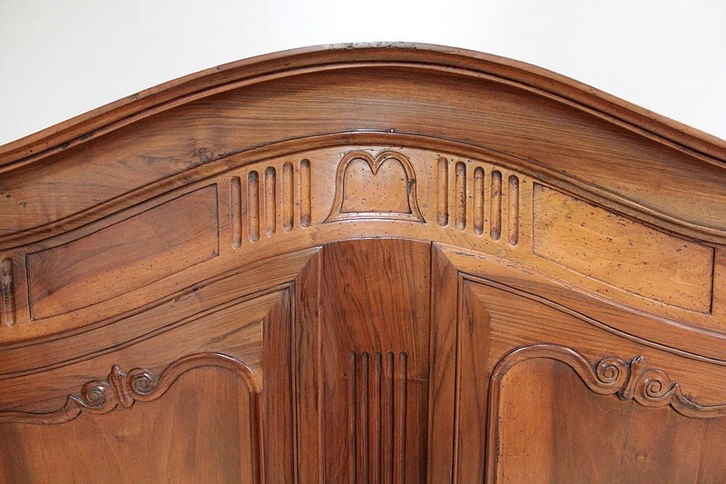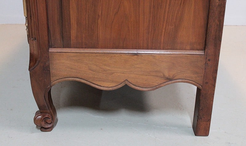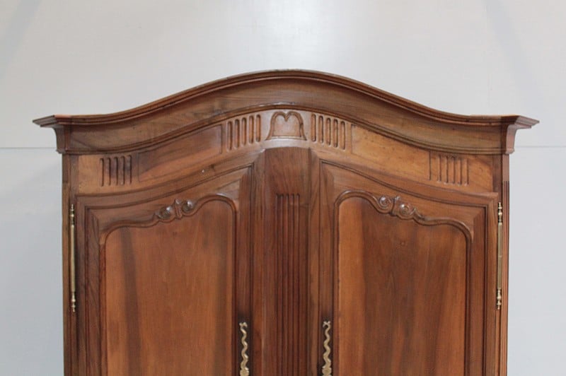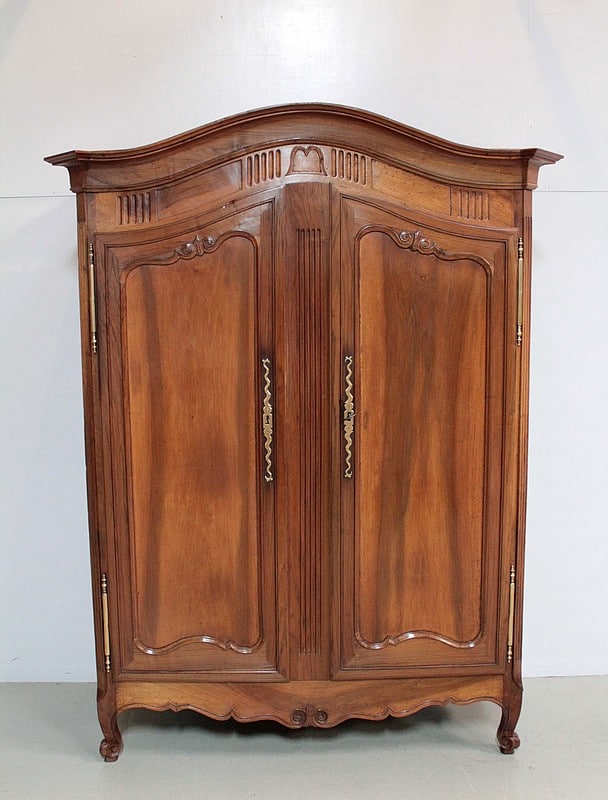 Armoire de style Louis XV, ‘Chapeau de Gendarme’ en noyer massif à pans coupés à cannelures. L’arrière est en chêne.