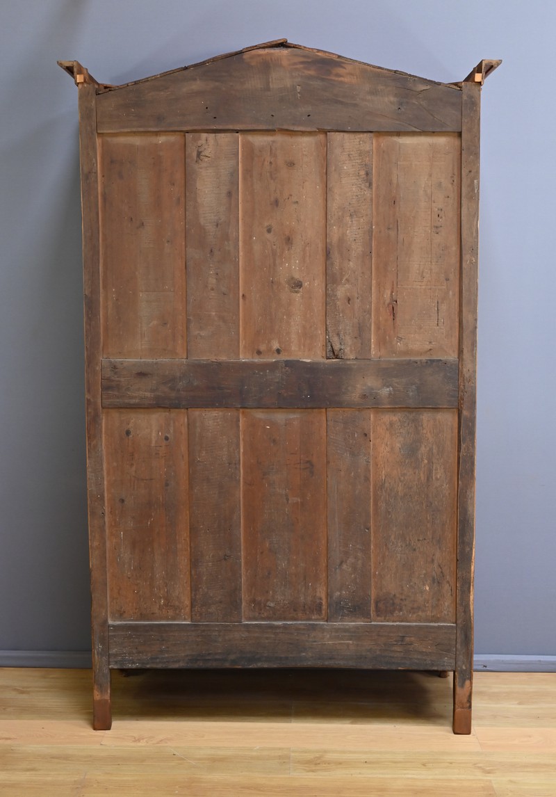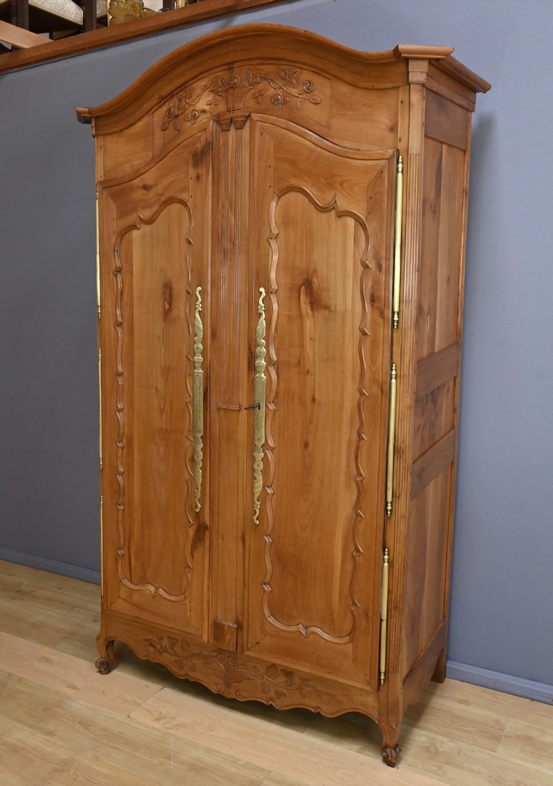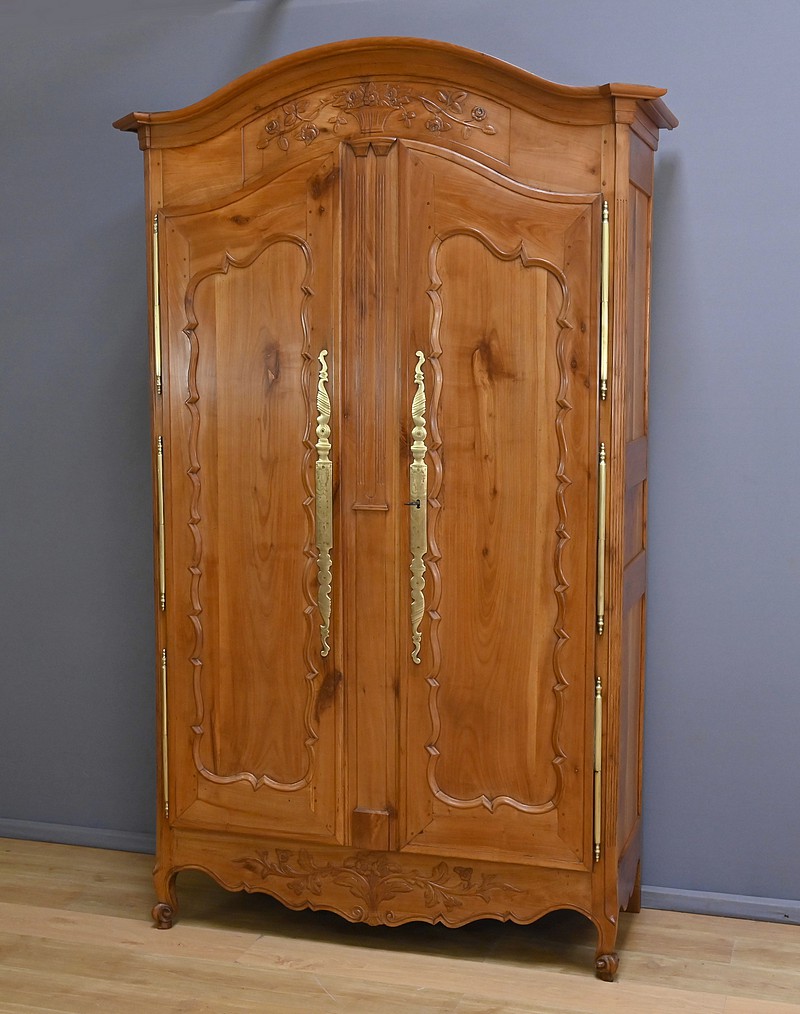 Cette superbe armoire régionale, dite « à chapeau de gendarme », incarne avec raffinement l’esthétique du style Louis XV. Réalisée en merisier massif, elle s’ouvre en façade par deux majestueuses portes à médaillon. Ces portes, légèrement en saillie par rapport aux pieds, sont solidement maintenues par trois fiches en laiton chacune.