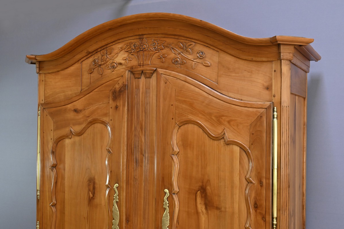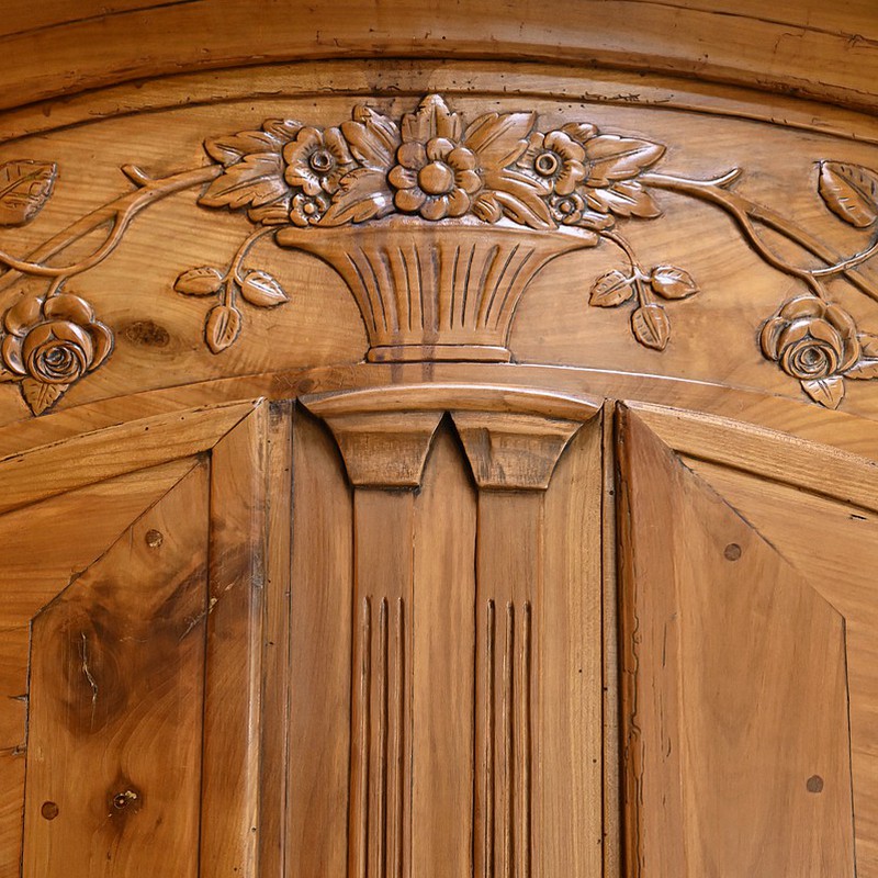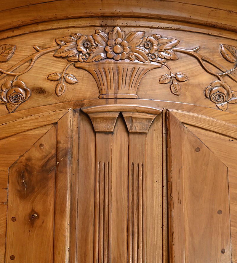 Entre les deux vantaux, un pilastre central se distingue, coiffé de deux éléments décoratifs à trois cannelures. La traverse supérieure est délicatement sculptée d’un panier de fleurs, motif emblématique du style Louis XV. La corniche, sobrement travaillée, confère à l’ensemble une élégance discrète.