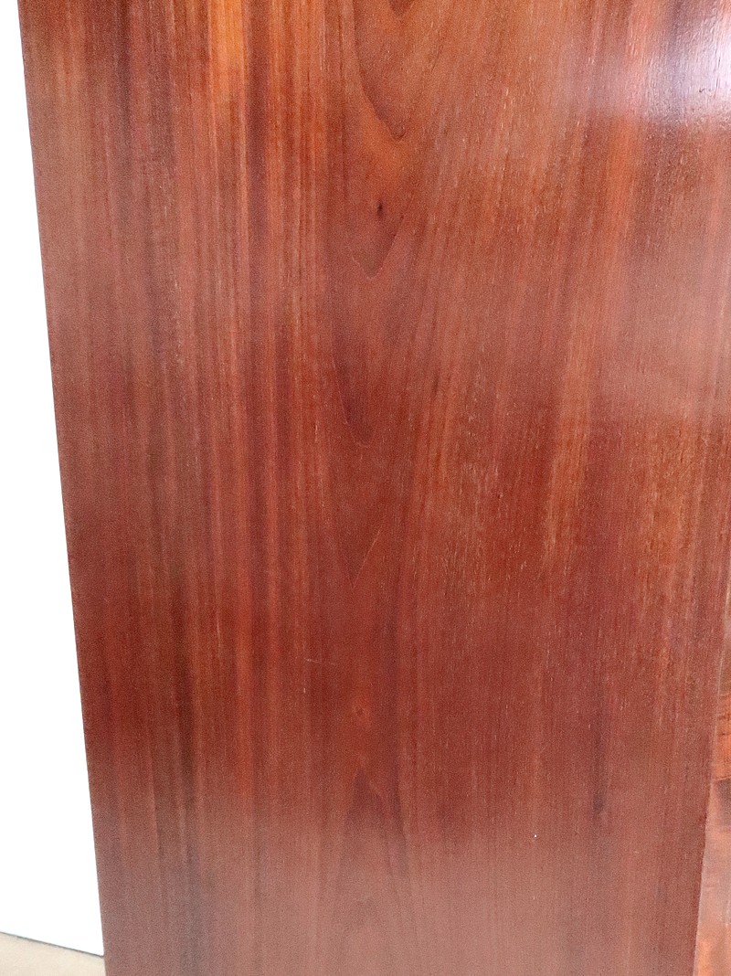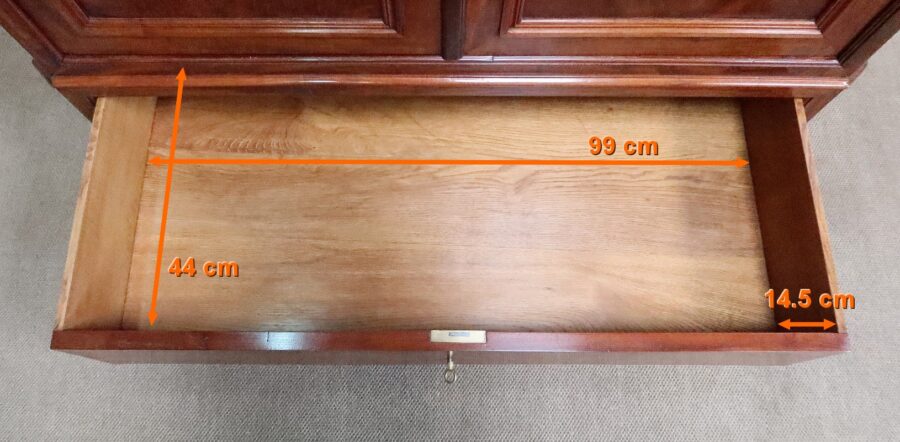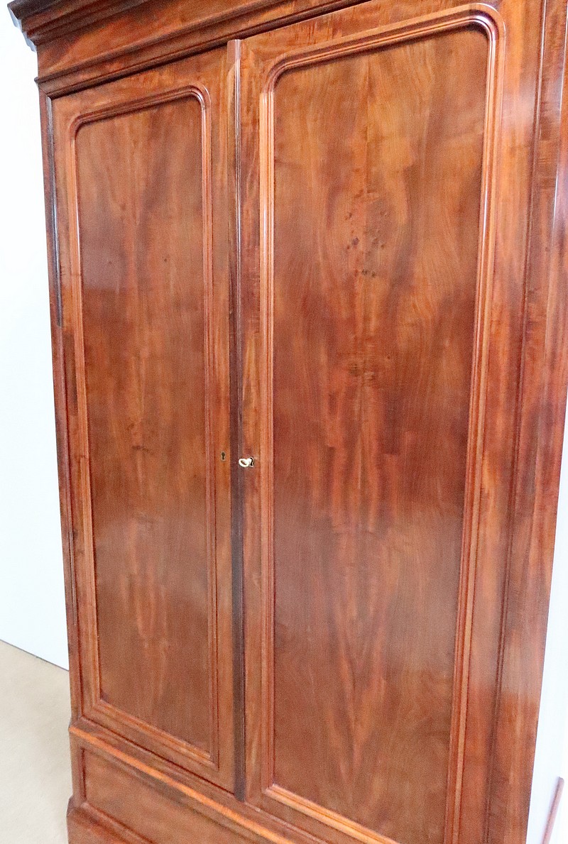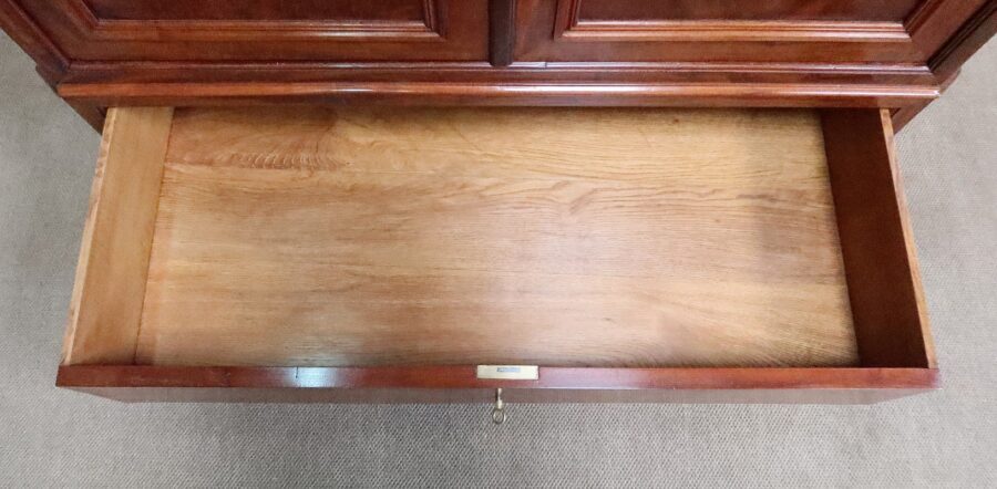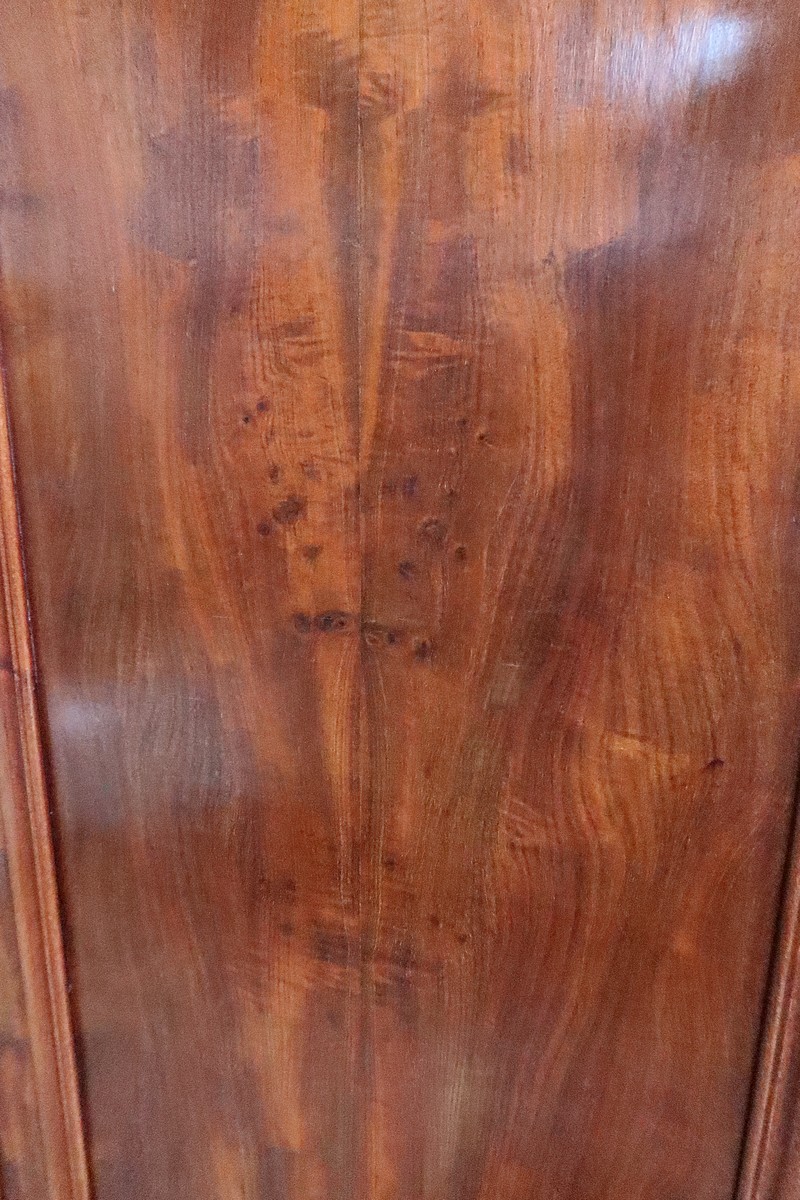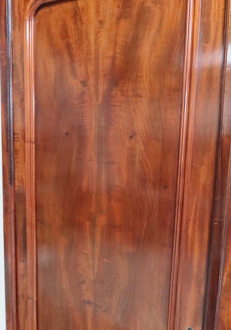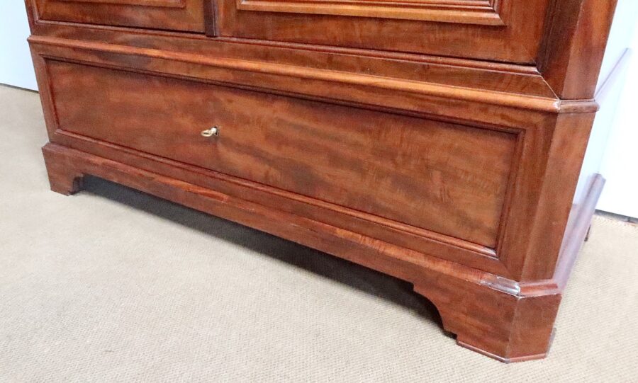Armoire en Acajou massif et plaqué, ouvrant par 2 portes à cadres moulurés et panneaux aux jolis veinages, façon livres ouverts. Elles sont équipées d’une serrure d’origine en laiton, fonctionnelle, à points d’accroches haut et bas, et accompagnée de sa clé.