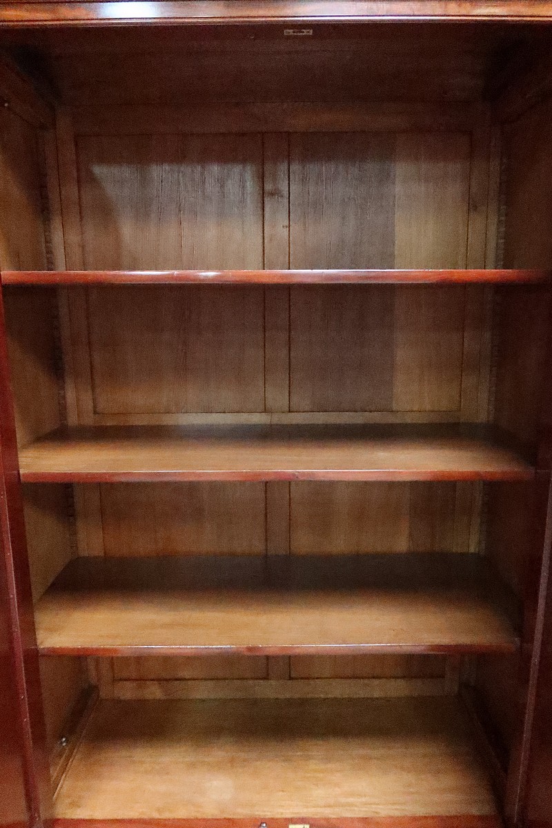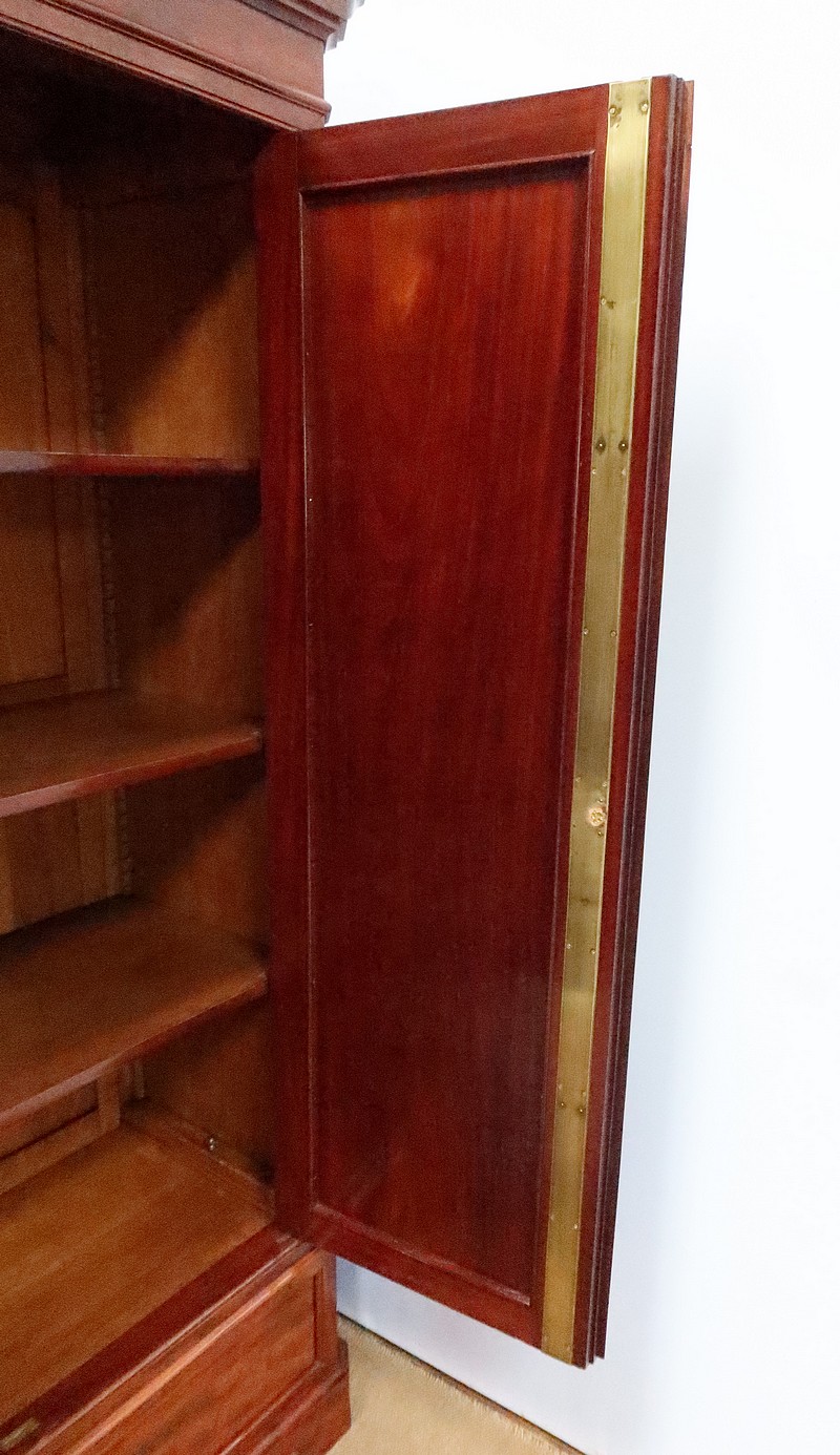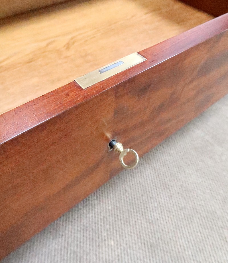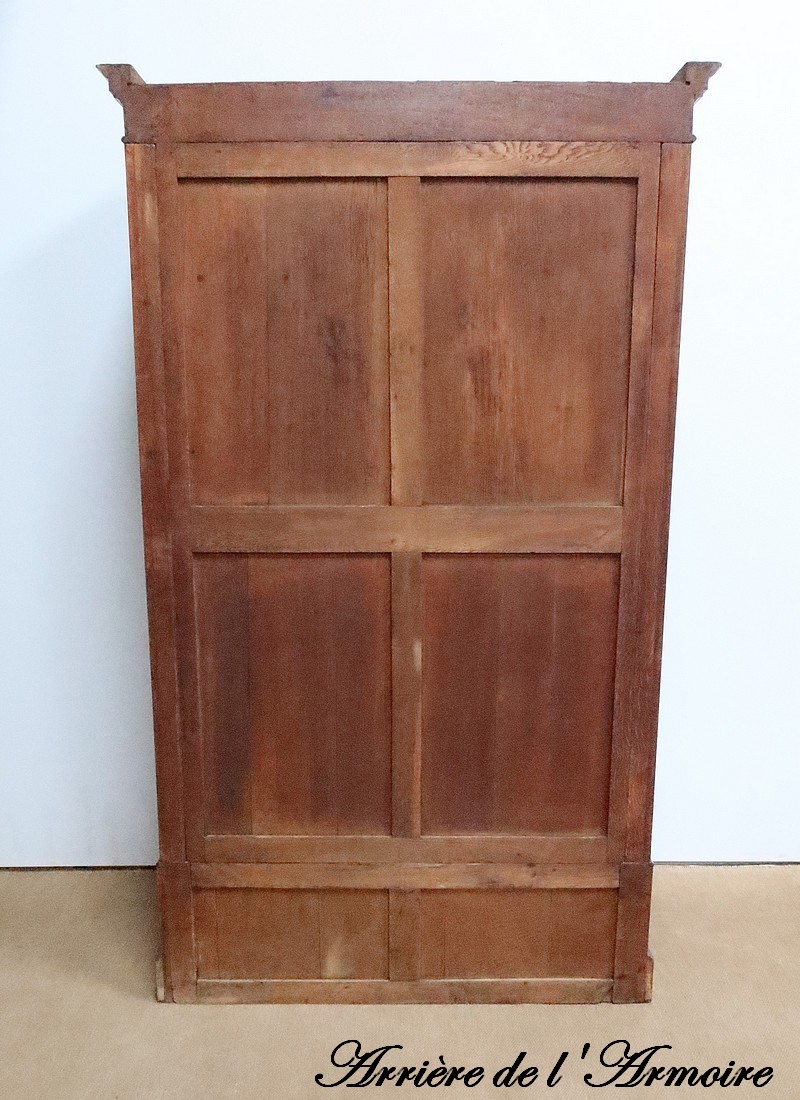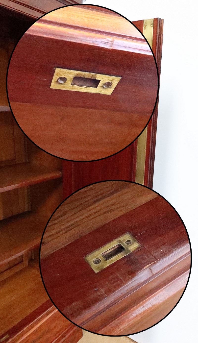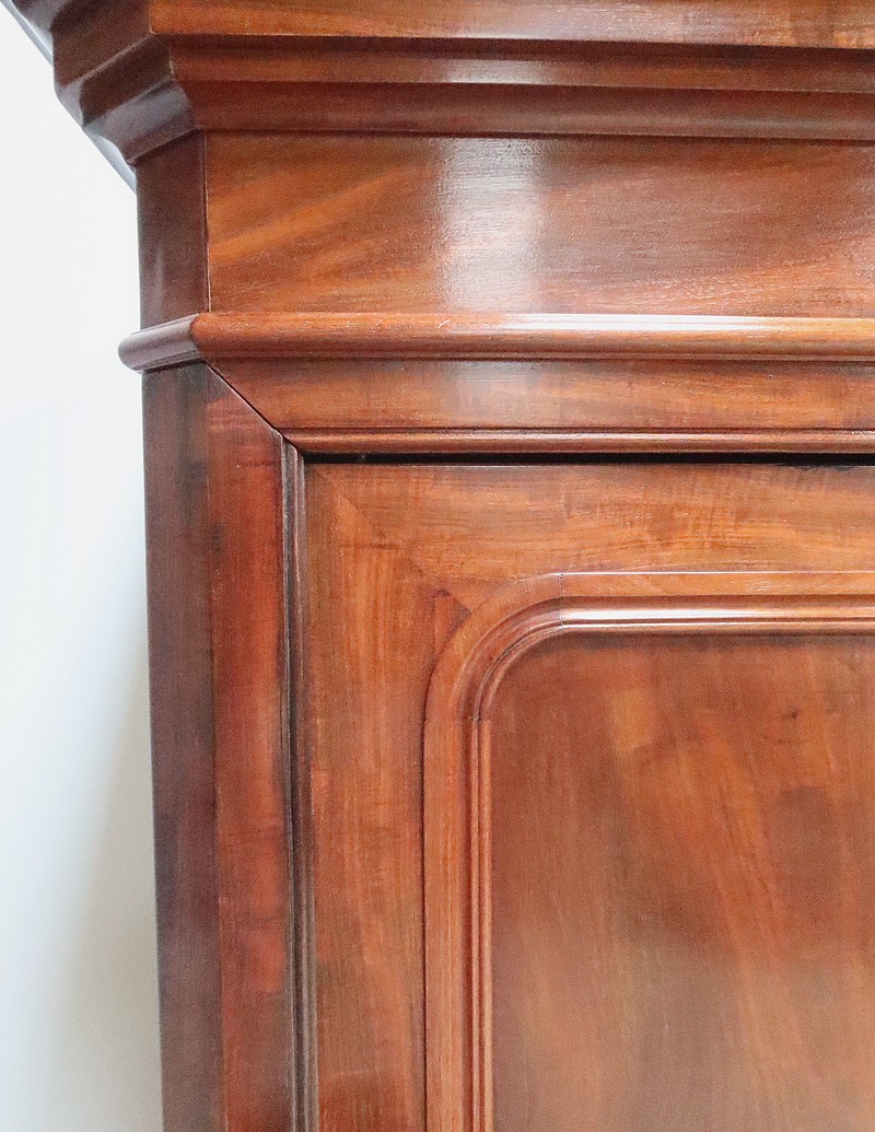 Armoire en Acajou massif et plaqué, ouvrant par 2 portes à cadres moulurés et panneaux aux jolis veinages, façon livres ouverts. Elles sont équipées d’une serrure d’origine en laiton, fonctionnelle, à points d’accroches haut et bas, et accompagnée de sa clé.