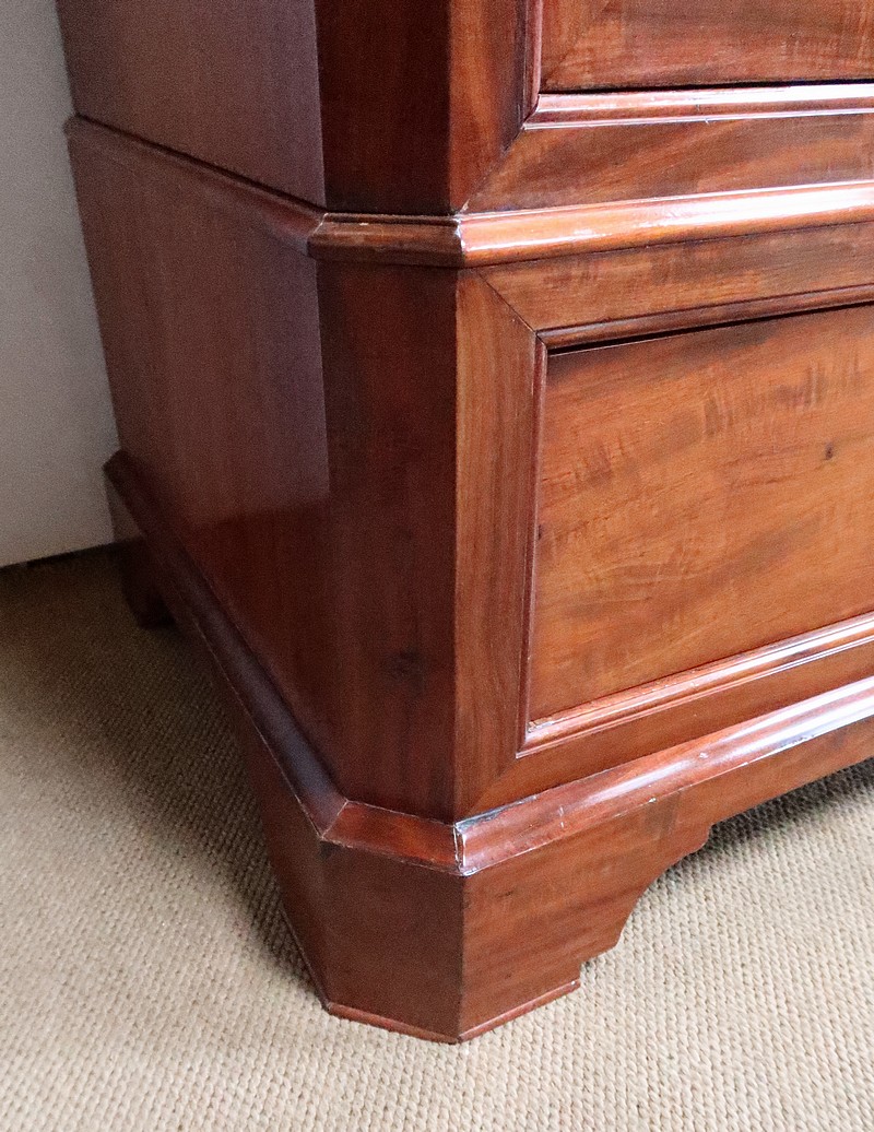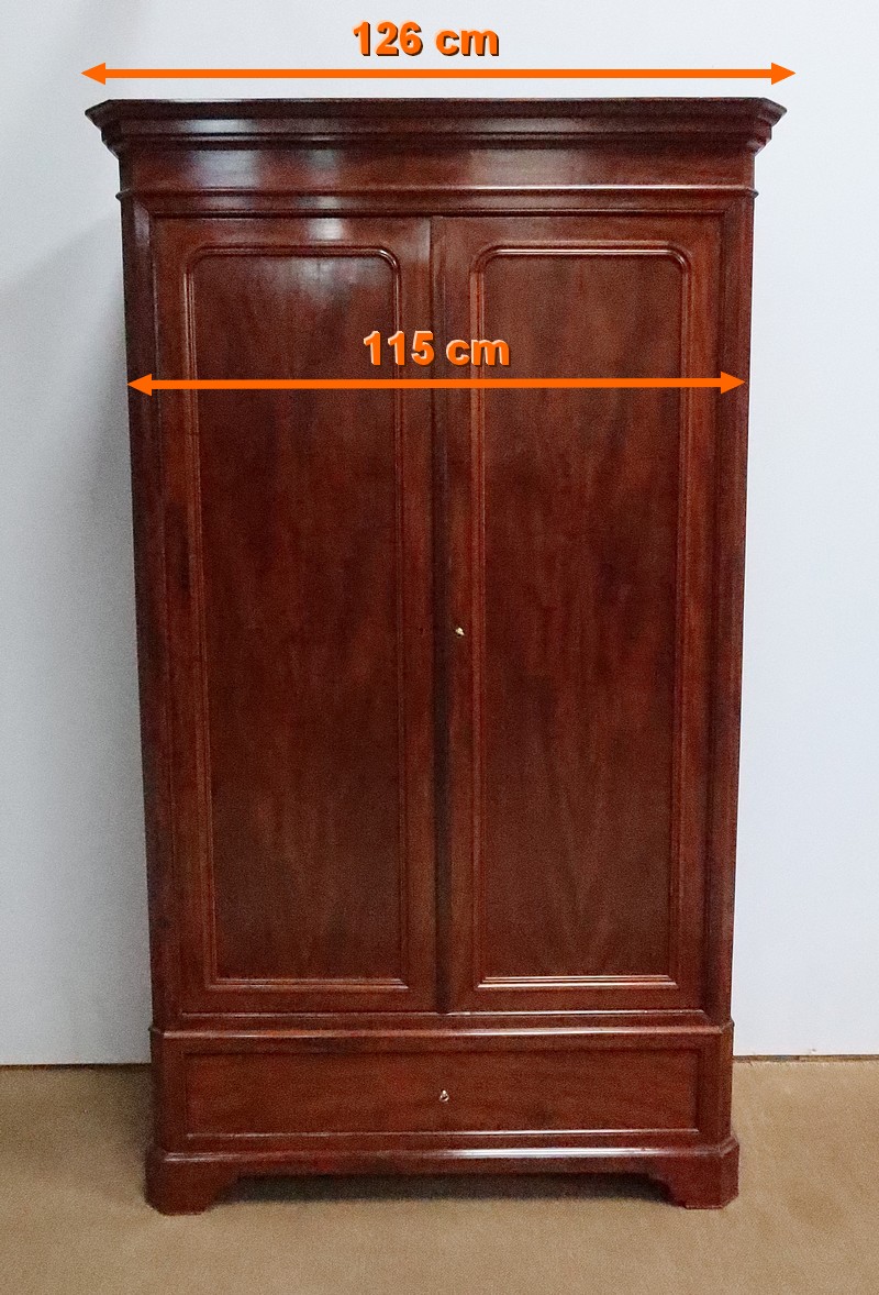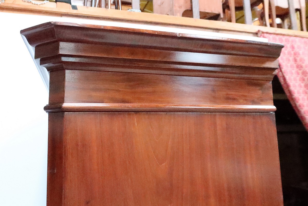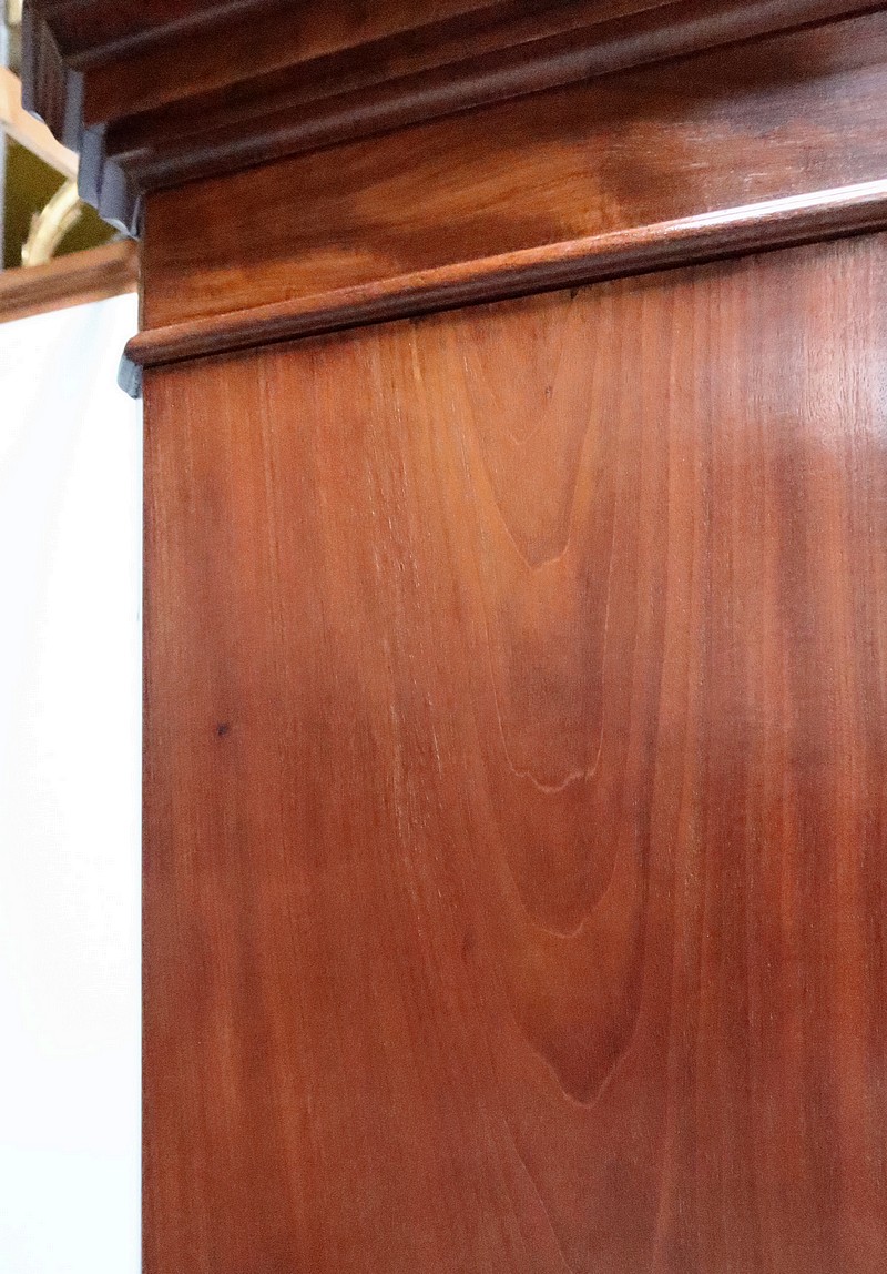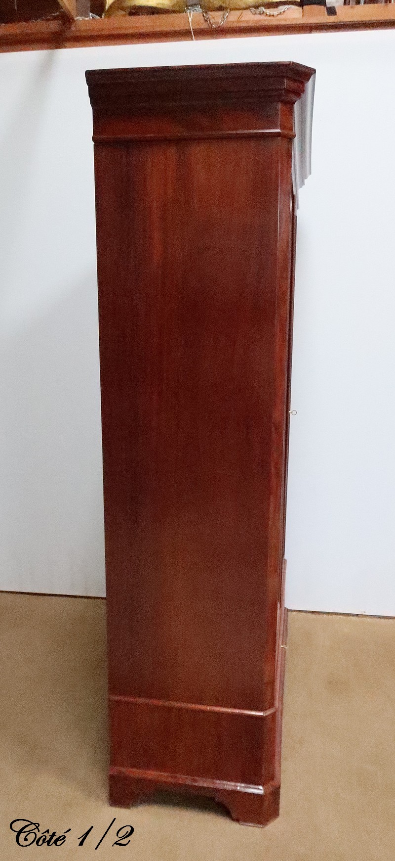 Armoire en Acajou massif et plaqué, ouvrant par 2 portes à cadres moulurés et panneaux aux jolis veinages, façon livres ouverts. Elles sont équipées d’une serrure d’origine en laiton, fonctionnelle, à points d’accroches haut et bas, et accompagnée de sa clé.