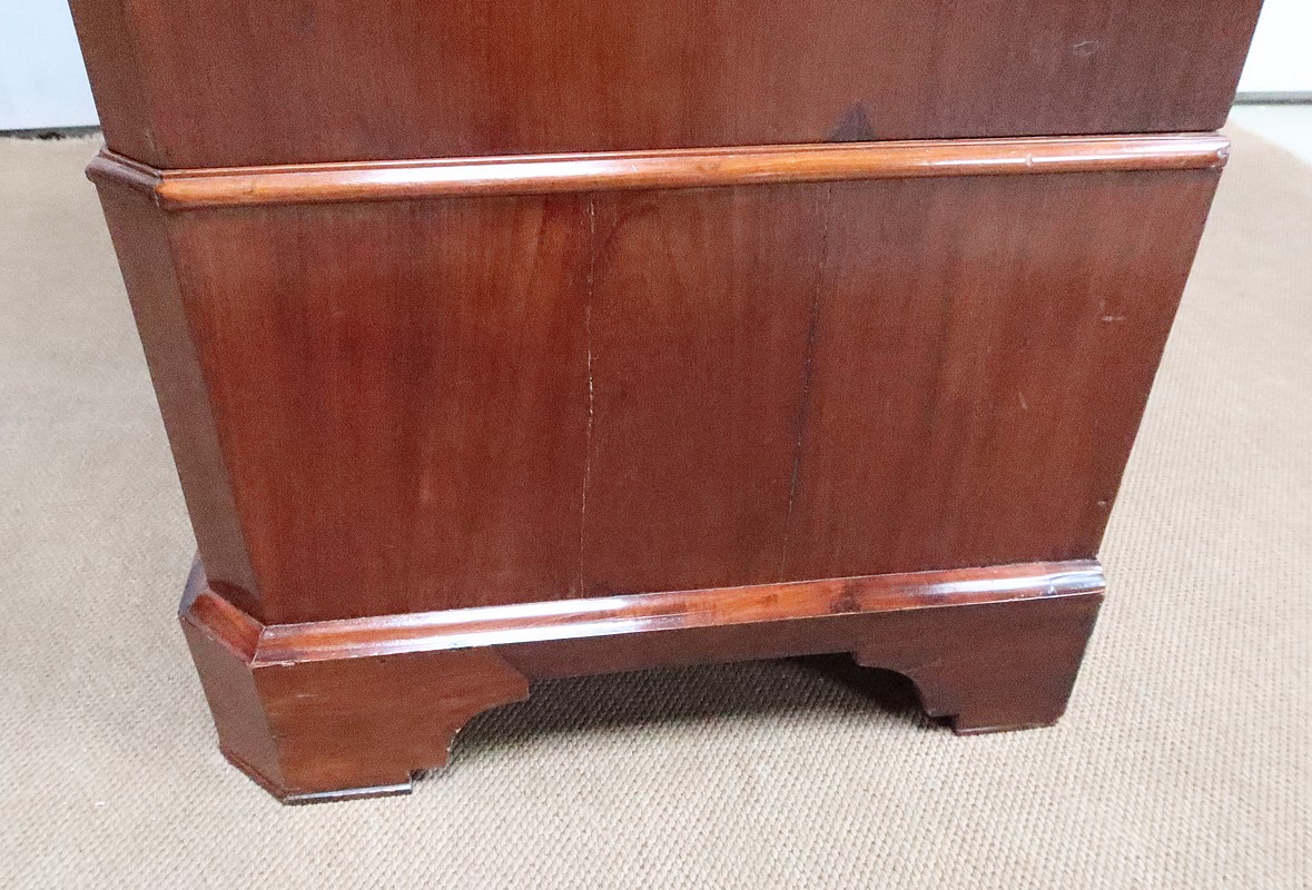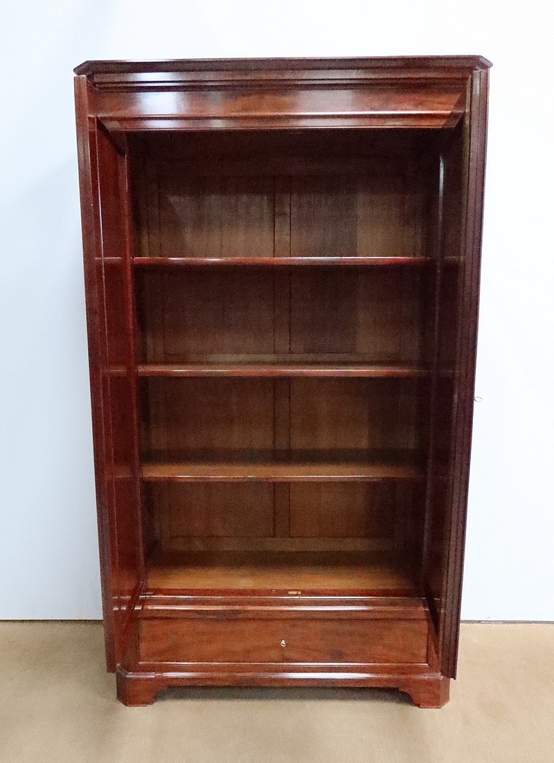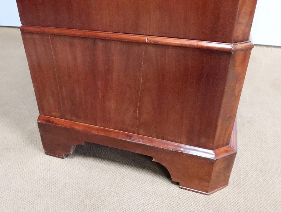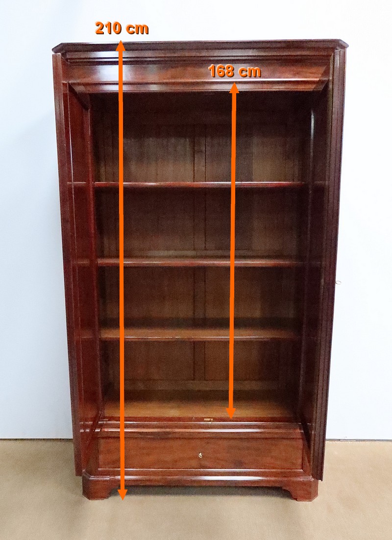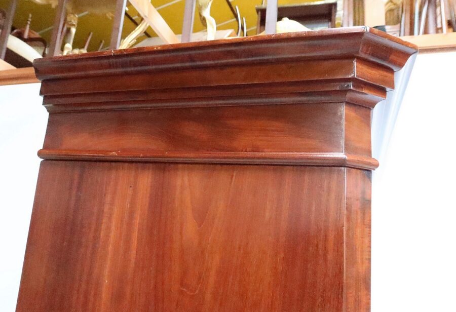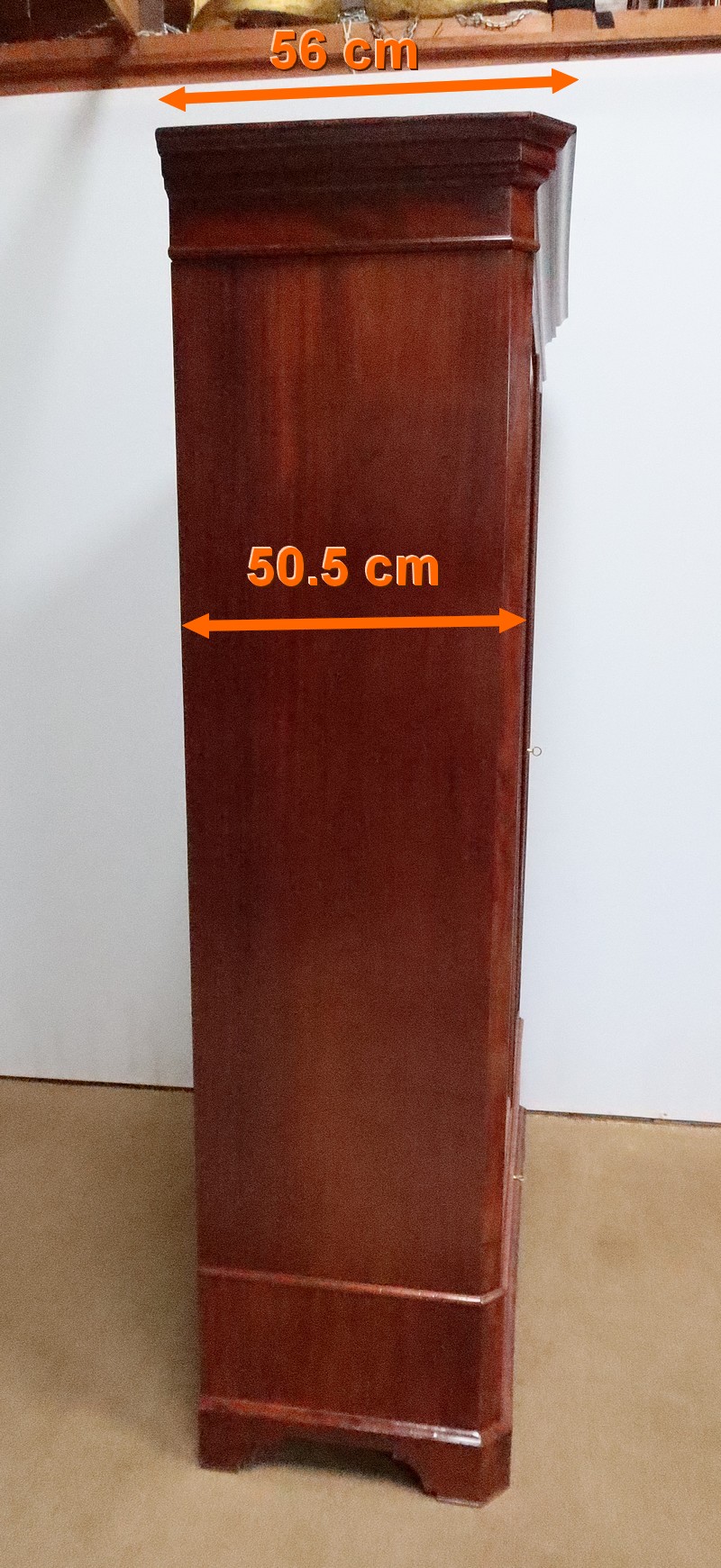 Armoire en Acajou massif et plaqué, ouvrant par 2 portes à cadres moulurés et panneaux aux jolis veinages, façon livres ouverts. Elles sont équipées d’une serrure d’origine en laiton, fonctionnelle, à points d’accroches haut et bas, et accompagnée de sa clé.