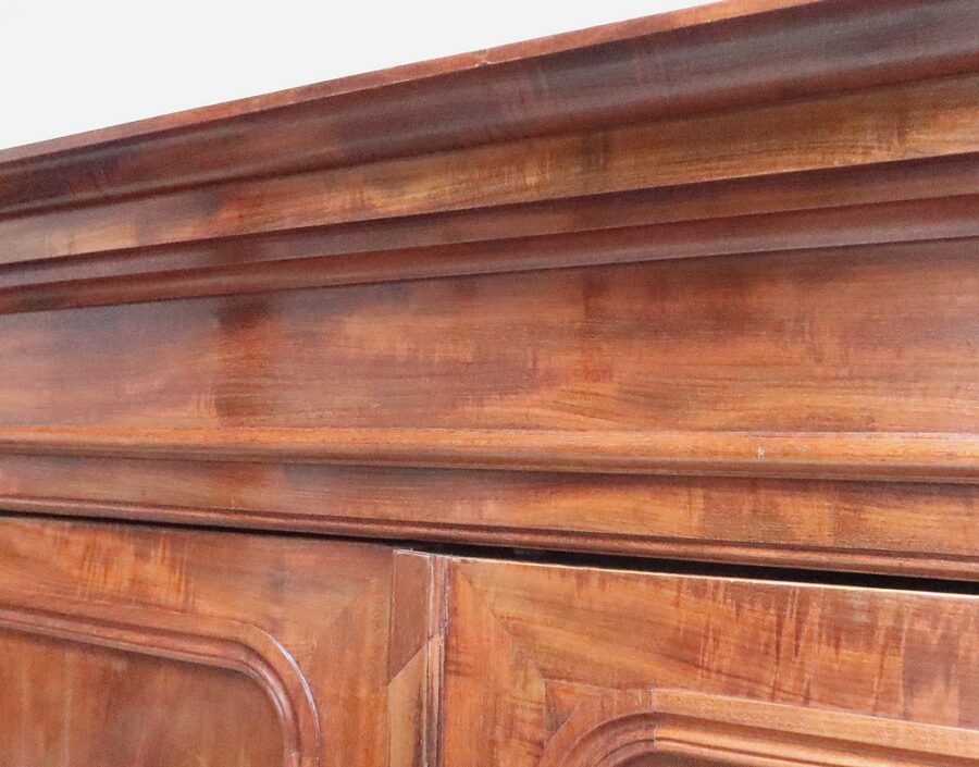 Cette Armoire, aux montants à pans coupés, est sommée d’une généreuse corniche et repose sur 4 pieds découpés.