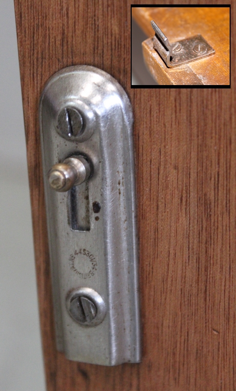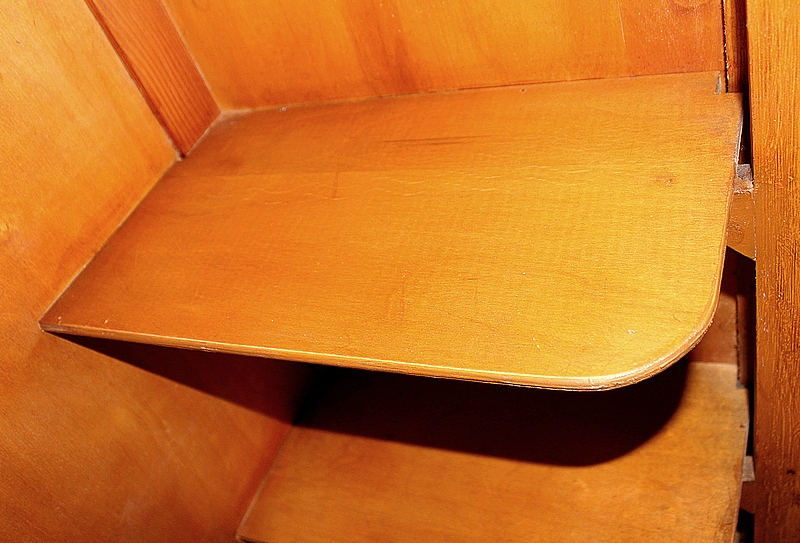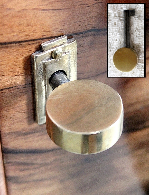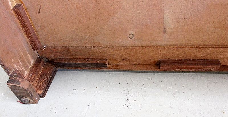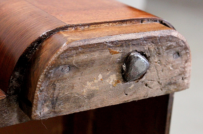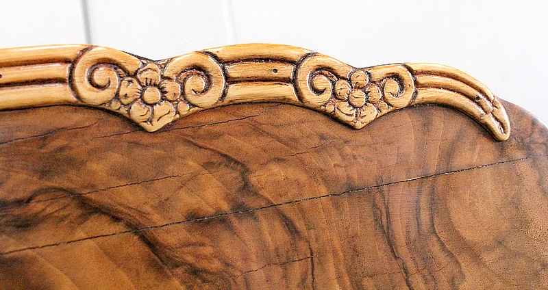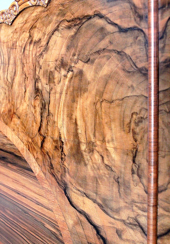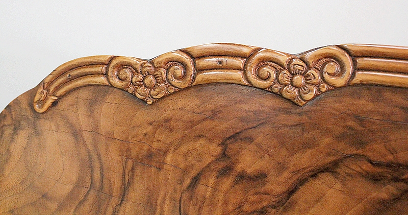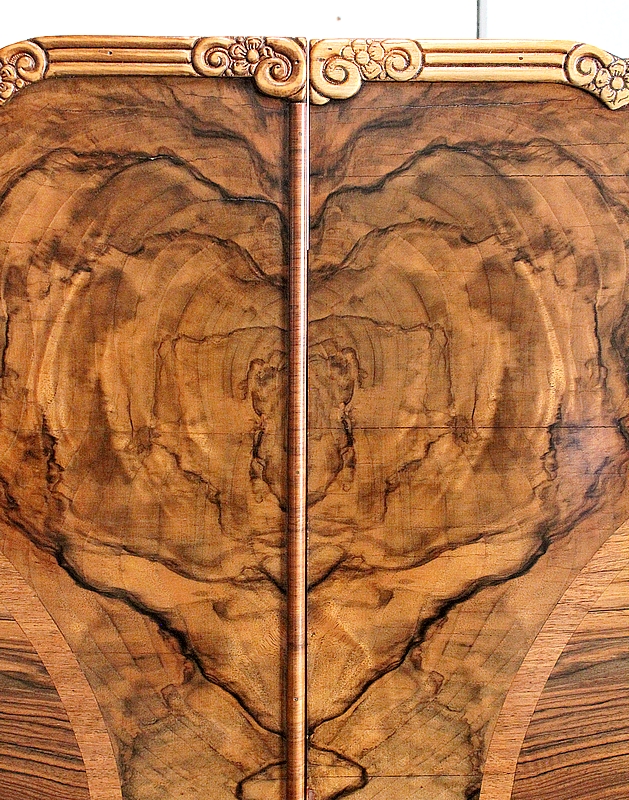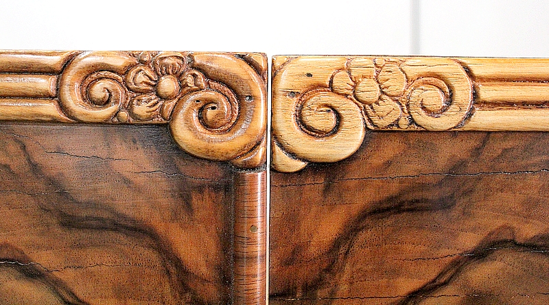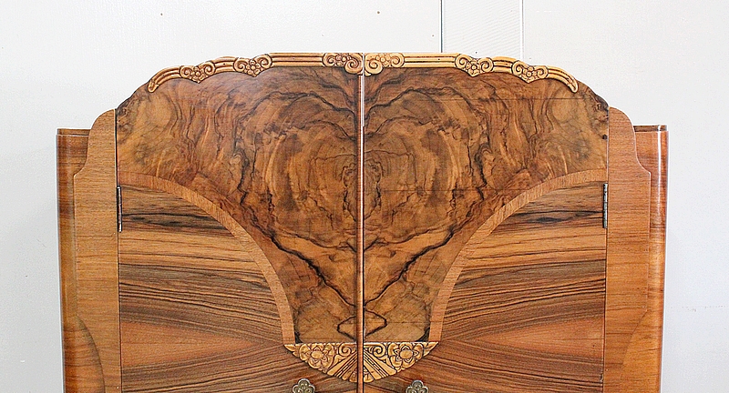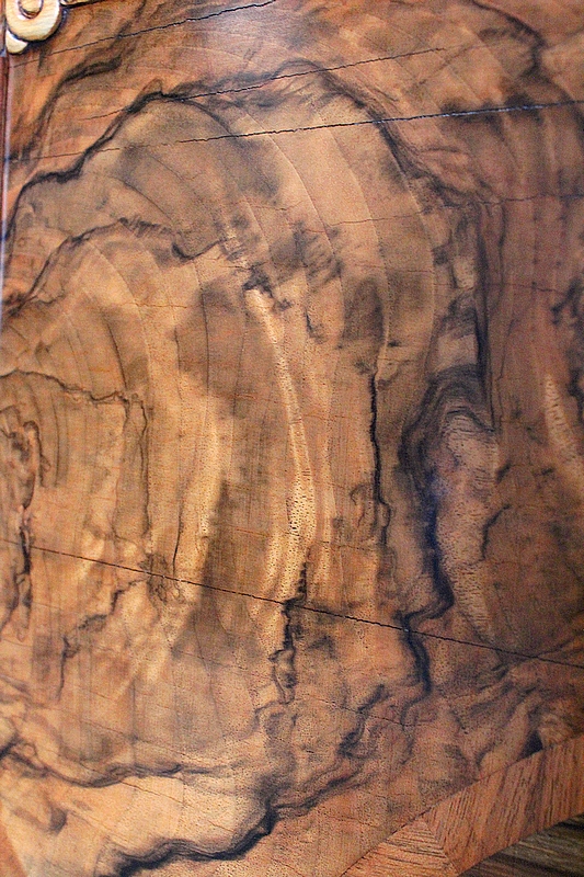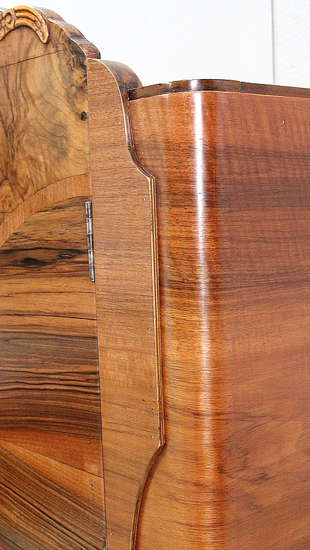 Le Fronton de cette dernière s’habille d’une Jolie bordure Massive, Festonnée et Saillante. Elle souligne un Placage de Ronce de Noyer, dit « Déployé ». Ses contours concaves sont réunis en partie basse par un élément Décoratif similaire à celui décrit précédemment.