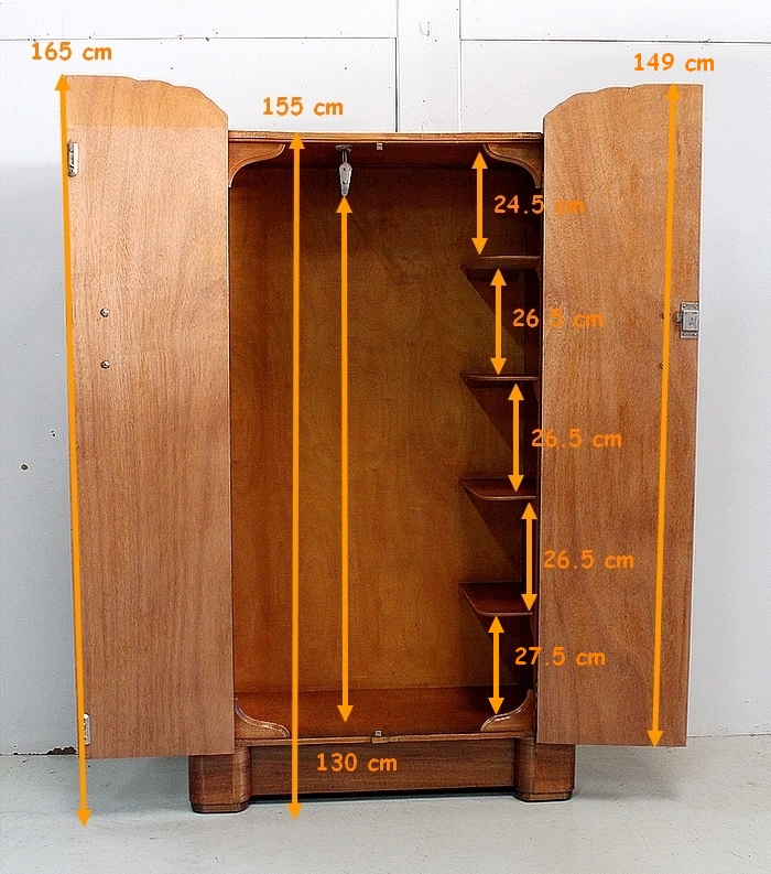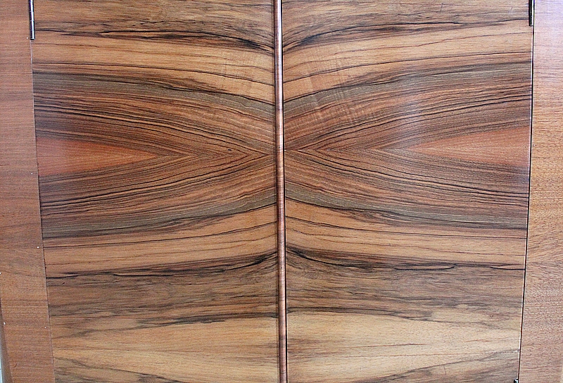 La technique d’Ébénisterie utilisée sur cette Armoire permet une Symétrie visuelle Parfaite dans les dessins du Bois. Elle révèle Remarquablement l’Intensité de ses Teintes Sombres et plus Claires. Ainsi les ouvrants sont embellis d’un Placage de Noyer, Horizontal, que l’on retrouve également sur les Côtés du Meuble.