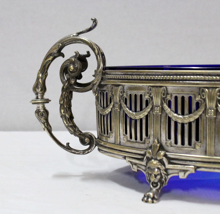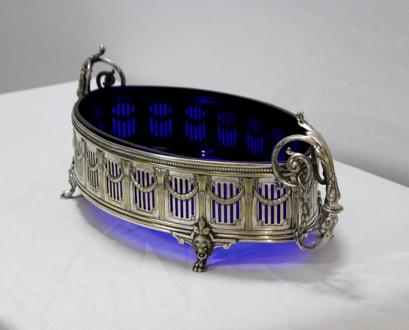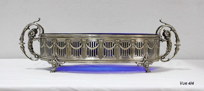 Il est composé dans son pourtour de multiples éléments ajourés comportant des pilastres et des couronnes enrubannées. À chaque extrémité, une poignée très aérée en forme de volutes et de feuilles permet la prise en main de l’objet.