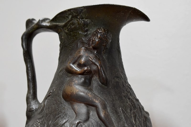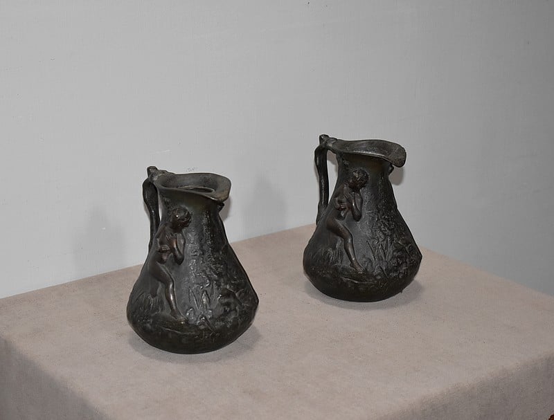 Paire de petits vases pichets en étain vieilli, signés J.G., à décors de femmes se baignant dans une marre, entourées de nature et de canards.
