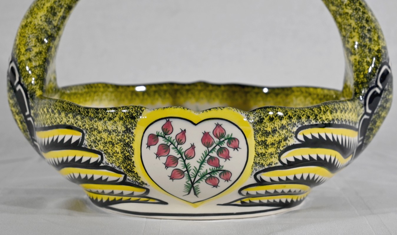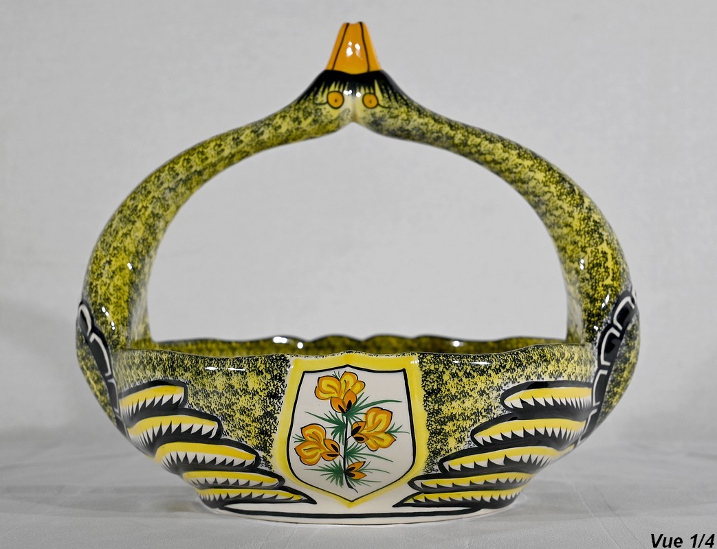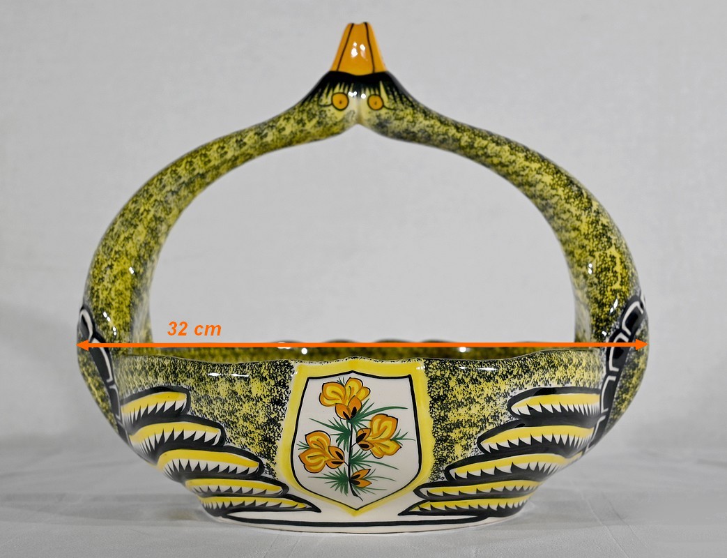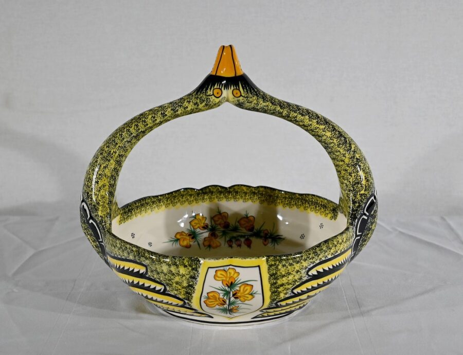 Ce panier est agrémenté d’anses zoomorphiques représentant deux têtes d’oies en plein affrontement. Le corps offre deux cartouches, en forme de cœur et de blason, à décors de gousses et de fleurs de genêt. L’intérieur présente une composition de ces mêmes végétaux.