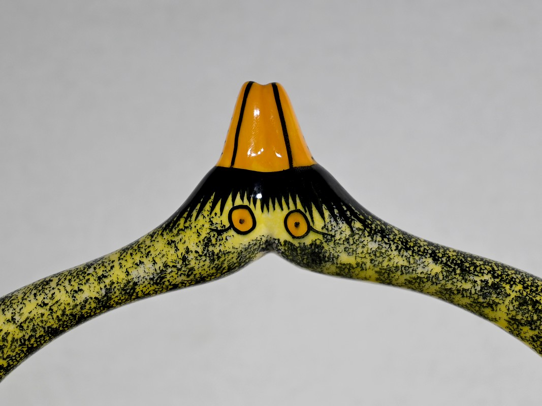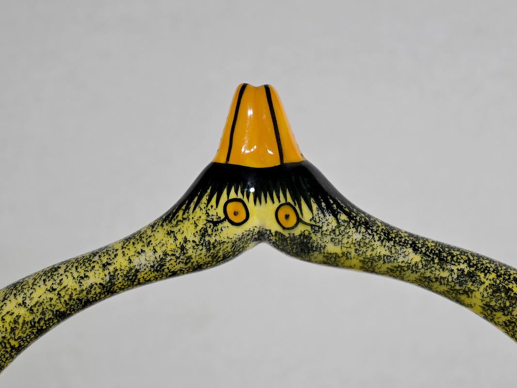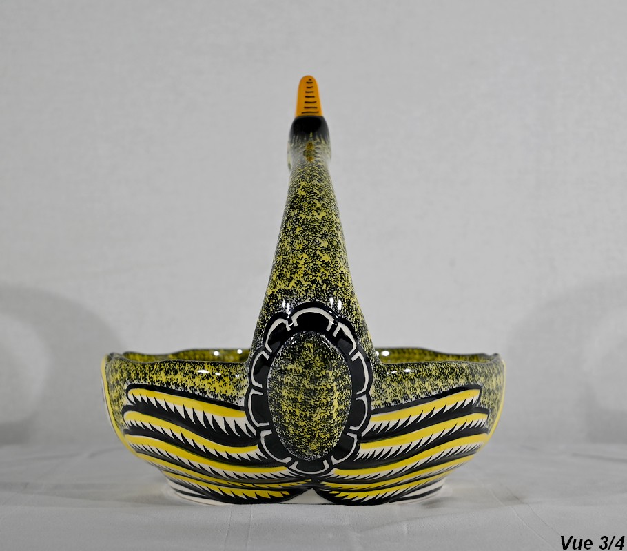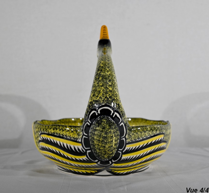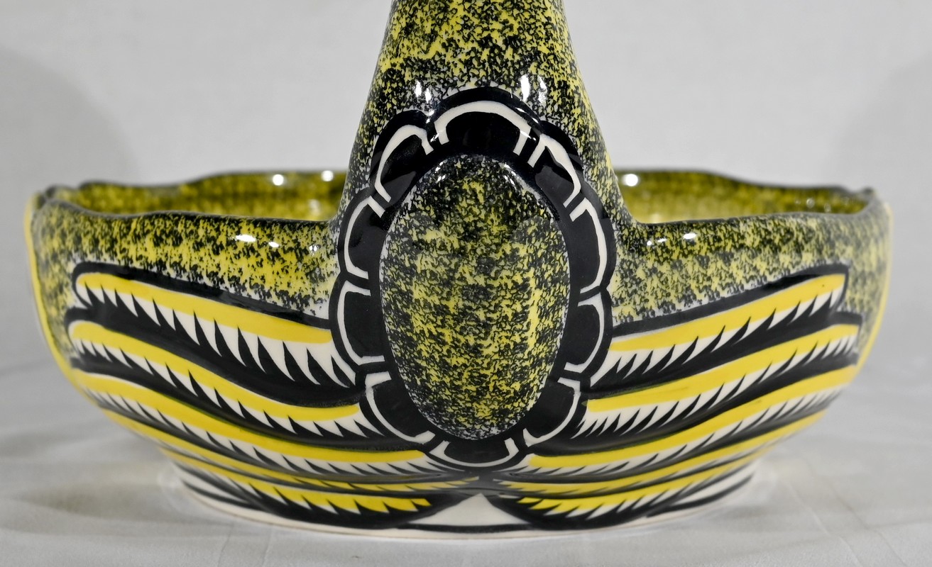 Ce panier est agrémenté d’anses zoomorphiques représentant deux têtes d’oies en plein affrontement. Le corps offre deux cartouches, en forme de cœur et de blason, à décors de gousses et de fleurs de genêt. L’intérieur présente une composition de ces mêmes végétaux.