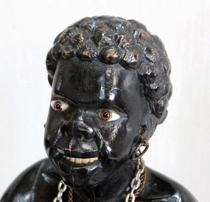 Le visage du Personnage exprime un large Sourire et un regard Vif. À noter que ses yeux ont probablement été recouverts de minutieuses capsules de Verre, de manière à leur donner scintillement, presque existence. Sa peau est Noire Ébène et ses cheveux courts, Bouclés et Crépus, soulignés par quelques mèches plus claires.