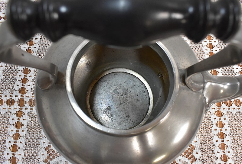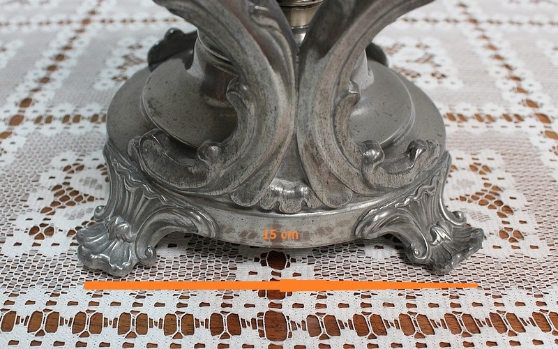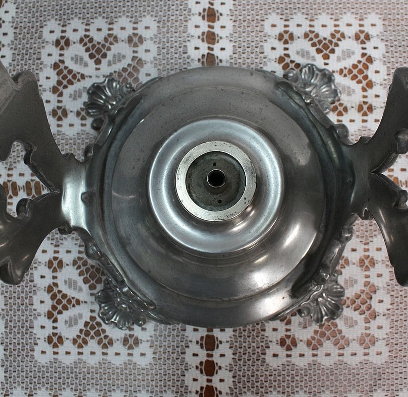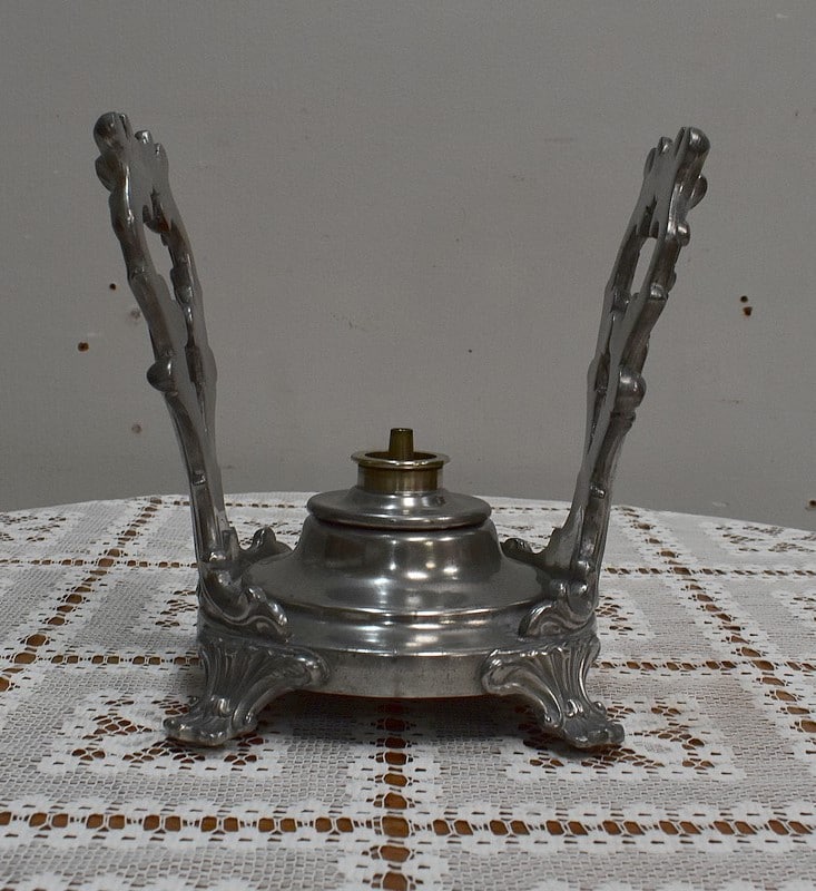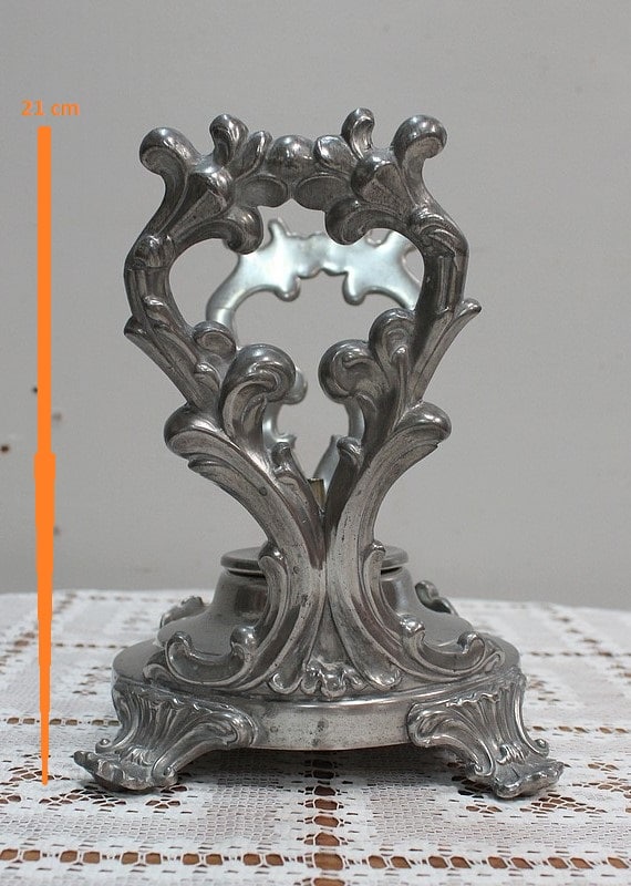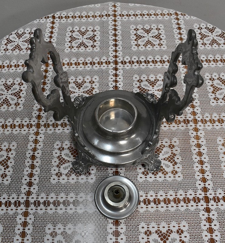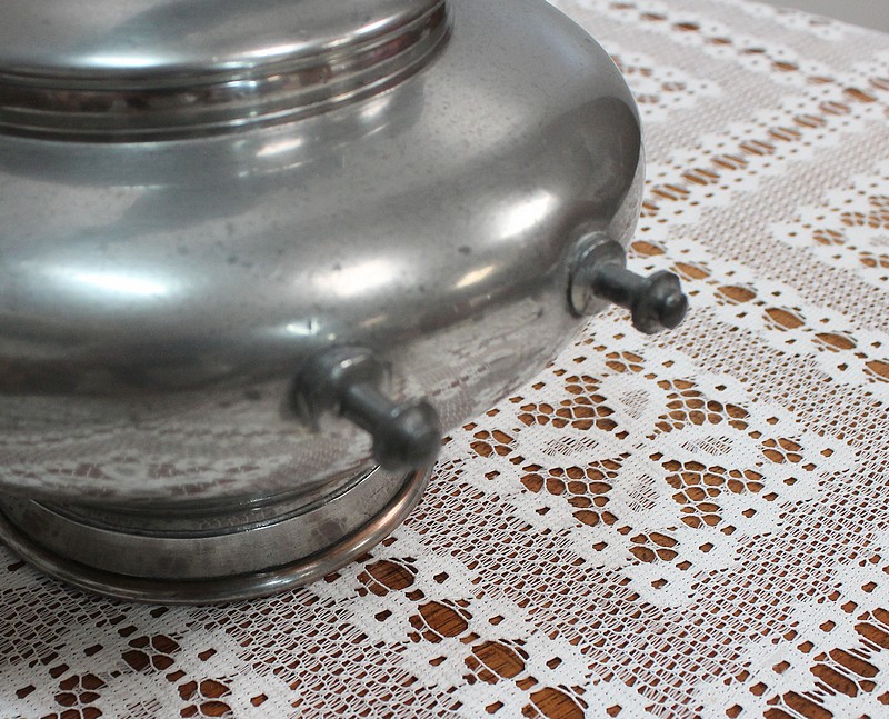 La base, à quatre pieds ciselés, est constituée de deux branches, richement décorées de Volutes. Elle est dotée en son centre d’un réceptacle, qui pourra devenir une Petite Lampe une fois rempli d’alcool et garni d’une mèche. Ainsi devenu réchaud, ce 1er élément qui constitue ce Samovar servira de support au 2nd, un récipient d’une capacité d’environ 1.5 litres. Il ouvre par un couvercle surmonté d’un bouton en bois noirci, tout comme la généreuse poignée située au dessus. Cette partie Théière, plutôt Sobre, arbore toutefois un bec verseur sculpté. On notera qu’une grille est placée à la base de ce dernier afin d’empêcher les feuilles de Thé de passer dans la tasse lors du service.