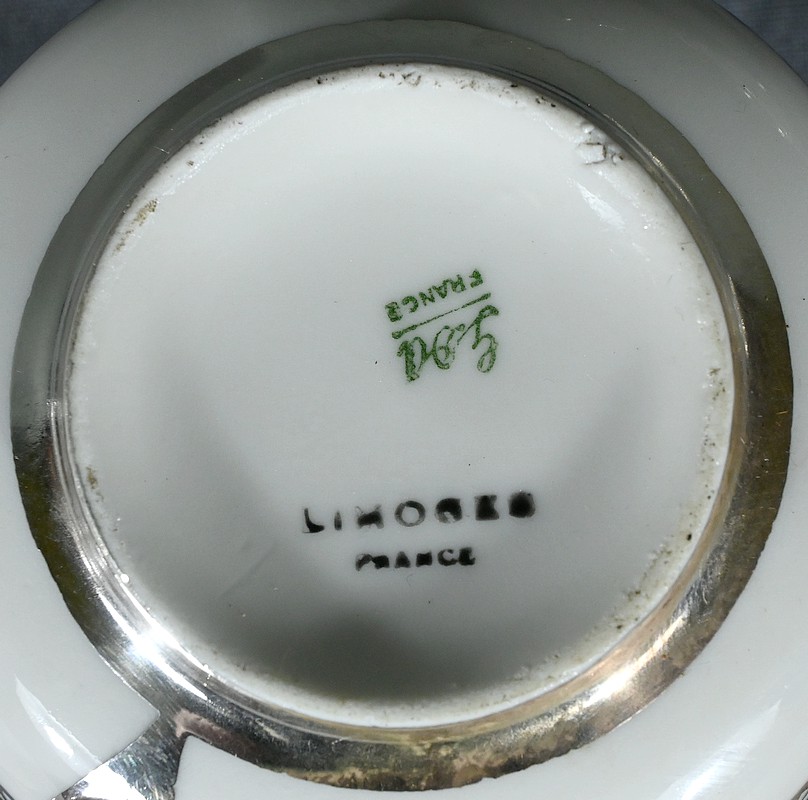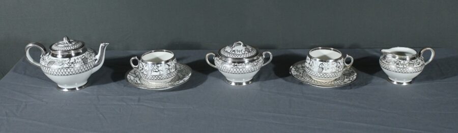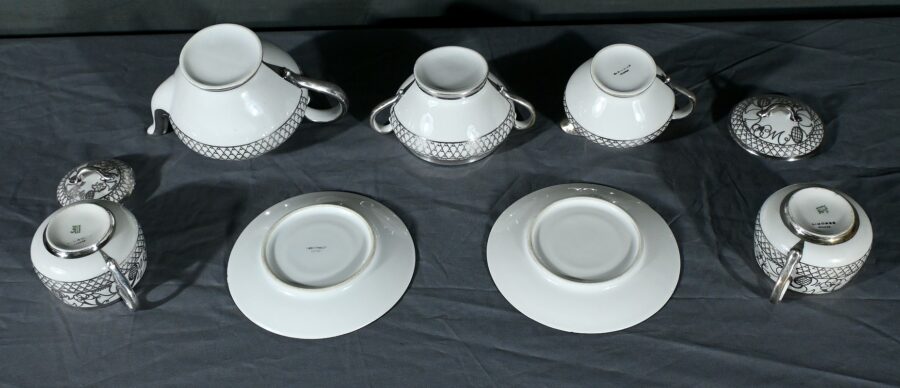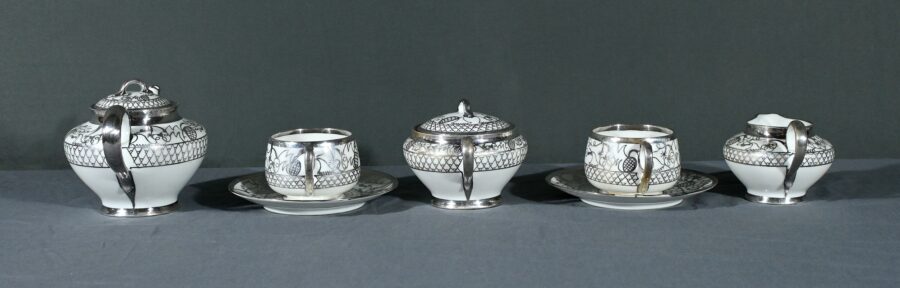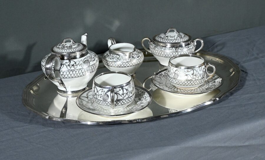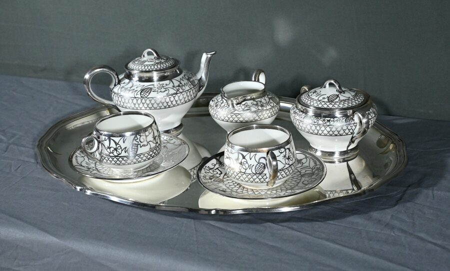 Service Tête-à-tête pour le thé ou le café en porcelaine émaillée issue de la manufacture de Limoges. Il s’agit du modèle Saint Graal à décor argenté de frises losangées et géométriques, accompagnées d’arabesques. Ce service comprend une verseuse, un sucrier, un pot à lait, deux tasses et sous-tasse et un plateau en métal argenté. Nous retrouvons l’estampille « LIMOGES France » sous plusieurs pièces. L’ensemble est en très bel état.
