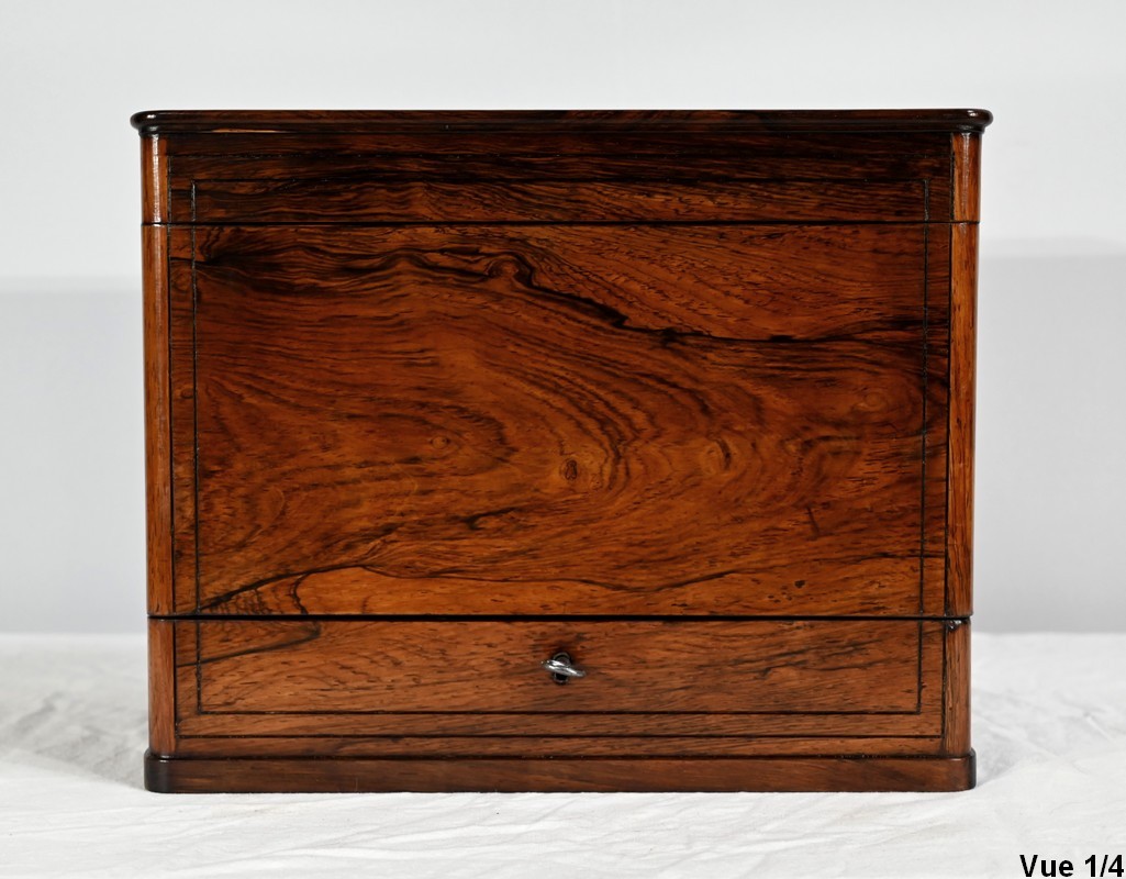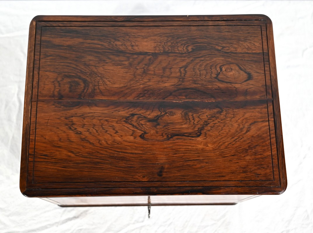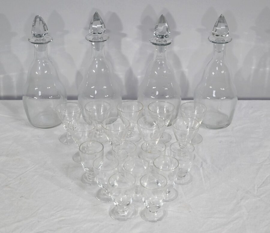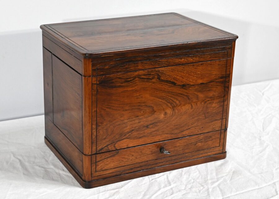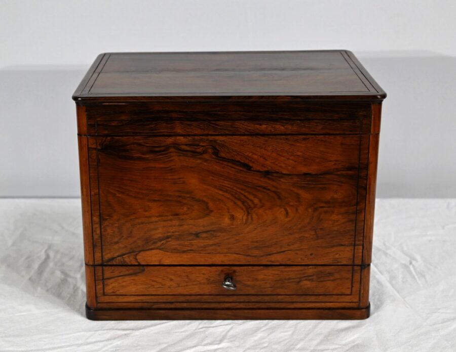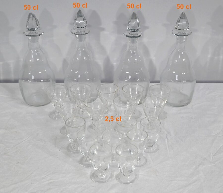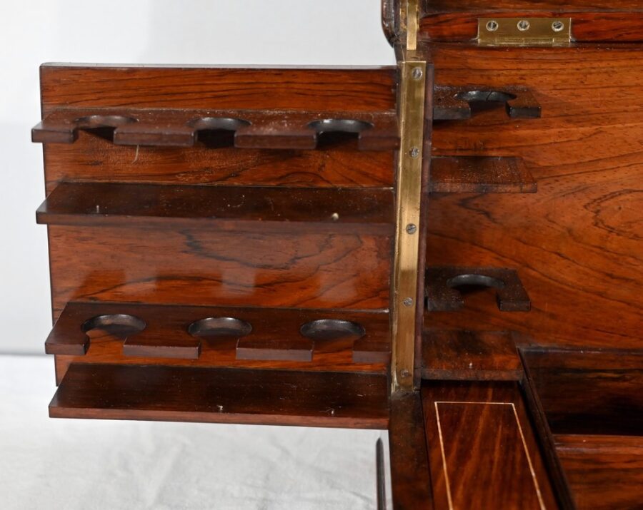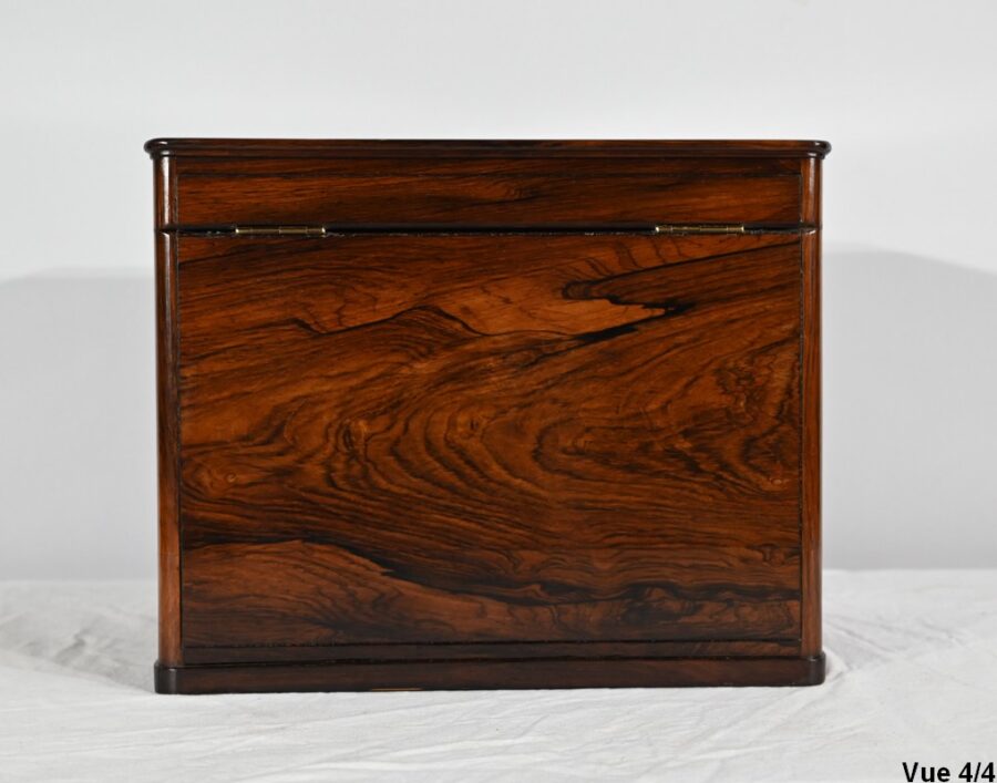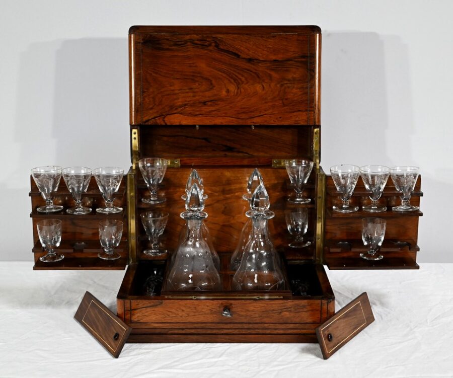 L’intérieur propose un nécessaire de dégustation composé de quatre bouteilles en verre blanc, d’une contenance de 50 centilitres, et dix-huit verres de 2,5 centilitres. La base offre également deux réserves latérales dont les couvercles sont marquetés de filets de citronnier.
