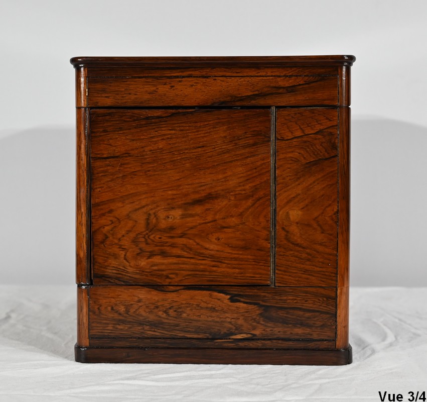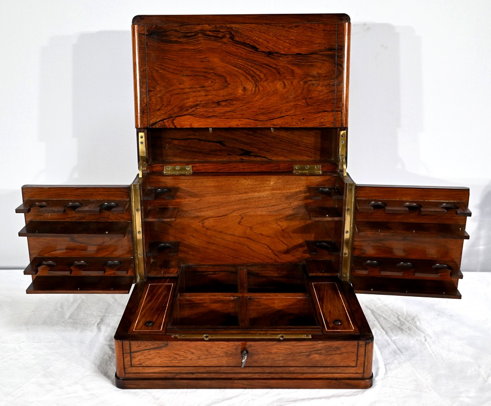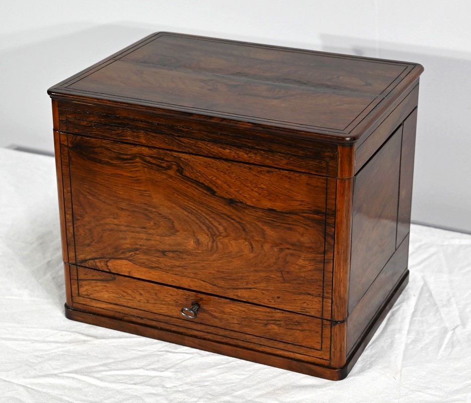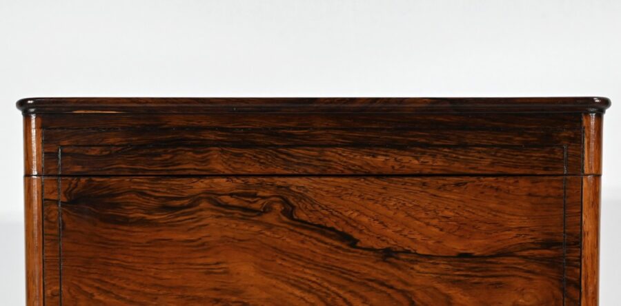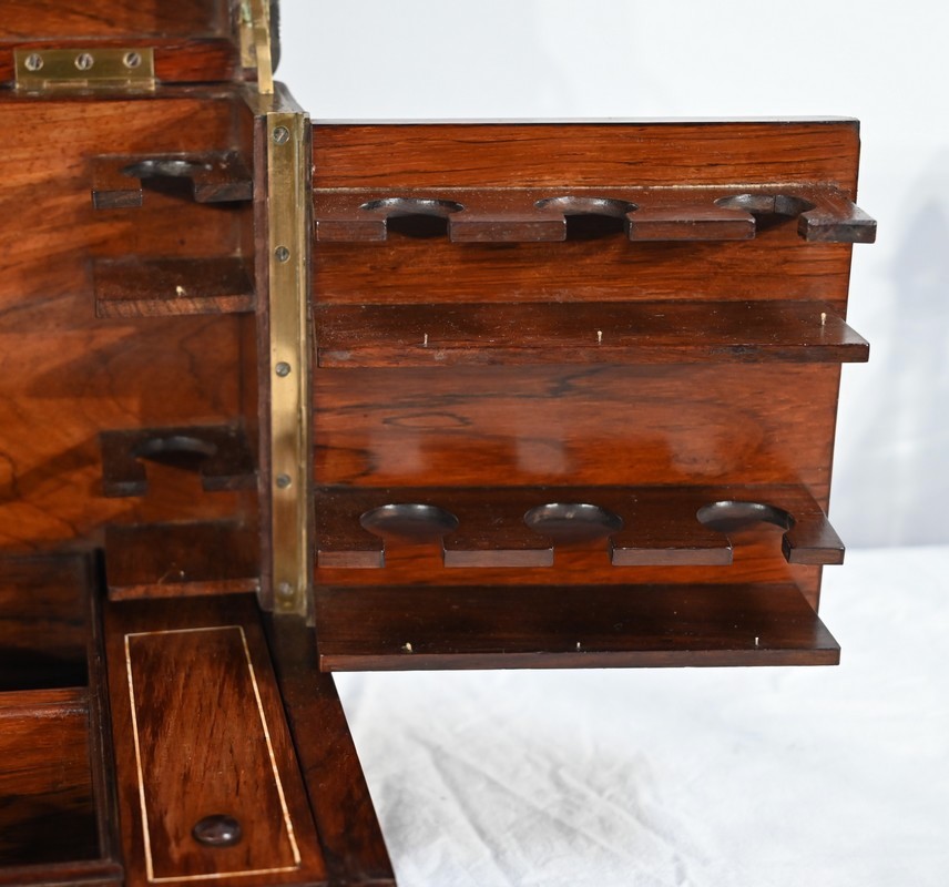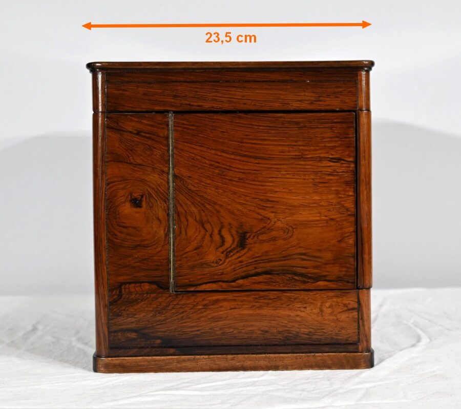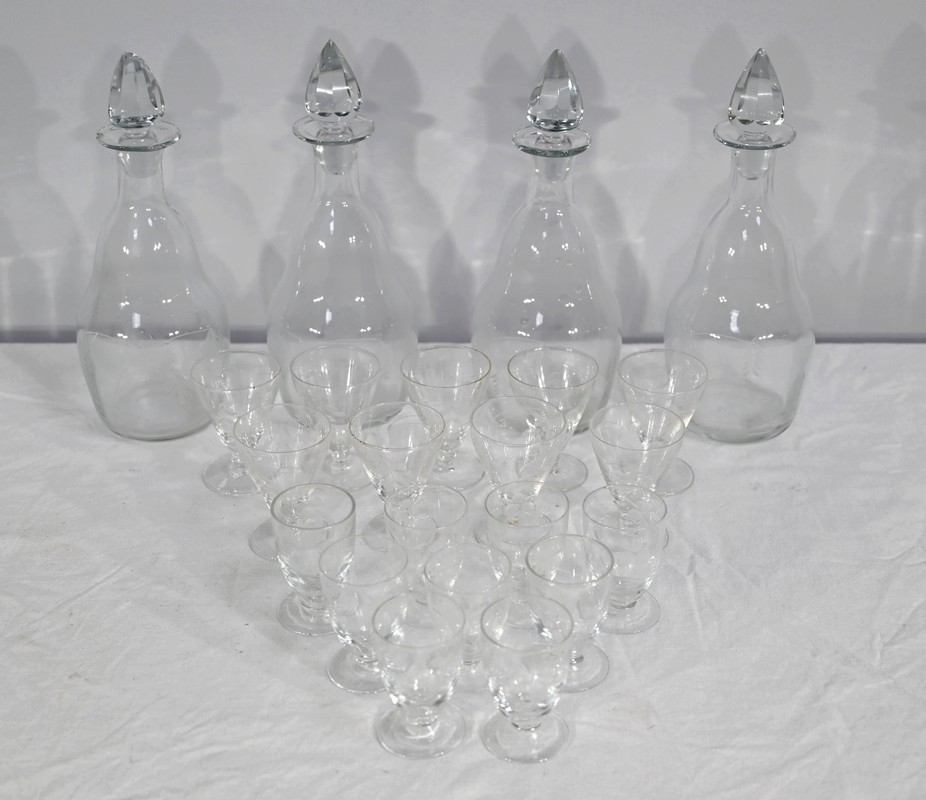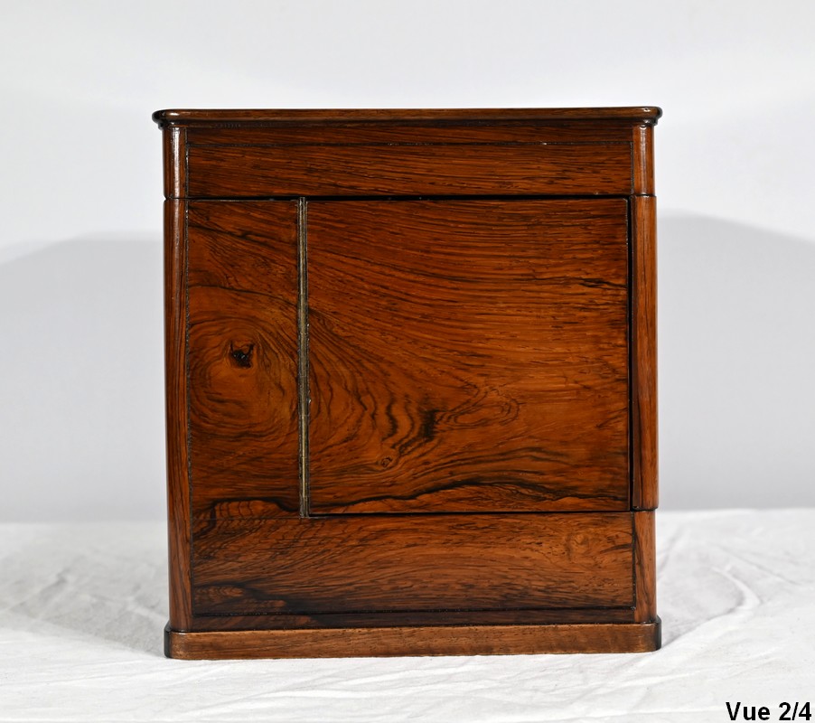 L’intérieur propose un nécessaire de dégustation composé de quatre bouteilles en verre blanc, d’une contenance de 50 centilitres, et dix-huit verres de 2,5 centilitres. La base offre également deux réserves latérales dont les couvercles sont marquetés de filets de citronnier.