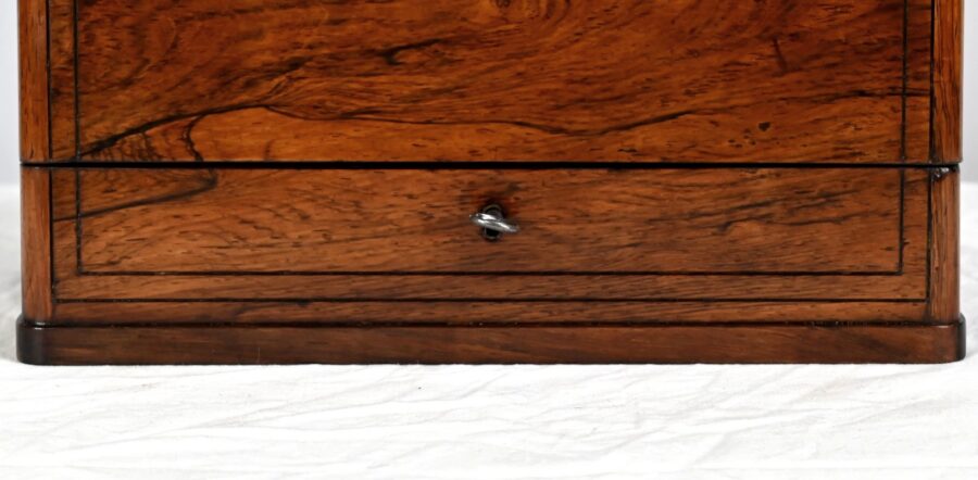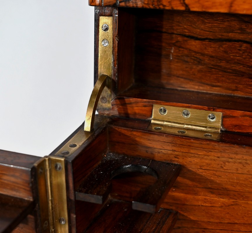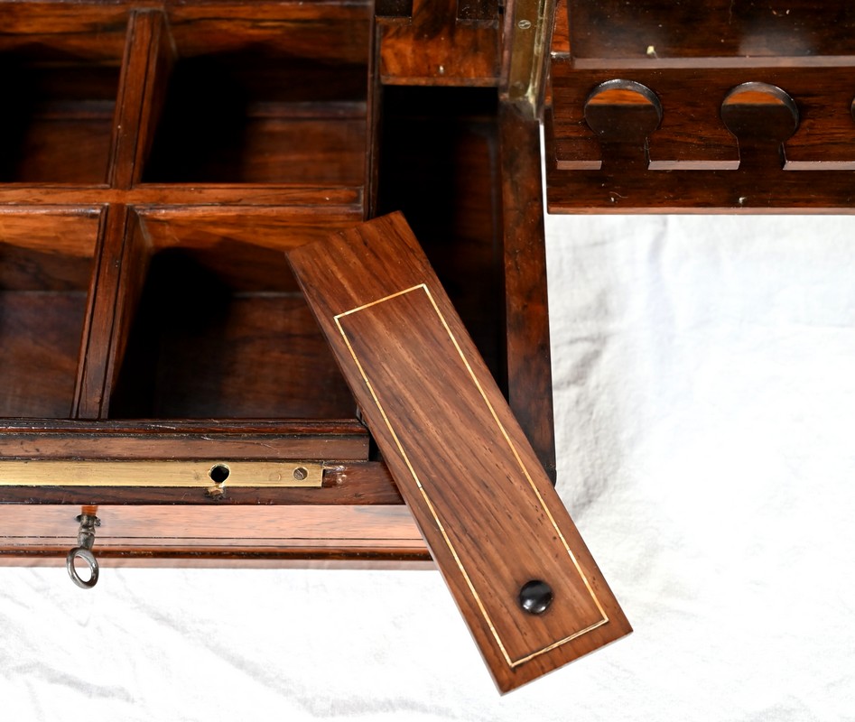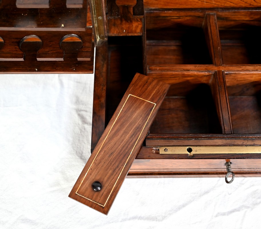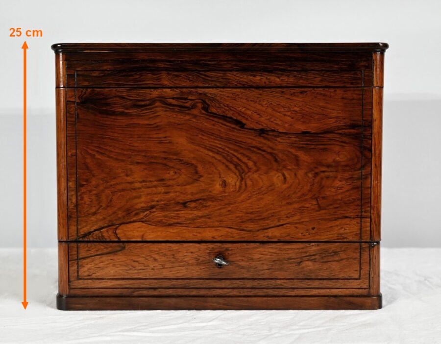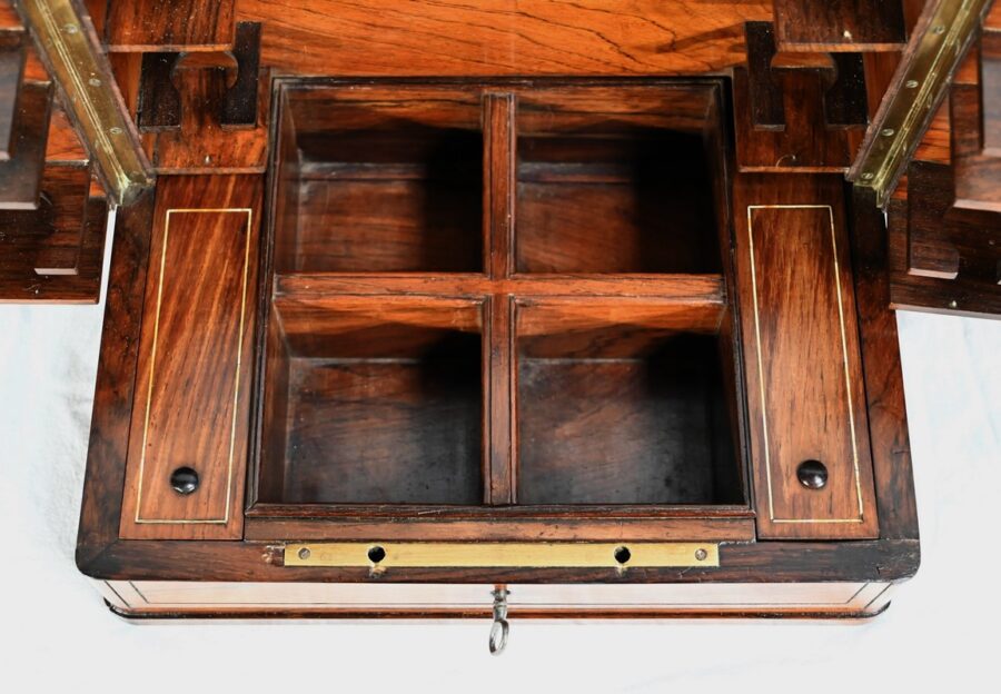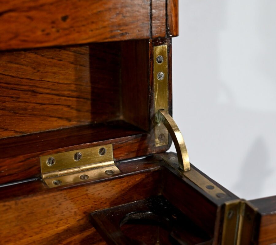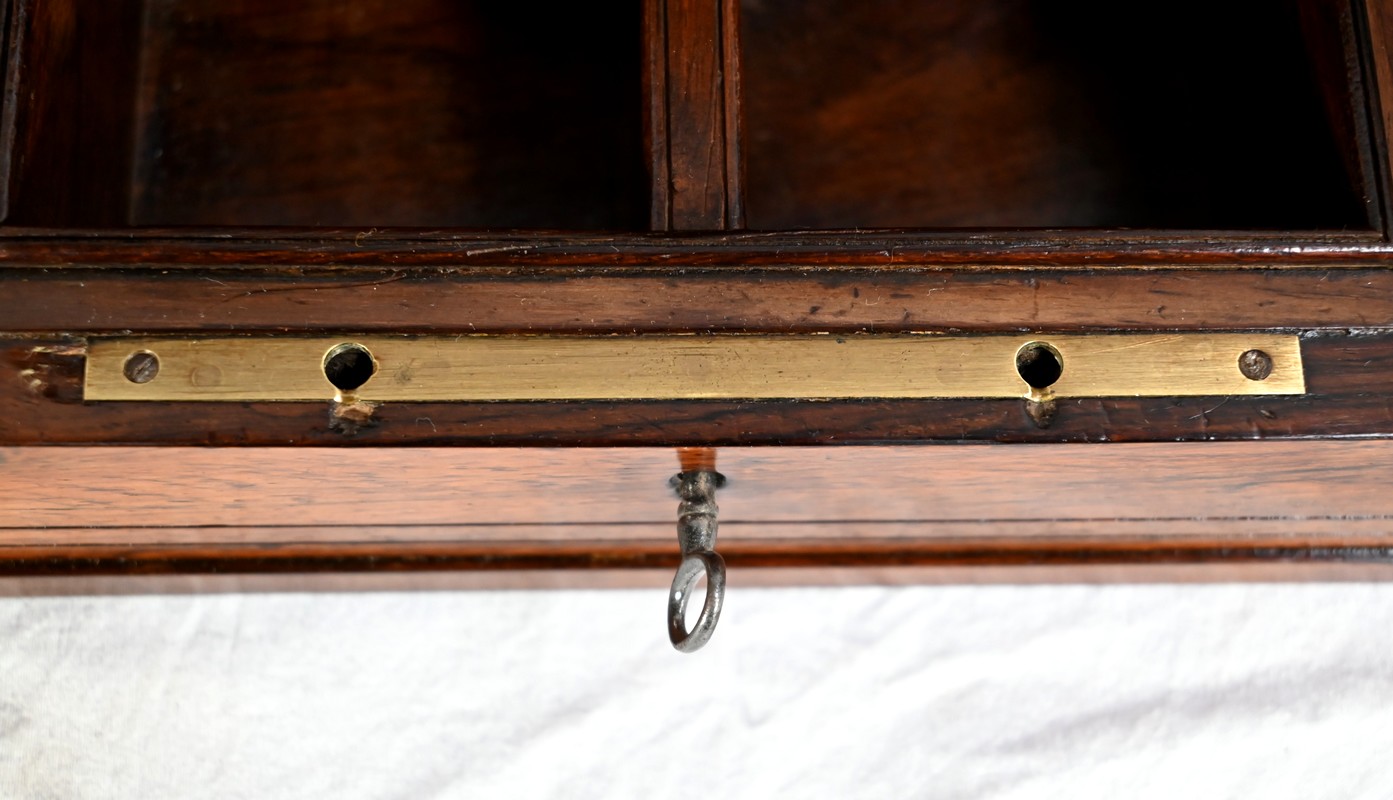 Elle s’ouvre à l’aide d’une serrure fonctionnelle d’origine avec clé. La façade et le dessus, montés sur compas laiton, se relèvent. Les côtés, munis de charnières, se déplient.