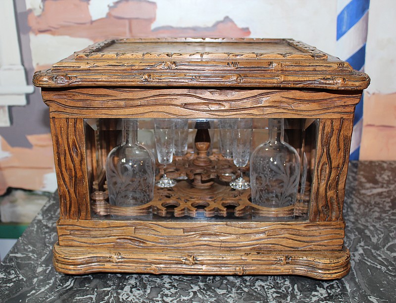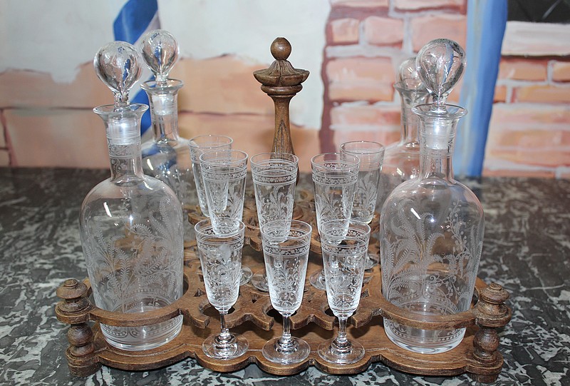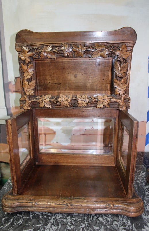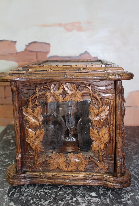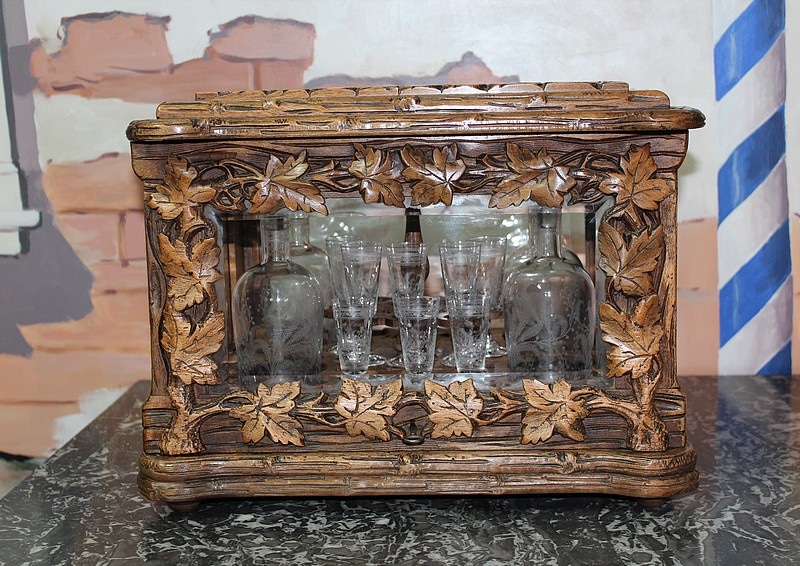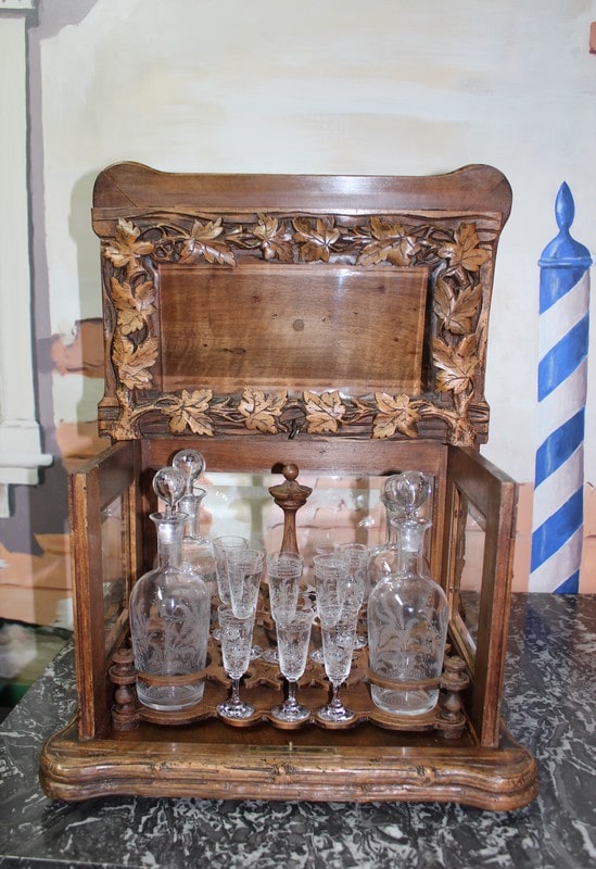 Cave à liqueurs en noyer sculpté de feuilles de vigne. Ses 4 faces sont en verre biseauté et elle est garnie de 4 carafes et 8 petits verres à pied à décor de fougères et de feuilles. (Manque 8 verres et 1 bouchon de carafe cassé).
