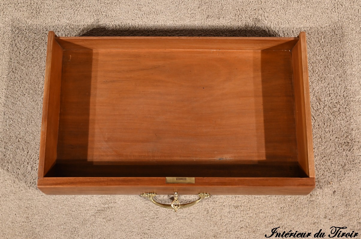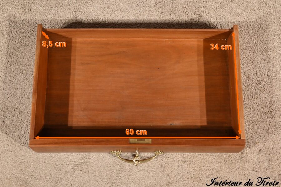 La partie inférieure ouvre par un tiroir avec serrure authentique, entrée filet et poignée en bronze, à décors de fleurs, caractéristique de la maison Diot.