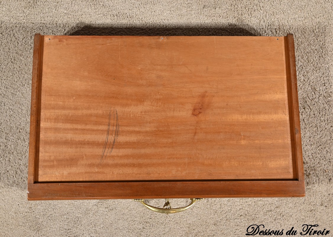En dessous, ce meuble ouvre également par un abattant avec panneau central à défoncement équipé d’une serrure fonctionnelle par ailleurs d’origine.