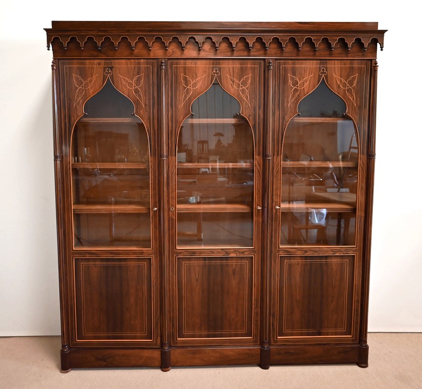 Le vitrage, de forme dite « à cathédrale », est mouvementé dans la partie haute, et entouré de filets et d’une fine baguette de Citronnier.