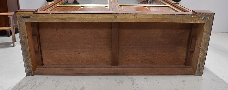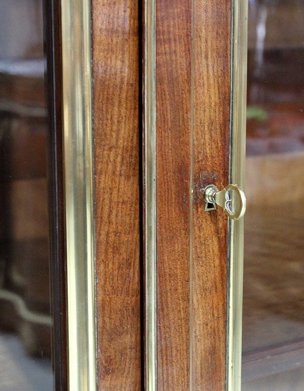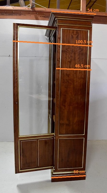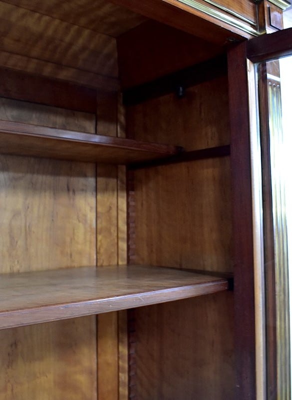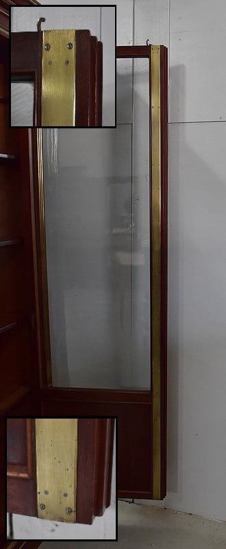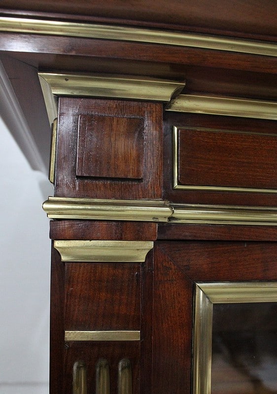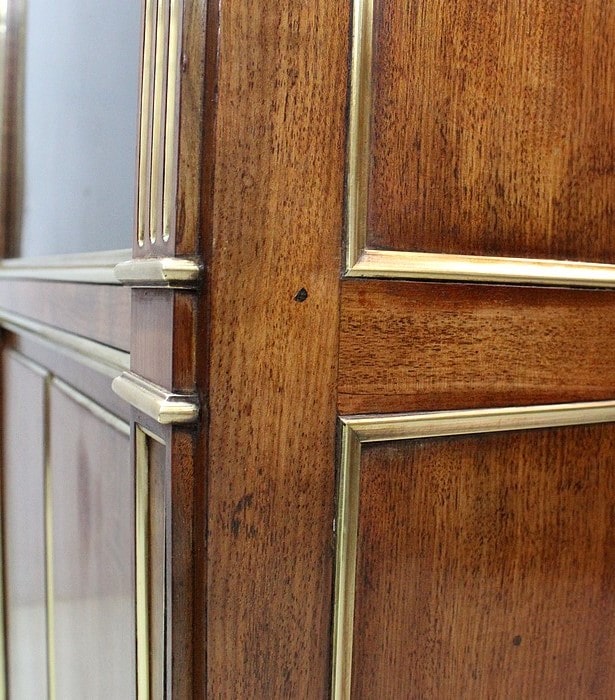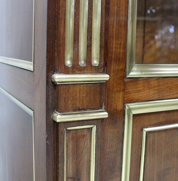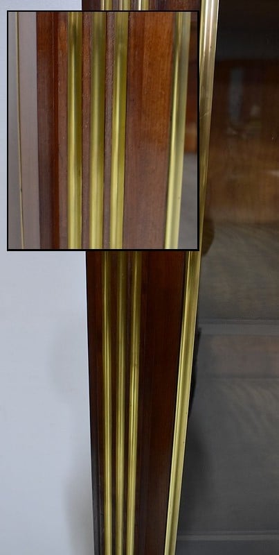 Les montants en Pilastres de cette Vitrine sont à défoncement en partie basse et agrémentés de deux fois trois cannelures sur le reste de leur hauteur, là encore garnies de laiton.