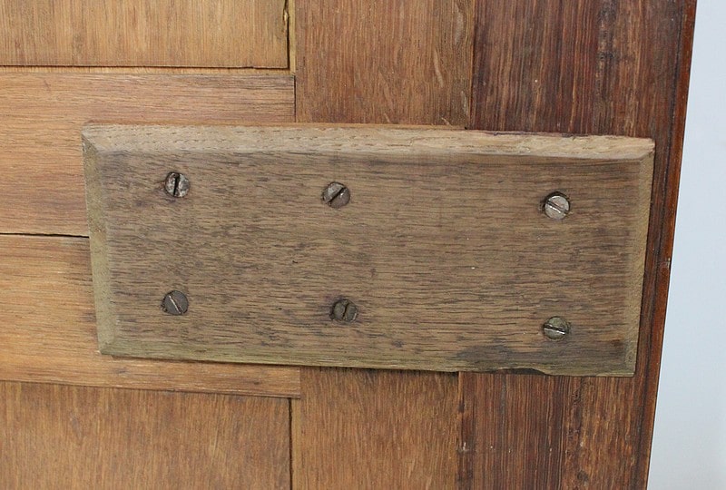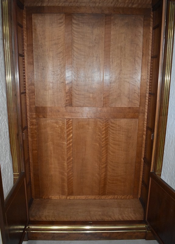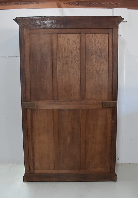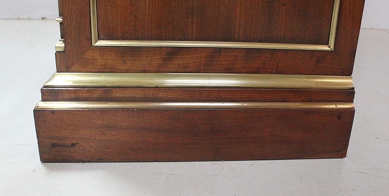 Elle ouvre par deux portes constituées, sur les 3/4 de leurs surfaces, de vitres soulignées par des baguettes en laiton à Doucine formant encadrements. Des ornements identiques délimitent les deux parties pleines de ces portes qui sont chacune surmontée de deux panneaux rectangulaires saillants. Ces derniers sont bordés de baguettes laiton en quart de rond.
