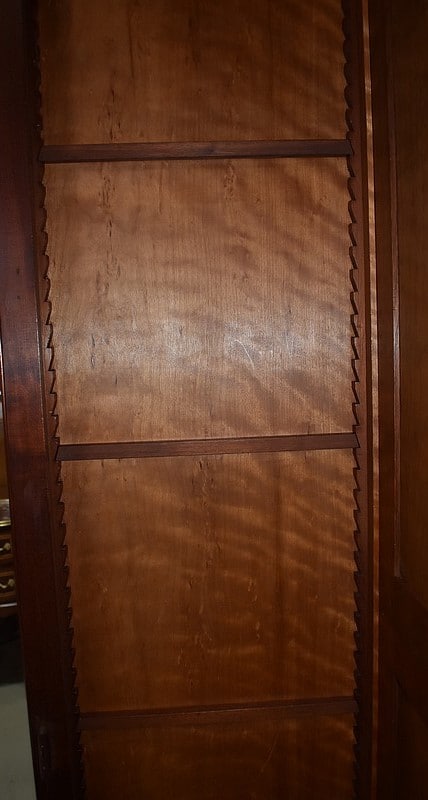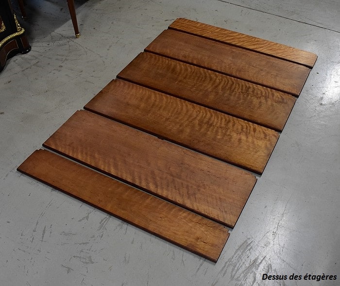 L’intérieur, en Placage d’Érable, offre quatre étagères de 37 cm de profondeur, ainsi que deux plus étroites. Leurs chants moulurés sont en Acajou et toutes sont posées sur crémaillères et donc réglables à souhait sur une hauteur totale de rangement de 228 cm.