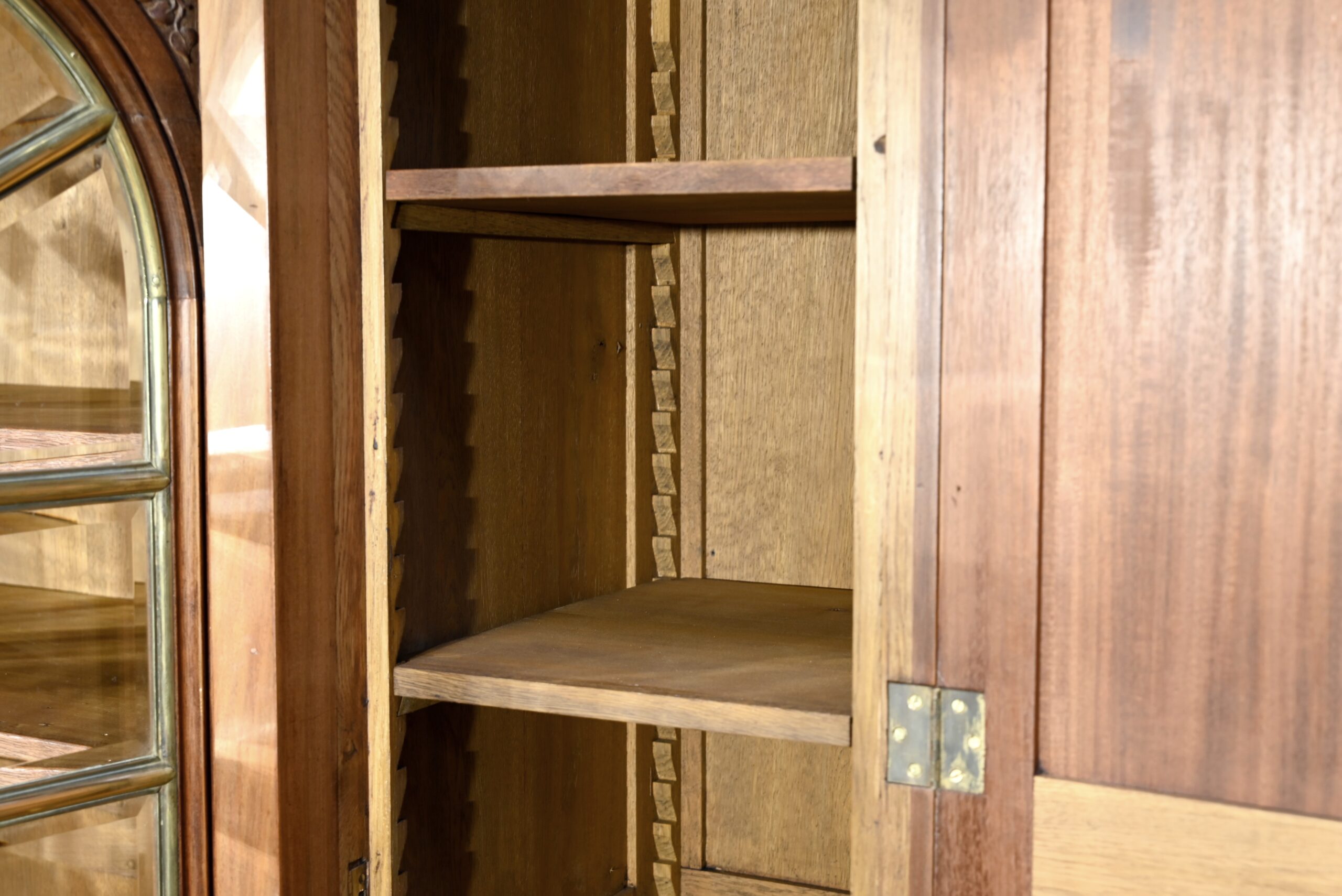 Belle bibliothèque de parquet en acajou massif dotée d’une large partie centrale en ressaut, composée de deux portes vitrées agrémentées de sculptures florales en partie supérieure. Ces portes à encadrement massif sont munies de carreaux rectangulaires biseautés réunis par des croisillons en laiton. En partie haute, les carreaux forment un demi-cintre élégant. A l’ouverture, nous découvrons 4 étagères réglables sur crémaillères.