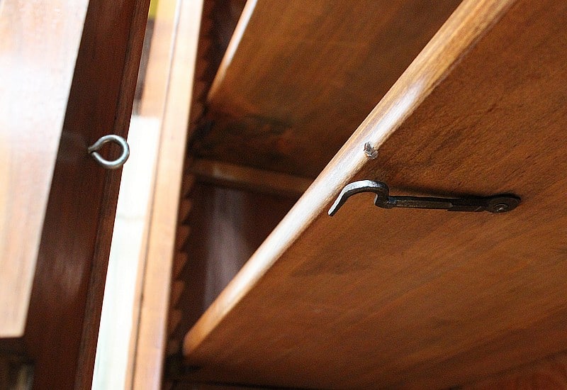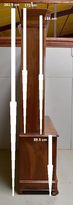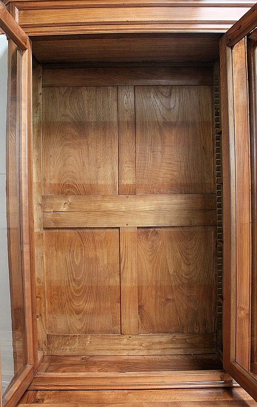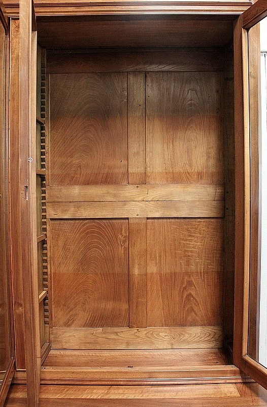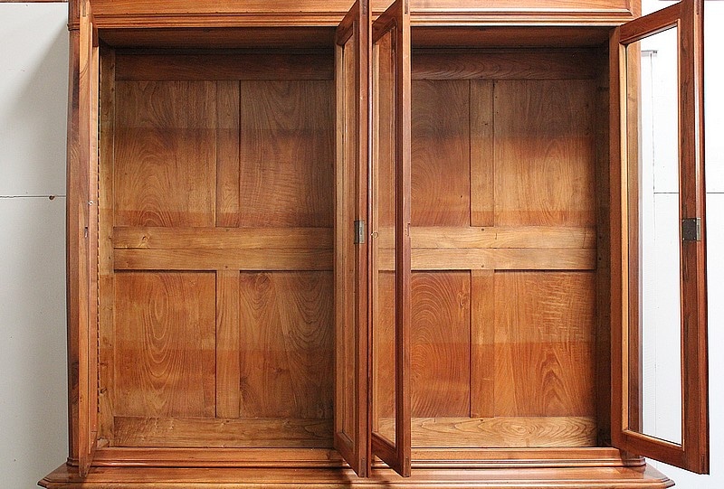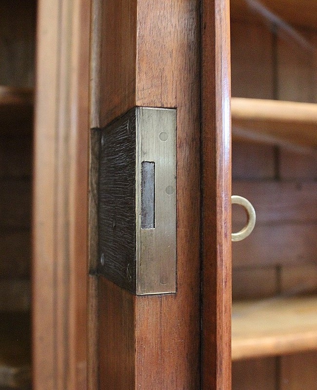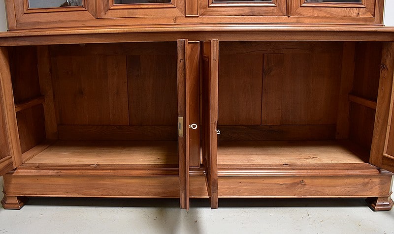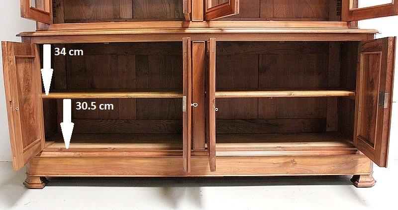 Elle ouvre en partie haute par quatre portes, aux vitrages encadrés de baguettes moulurées aux angles arrondies. Chacune de ces deux paires de portes, fermant à clé par une serrure d’origine, découvre quatre étagères, de 27.5 cm d’épaisseur, sur crémaillères et donc réglables à souhait sur une hauteur totale de rangement de 149 cm.