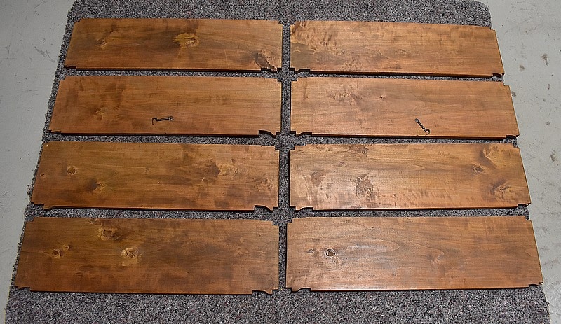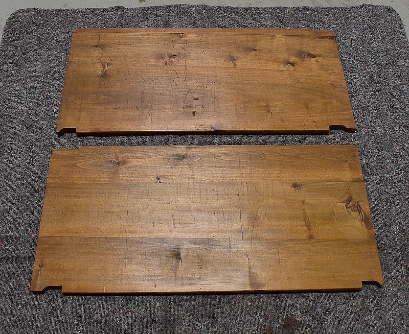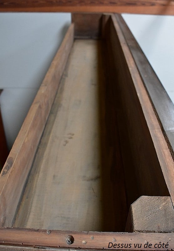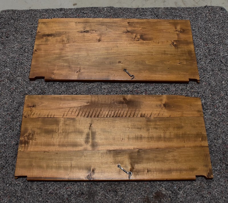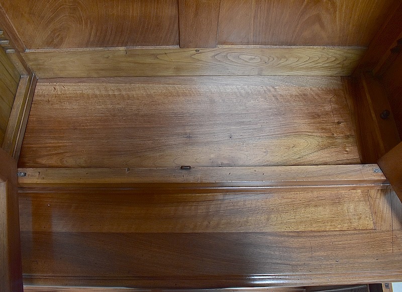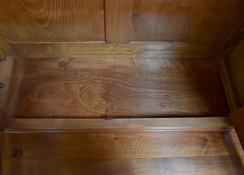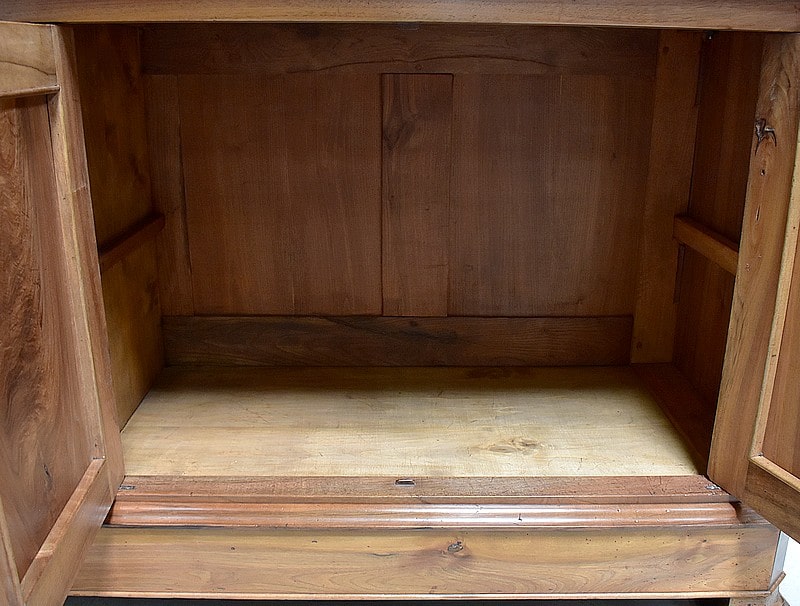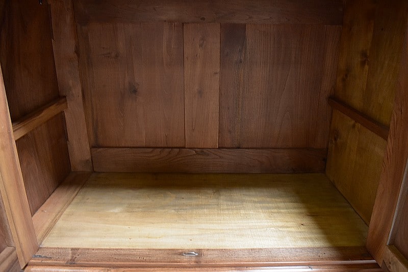 Le Corps du bas, plus large et moins haut, présente une structure similaire, mais est dotée de portes pleines, aux panneaux en cœur de Noyer. Elles ouvrent sur deux espaces offrant chacun deux compartiments de rangement de 34 et 30.5 cm de haut, formés par la présence de deux étagères de 46.5 cm de profondeur, posées sur tasseaux fixes.