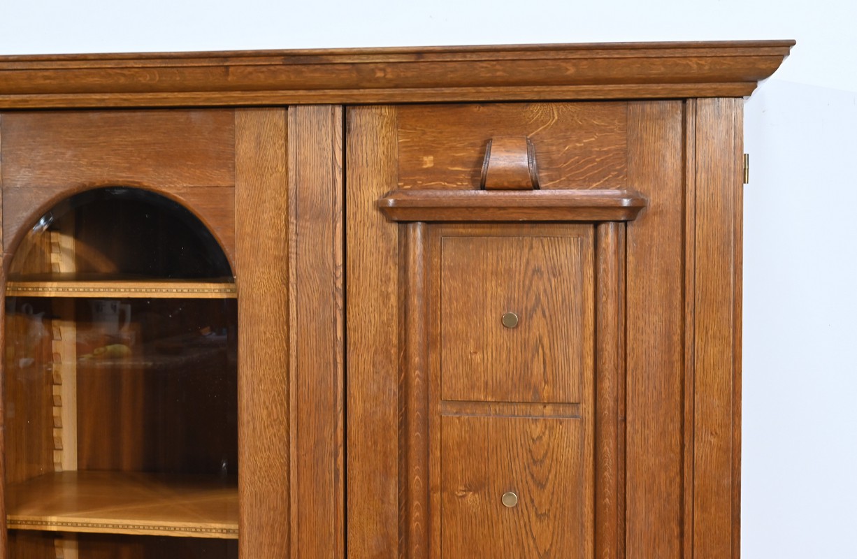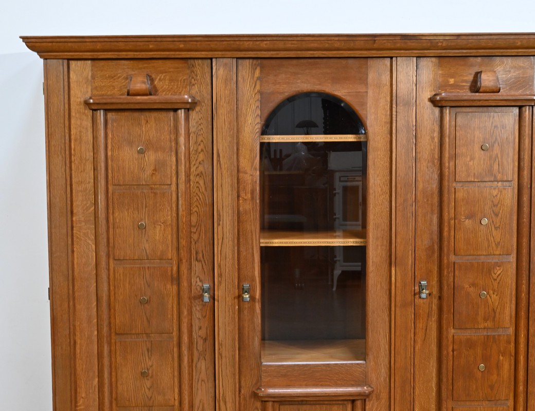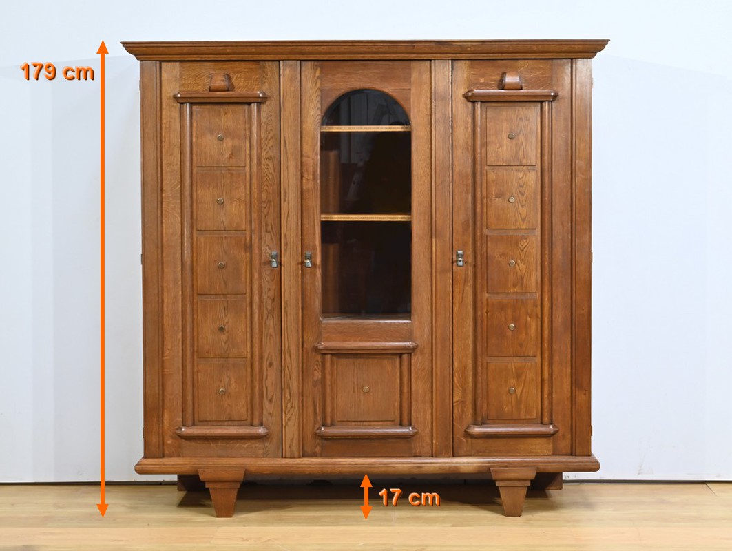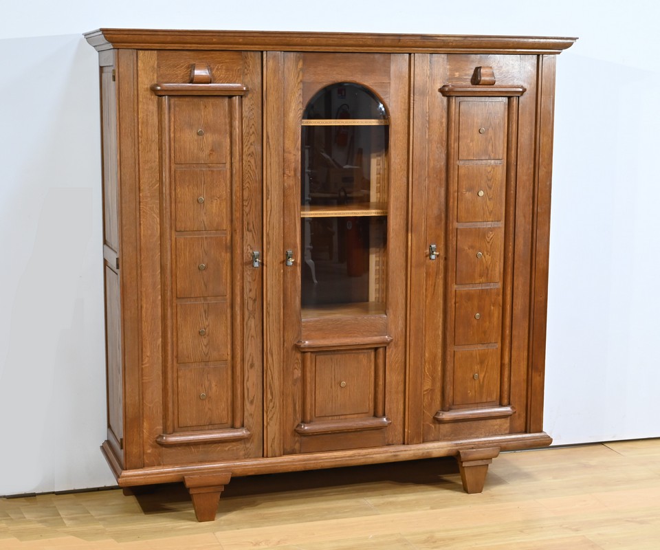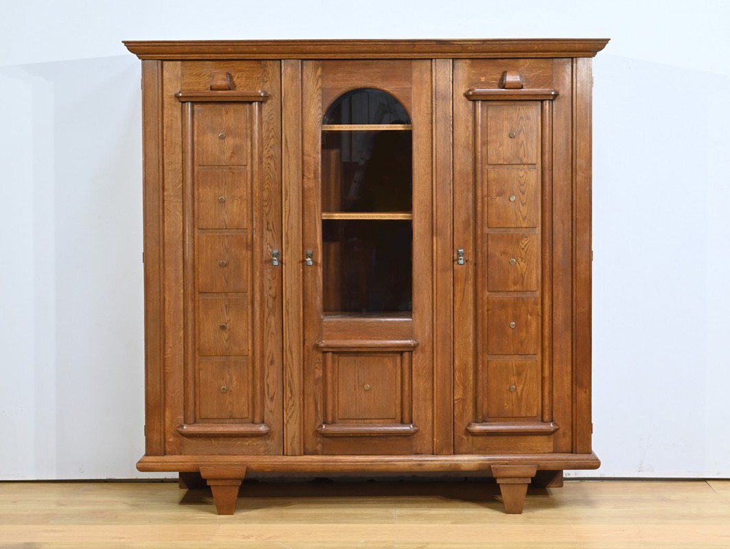 Cette bibliothèque en chêne se distingue par ses trois portes, dont la centrale est vitrée avec un biseau délicat, permettant de mettre en valeur les objets exposés tout en les protégeant de la poussière.