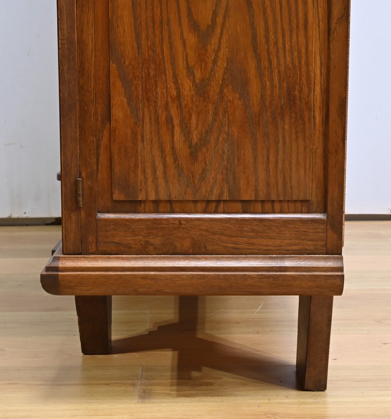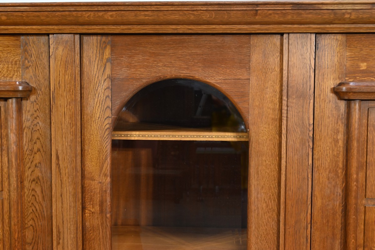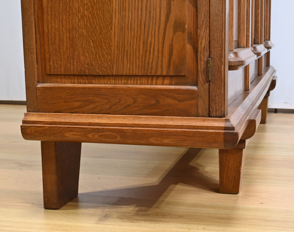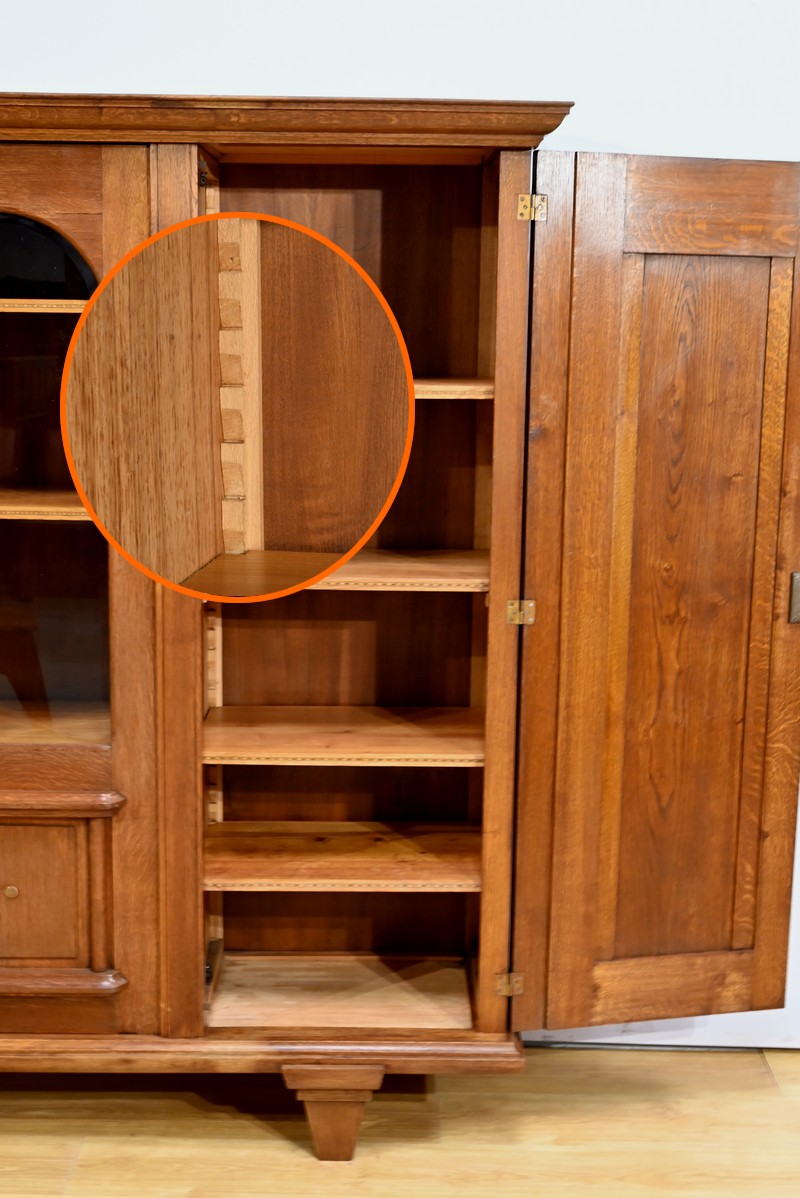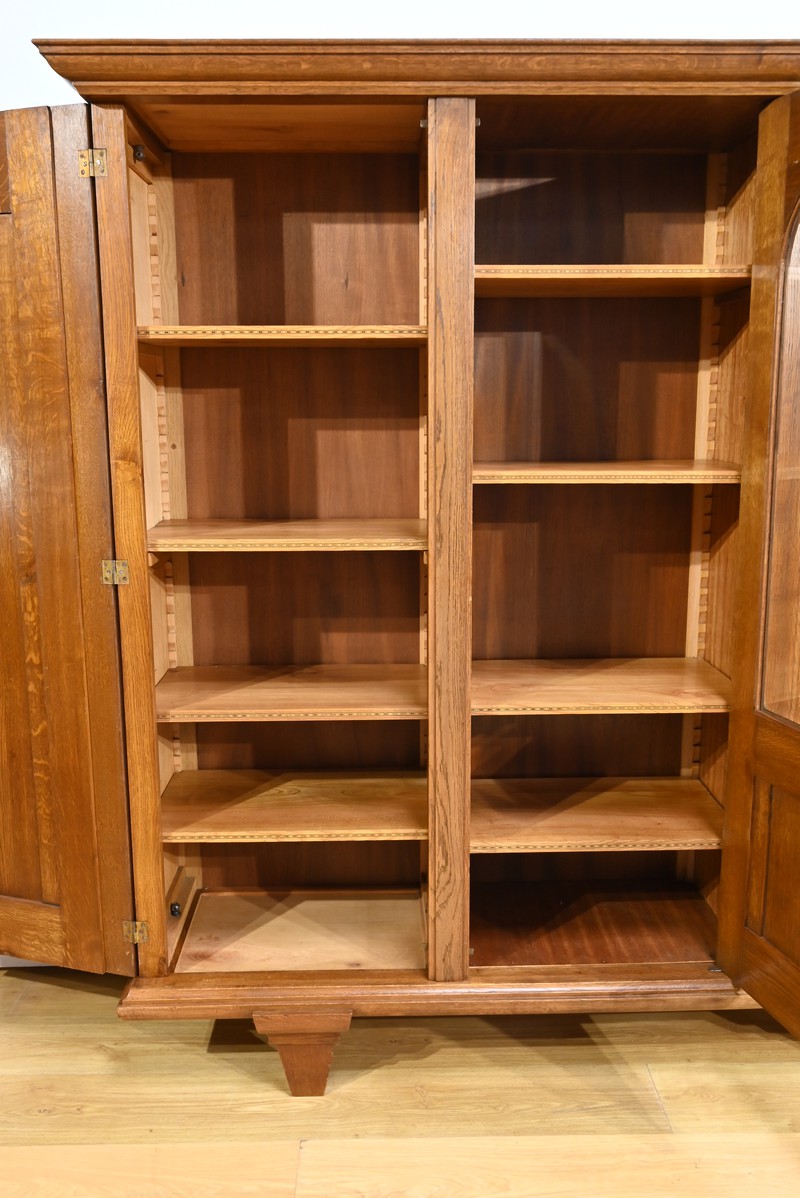 Cette bibliothèque en chêne se distingue par ses trois portes, dont la centrale est vitrée avec un biseau délicat, permettant de mettre en valeur les objets exposés tout en les protégeant de la poussière.