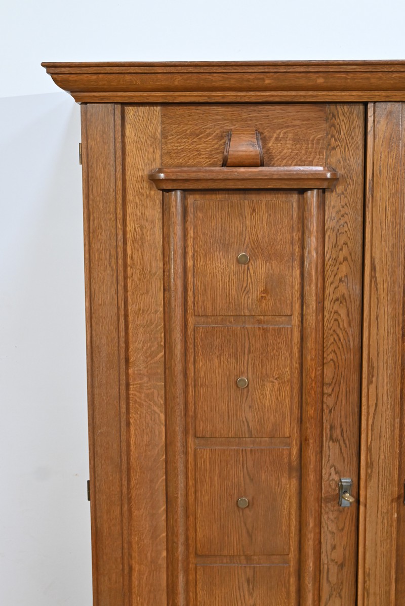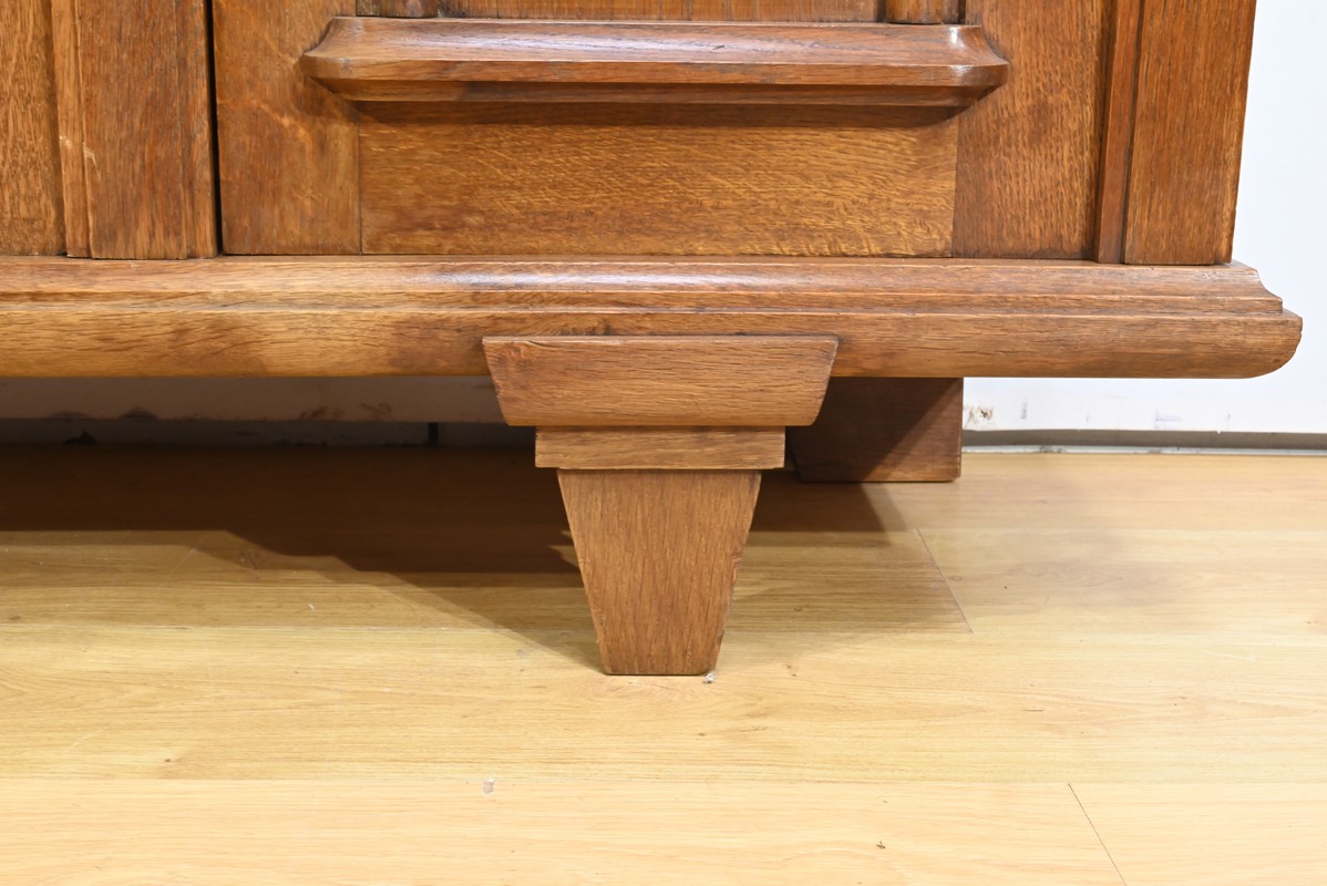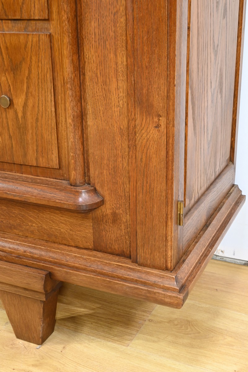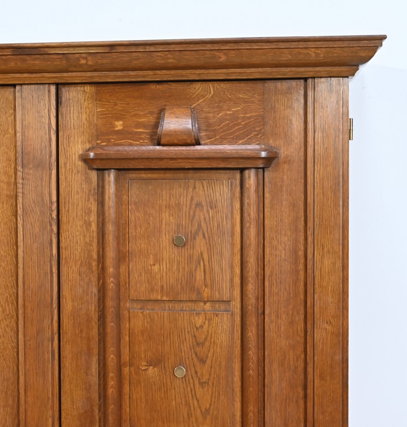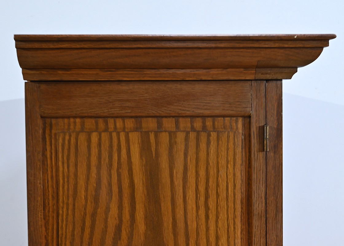 Cette bibliothèque en chêne se distingue par ses trois portes, dont la centrale est vitrée avec un biseau délicat, permettant de mettre en valeur les objets exposés tout en les protégeant de la poussière.