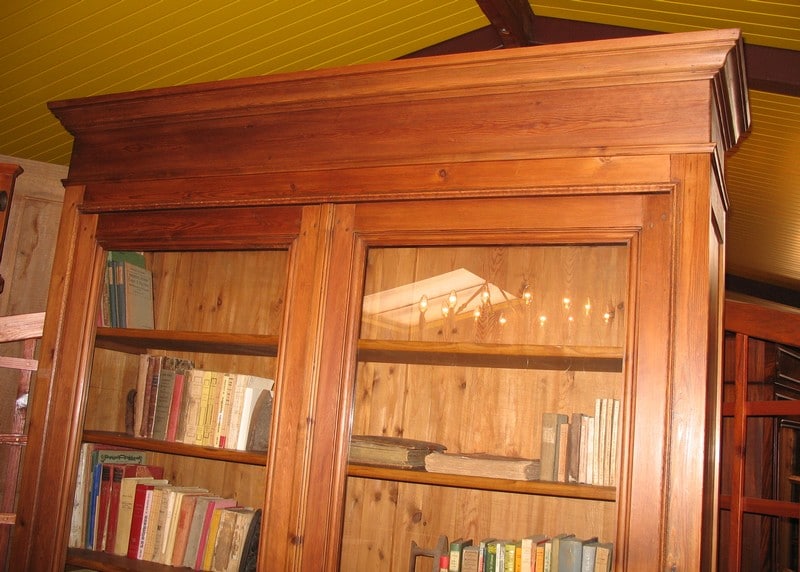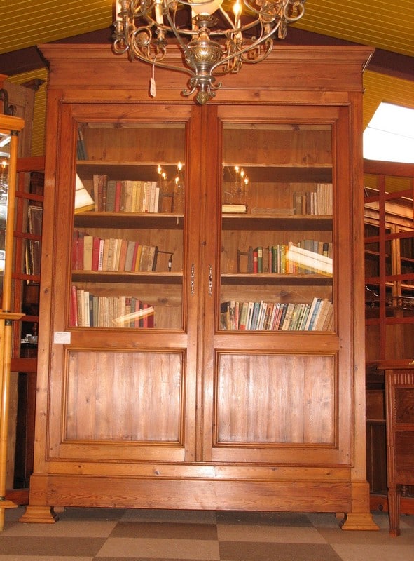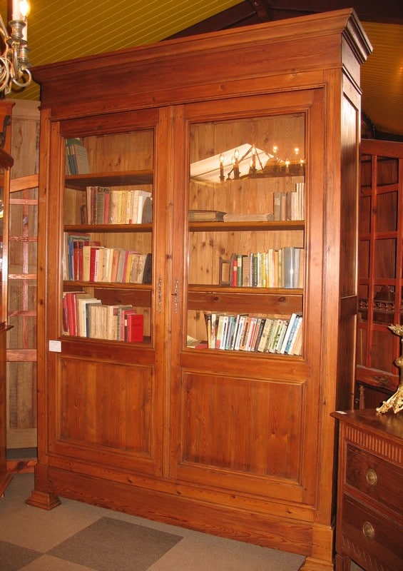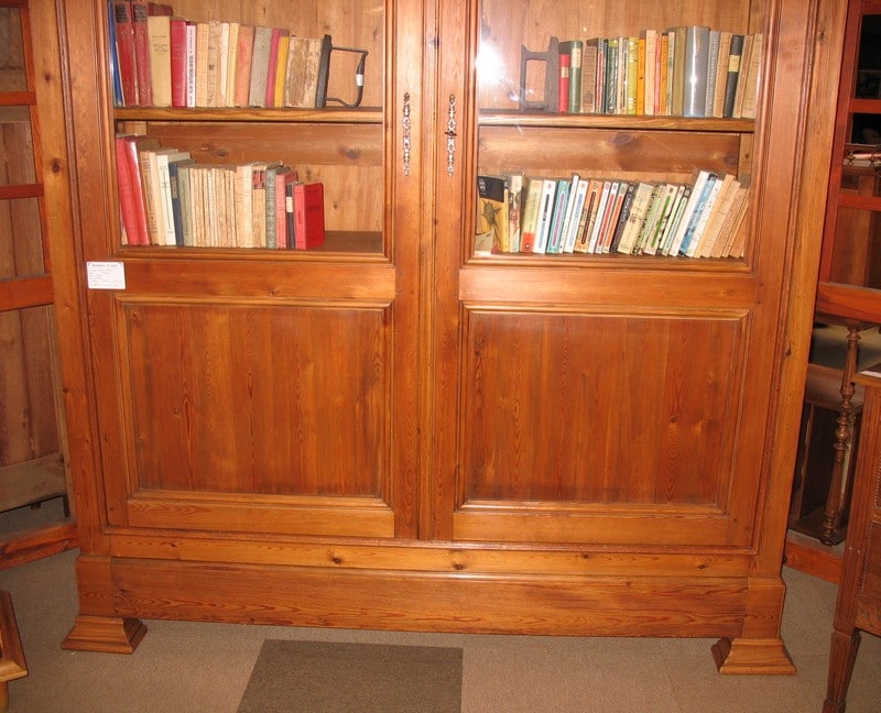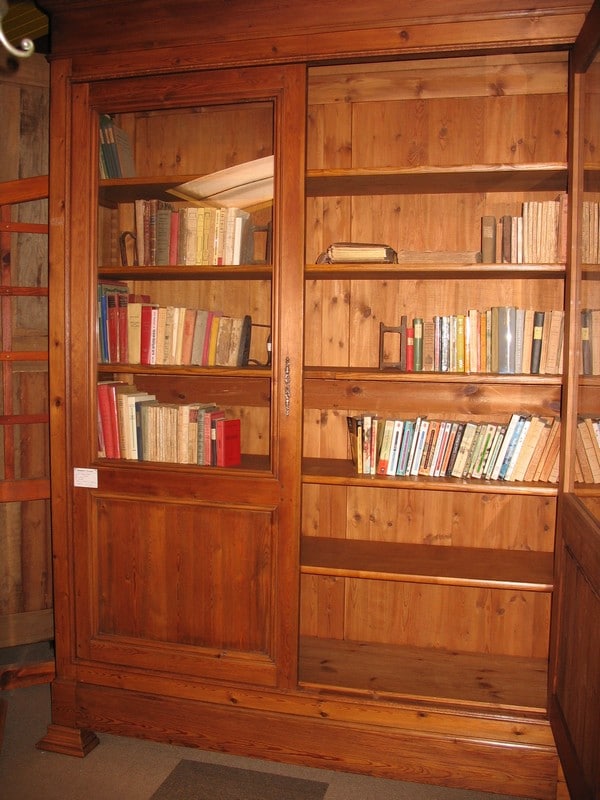 Large bibliothèque en pitchpin ouvrant à 2 portes vitrées et 1 grand tiroir en partie basse. L’intérieur est garni de 5 étagères en frêne. Époque 1900.