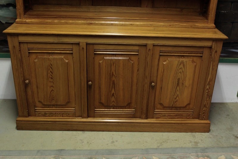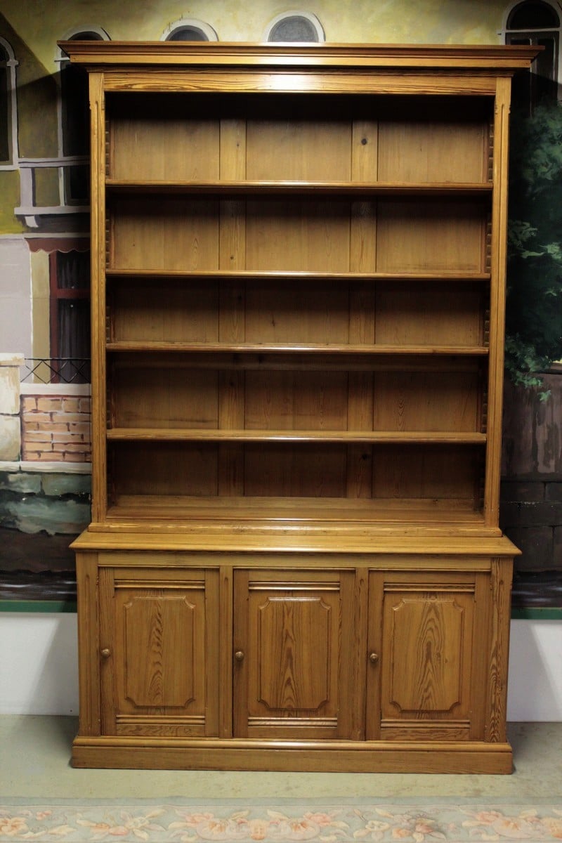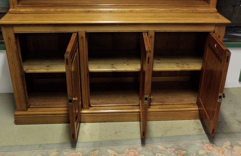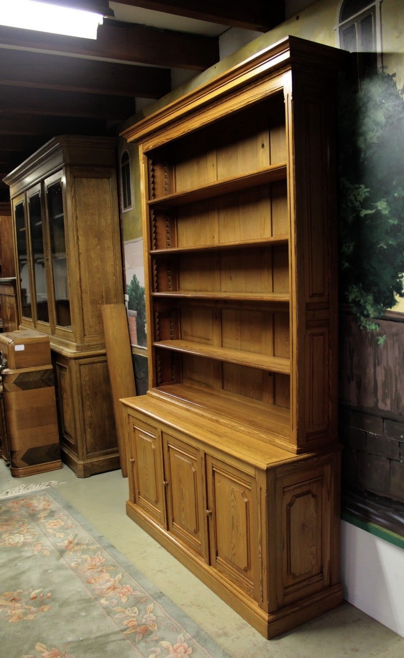 Bibliothèque deux-corps de Communauté en pitchpin. La partie haute, ouverte, est à rayonnages – 4 étagères sur crémaillères- et la partie basse ferme par 3 petites portes. Finition cirée, ton miel. Époque 1920.