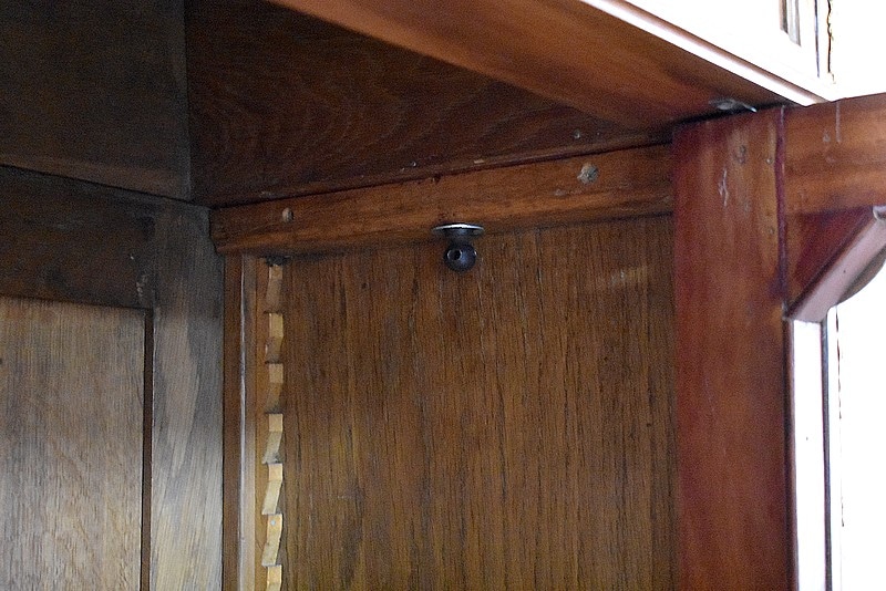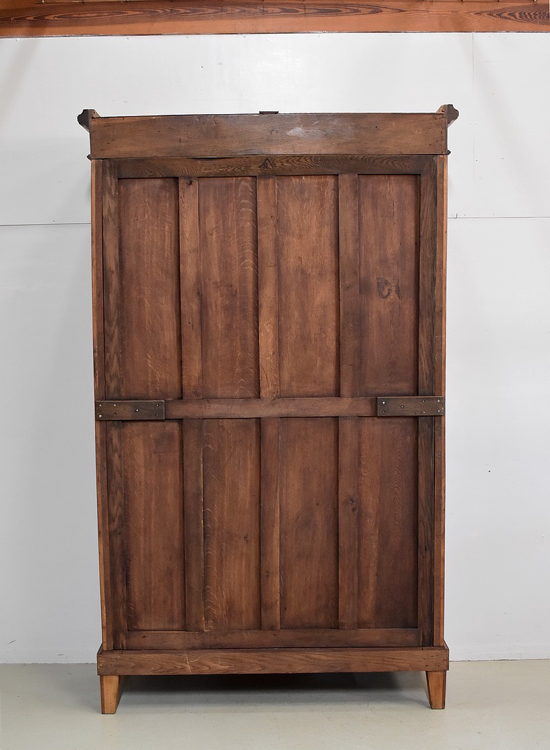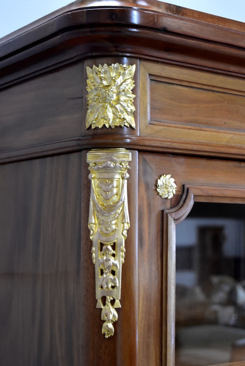 Elle ouvre par deux portes vitrées avec fermeture à serrure haut et bas donnant sur 4 étagères en acajou massif d’une épaisseur de 2,5 cm. Ces dernières amovibles sont posées sur crémaillères permettant le choix de leur répartition. La partie basse des portes est à larges plates-bandes à reliefs moulurés.