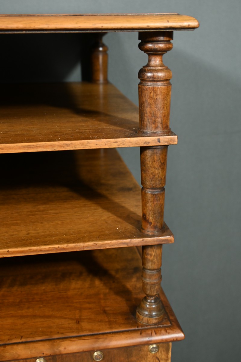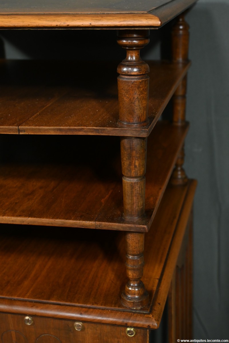 Ces étagères sont solidarisées par des montants tournés en fuseau, ajoutant une touche d’élégance et de sophistication.