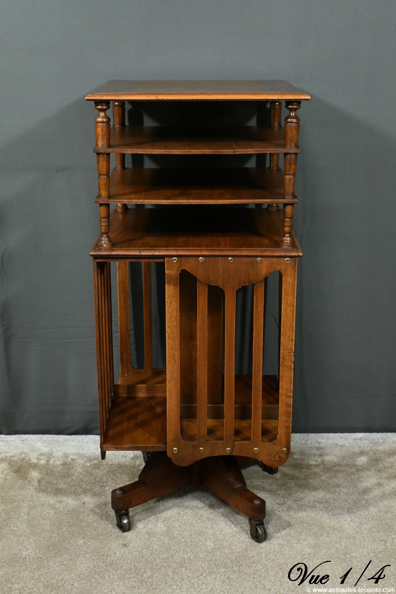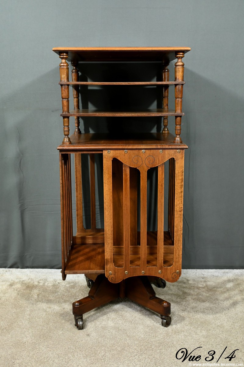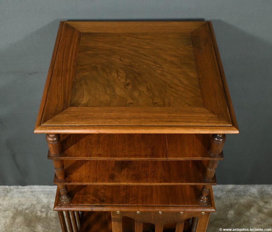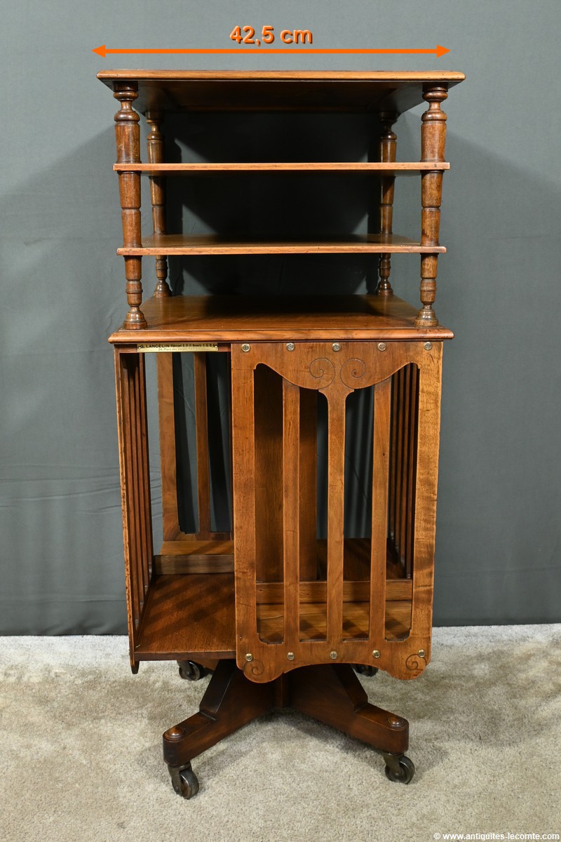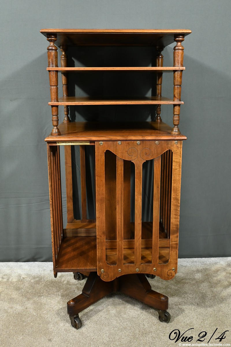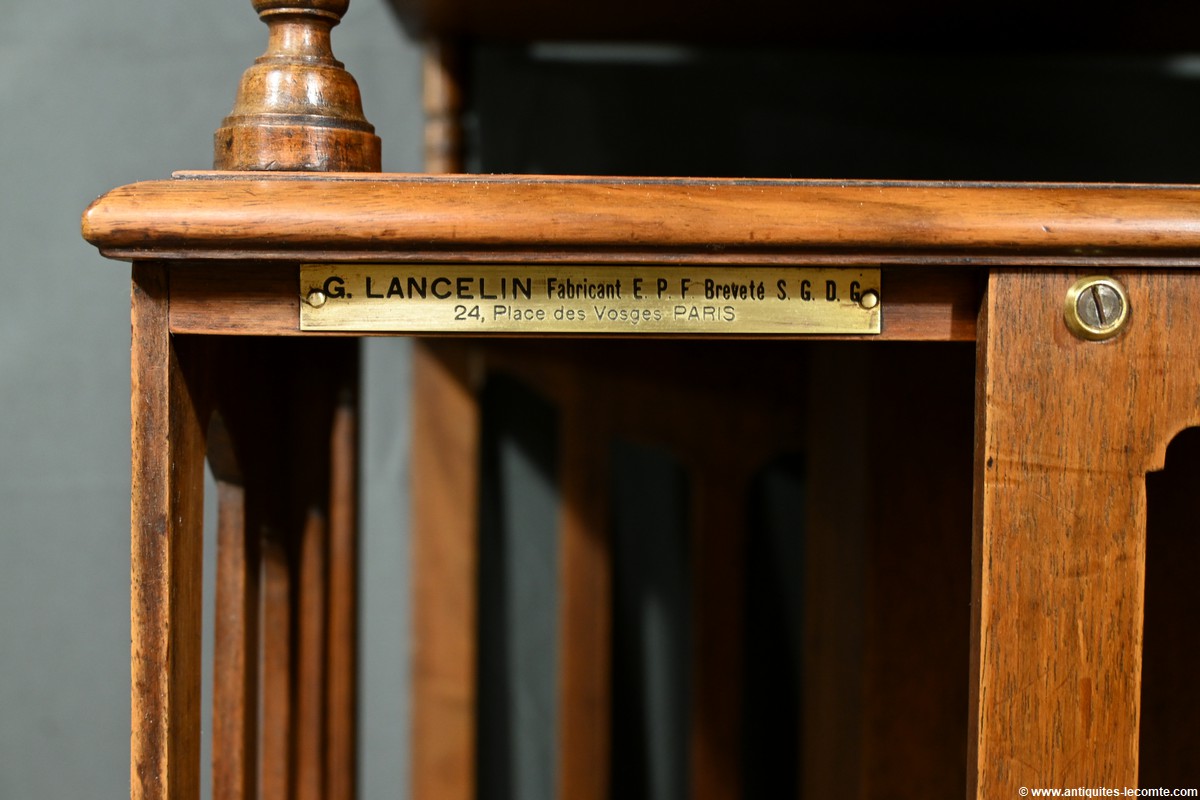 Cette bibliothèque tournante en noyer, datant de 1900, est une pièce d’exception estampillée par le fabricant G. Lancelin, domicilié au 24, place des Vosges à Paris.