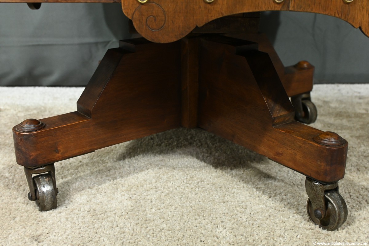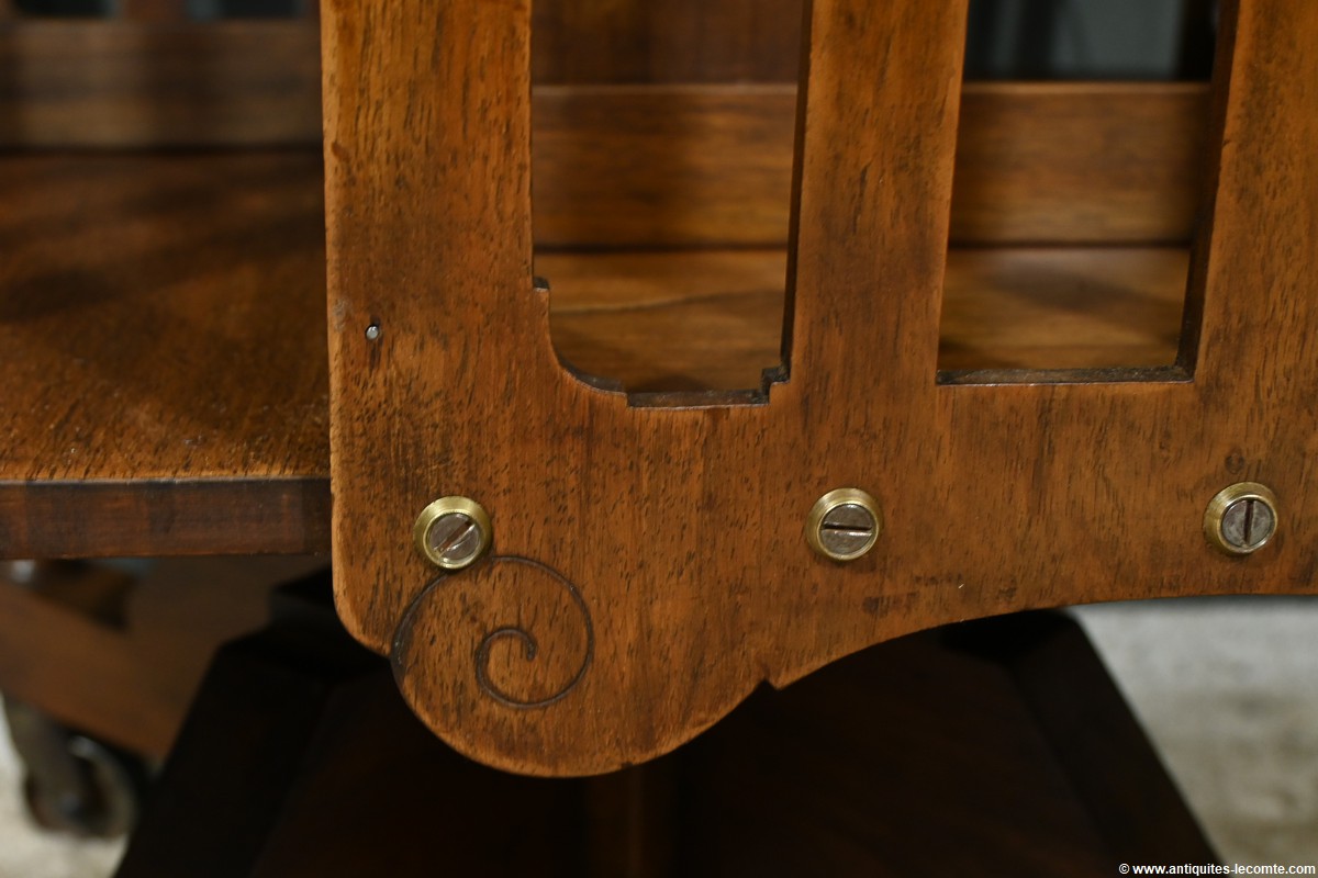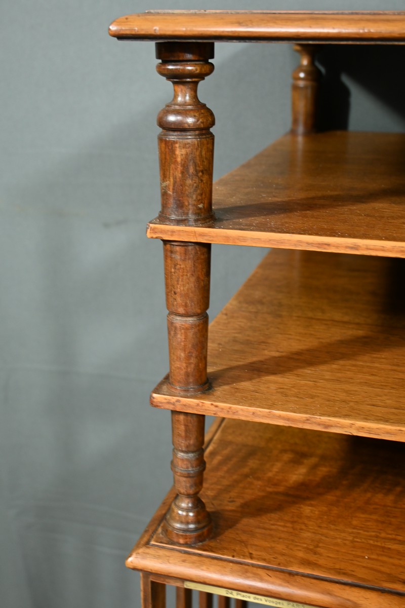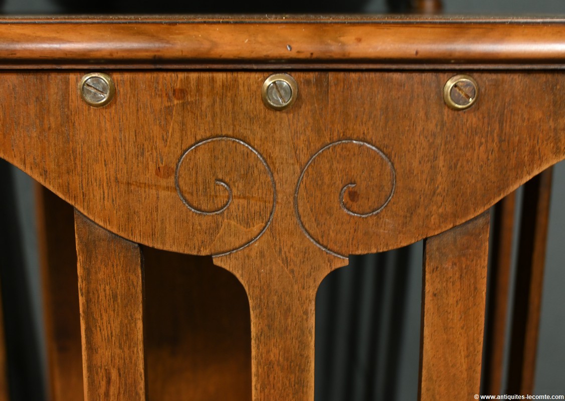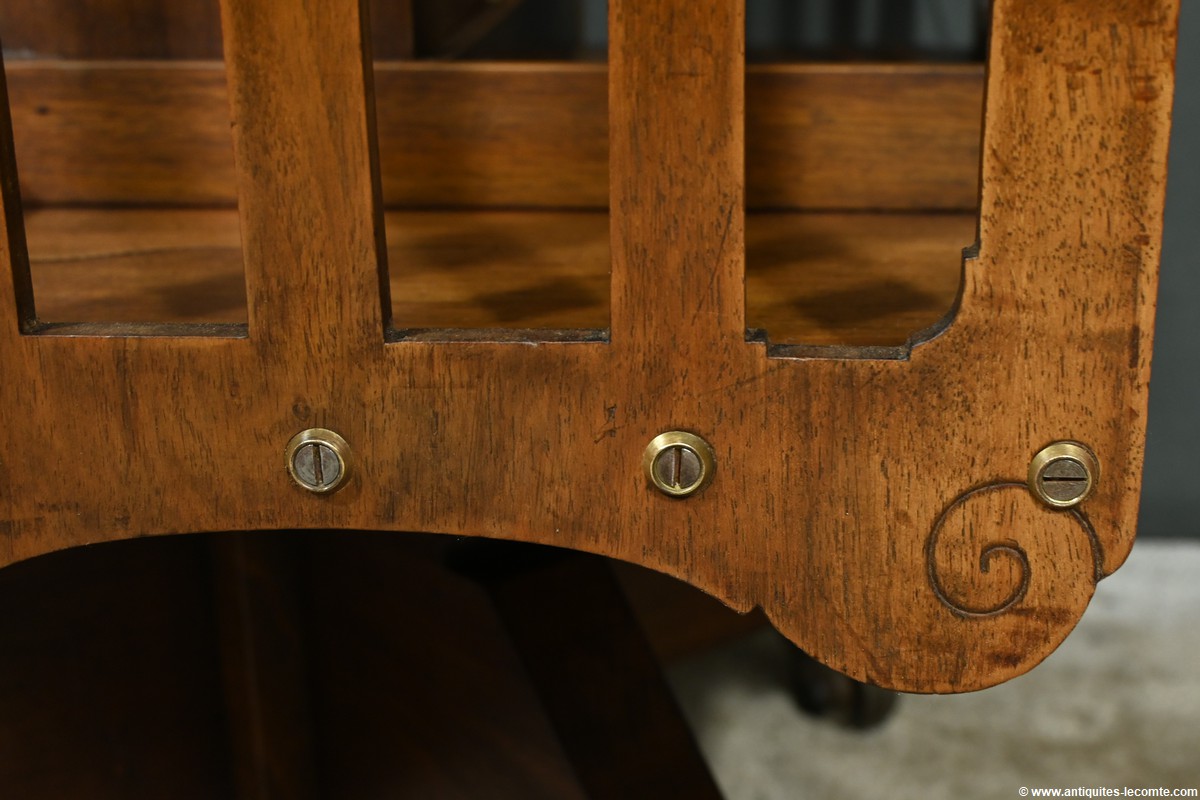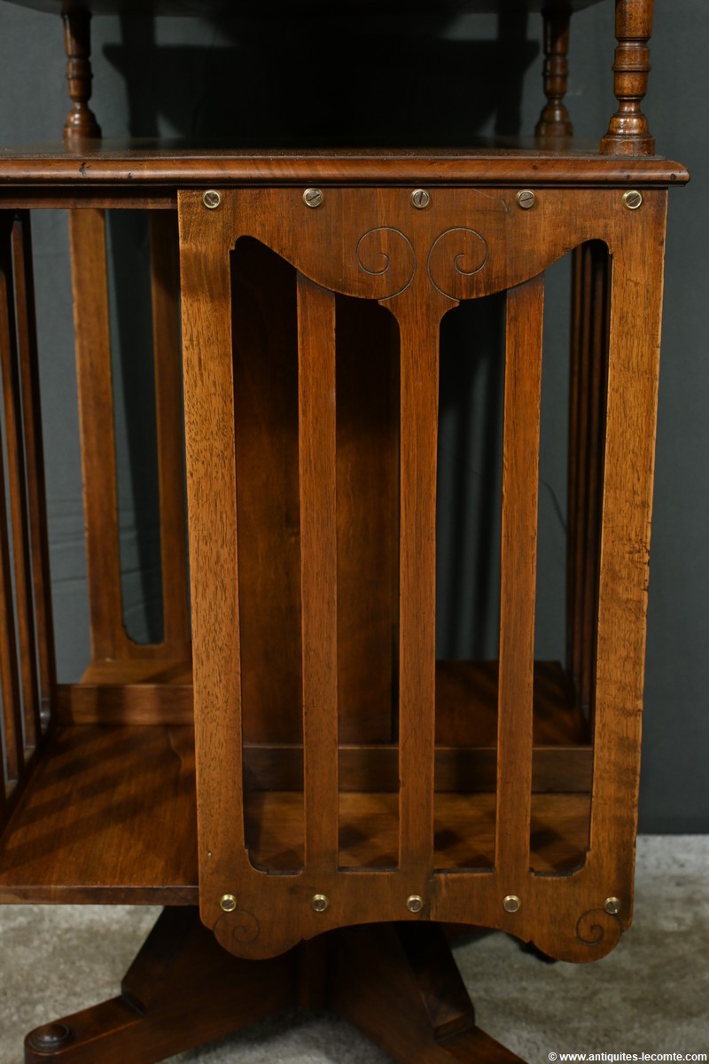 Cette bibliothèque tournante en noyer, datant de 1900, est une pièce d’exception estampillée par le fabricant G. Lancelin, domicilié au 24, place des Vosges à Paris.