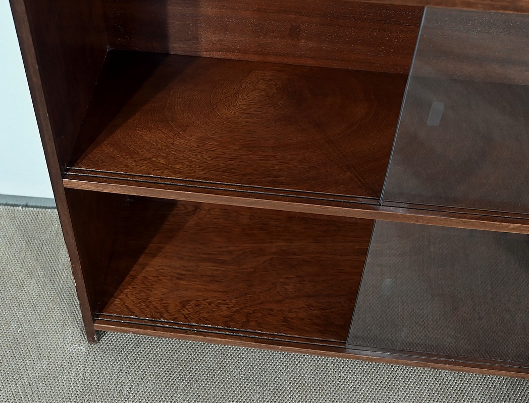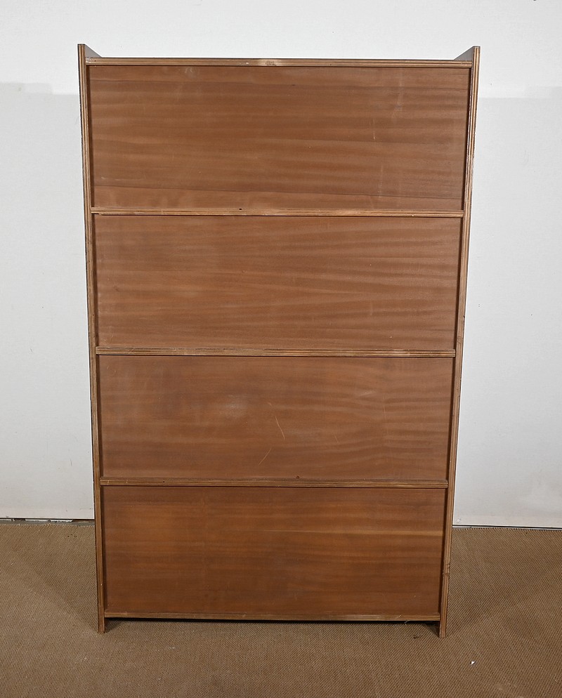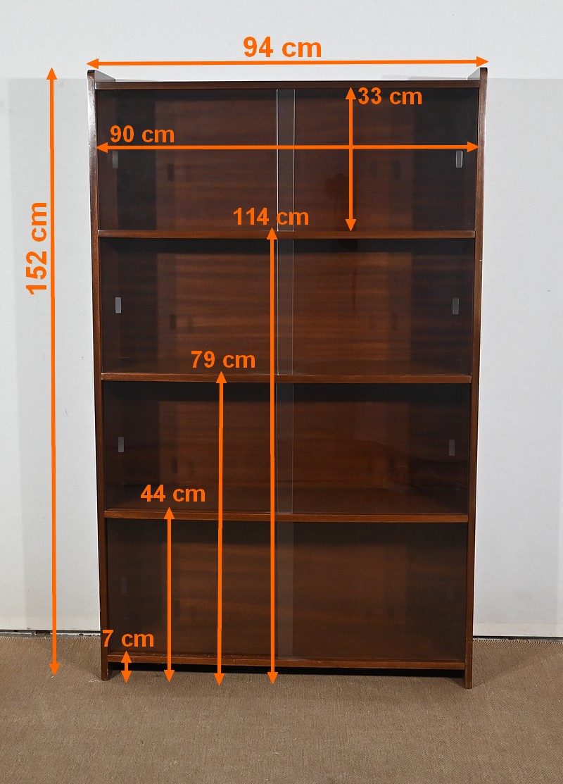 Crée par le designer Français Didier Rozaffy, cette bibliothèque vitrée, en placage d’acajou, comporte quatre étagères. Ce meuble vintage possède une ligne sobre et des espaces de rangement conséquents. Les vitres coulissantes, toutes présentes, comportent chacune une encoche gravée.