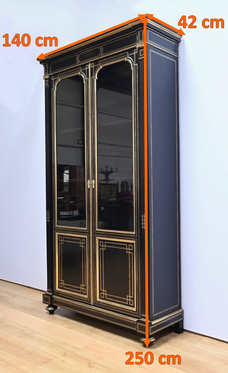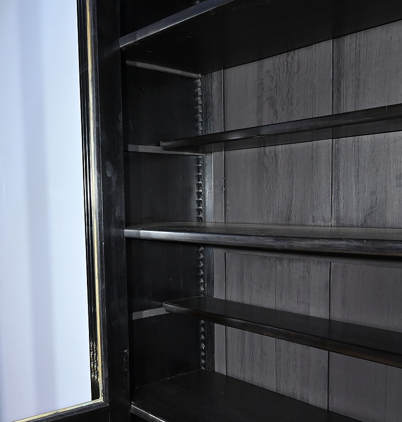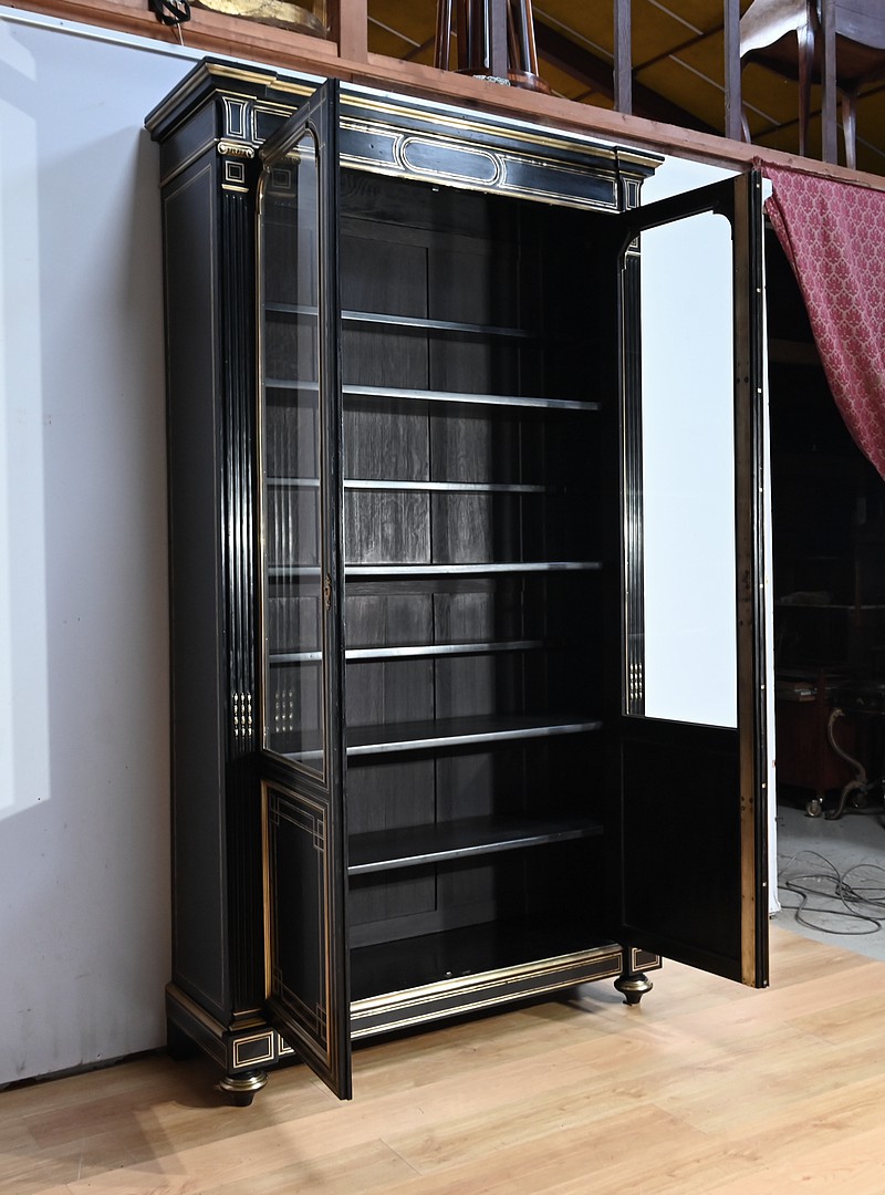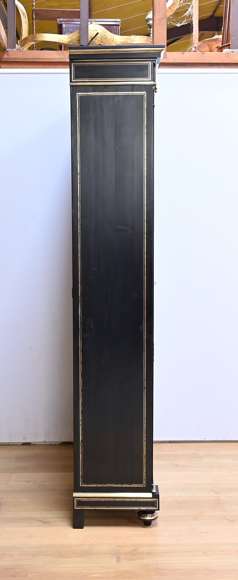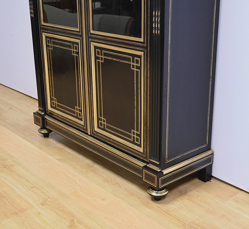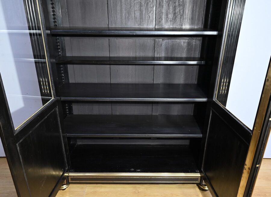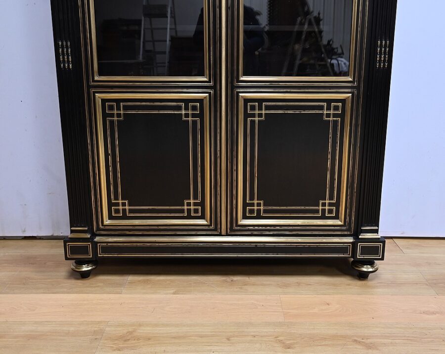 Importante bibliothèque Napoléon III en poirier noirci, ouvrant par deux portes, ornementée de nombreuses incrustations de laiton. Chaque porte présente une vitre aux deux tiers, entourée d’une baguette moulurée en partie intérieure et de plusieurs filets de laiton de différentes largeurs. En partie supérieure et sur les panneaux bas, ces incrustations entrelacées forment des coins grecs. Les entrées, clés et serrure haut et bas sont d’origine et en parfait état de fonctionnement. Un couvre joint ciselé réunit les deux portes. Cette bibliothèque est dotée de pilastres figurant des montants à cannelures arrêtées et repose sur des pieds toupie habillés de collerettes laiton.