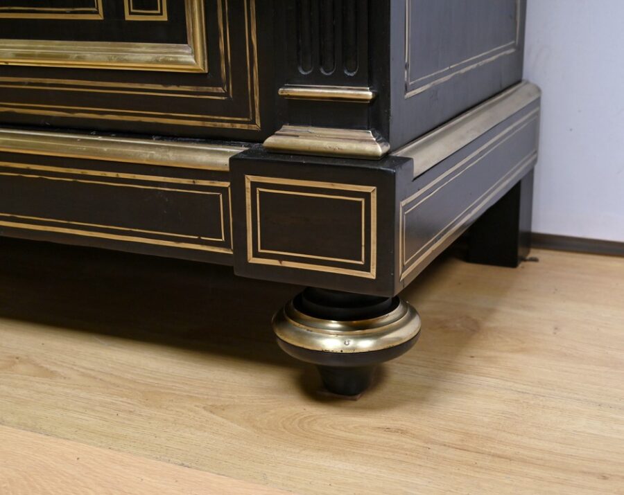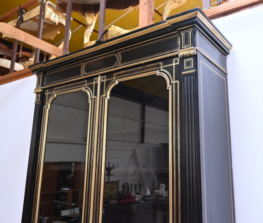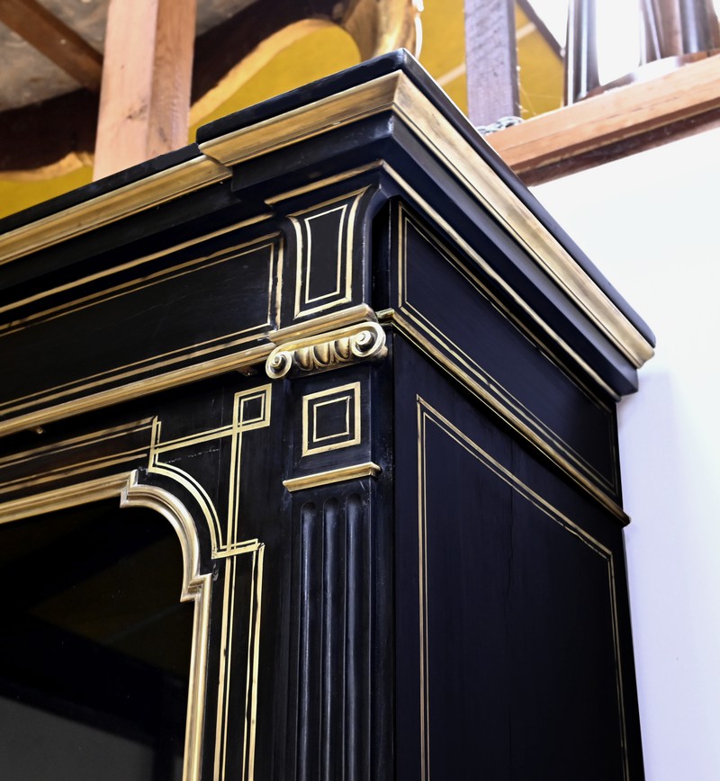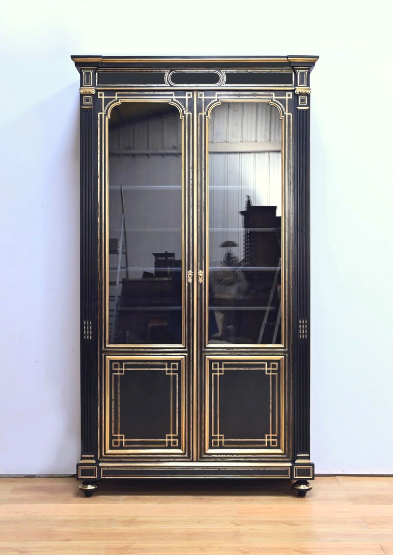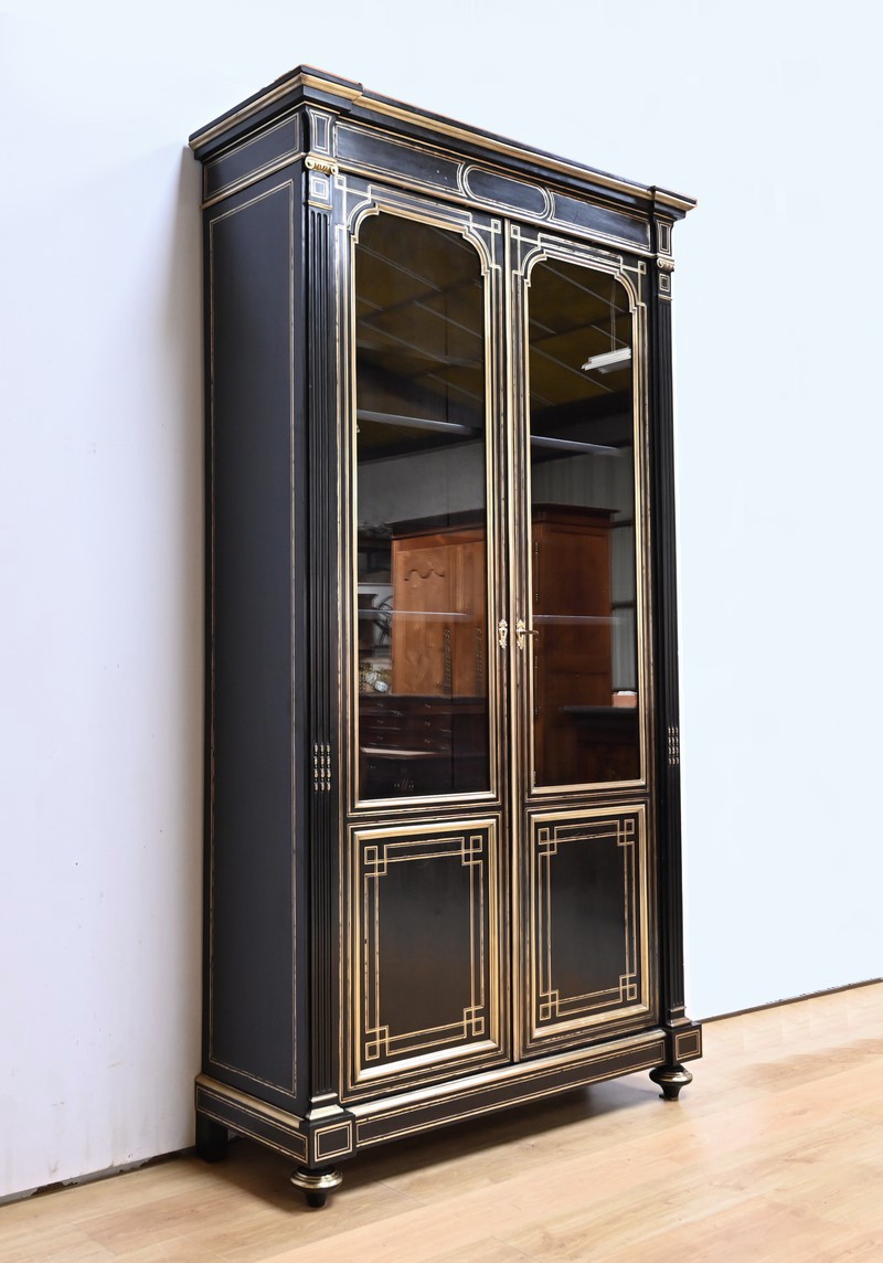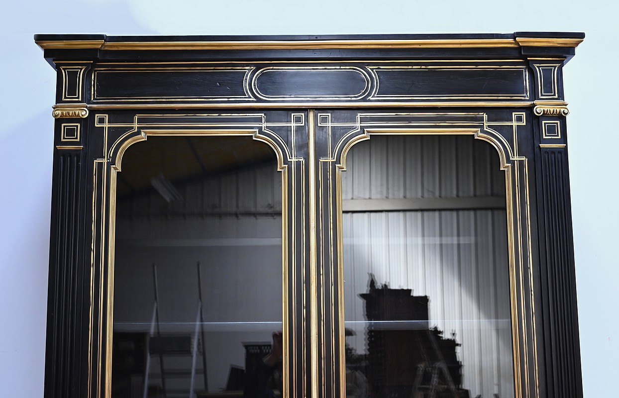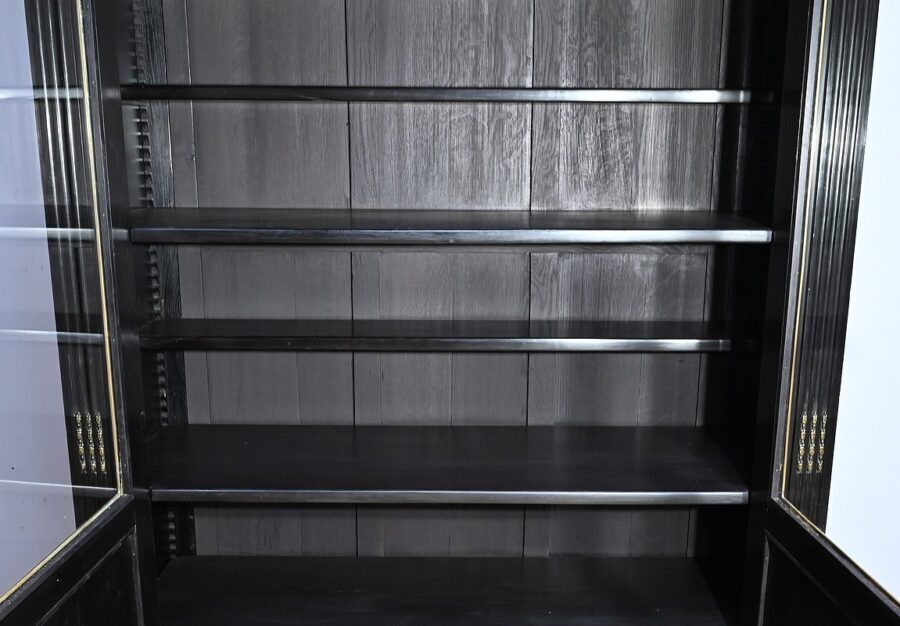 Importante bibliothèque Napoléon III en poirier noirci, ouvrant par deux portes, ornementée de nombreuses incrustations de laiton. Chaque porte présente une vitre aux deux tiers, entourée d’une baguette moulurée en partie intérieure et de plusieurs filets de laiton de différentes largeurs. En partie supérieure et sur les panneaux bas, ces incrustations entrelacées forment des coins grecs. Les entrées, clés et serrure haut et bas sont d’origine et en parfait état de fonctionnement. Un couvre joint ciselé réunit les deux portes. Cette bibliothèque est dotée de pilastres figurant des montants à cannelures arrêtées et repose sur des pieds toupie habillés de collerettes laiton.