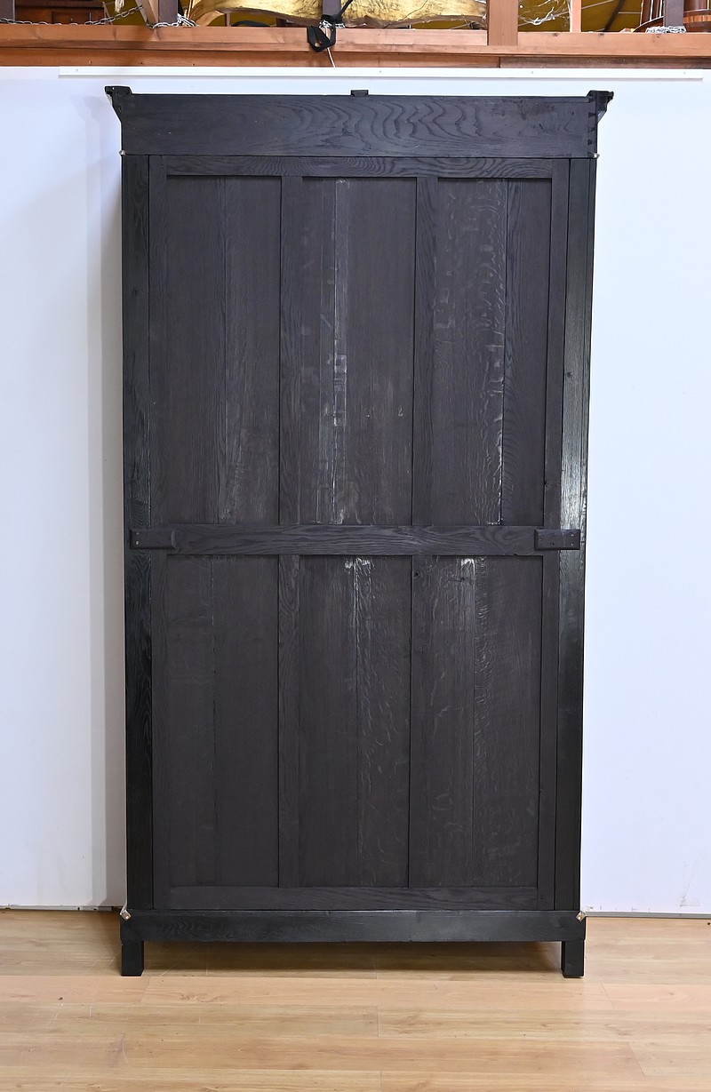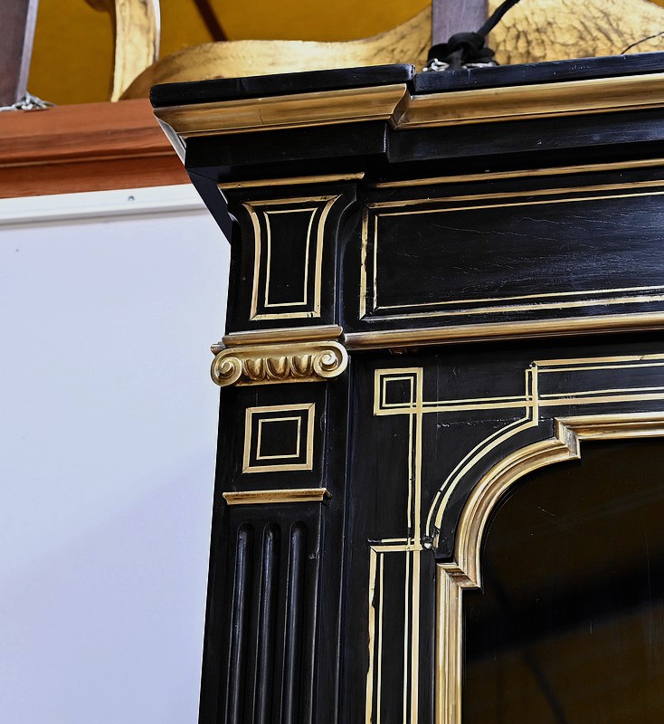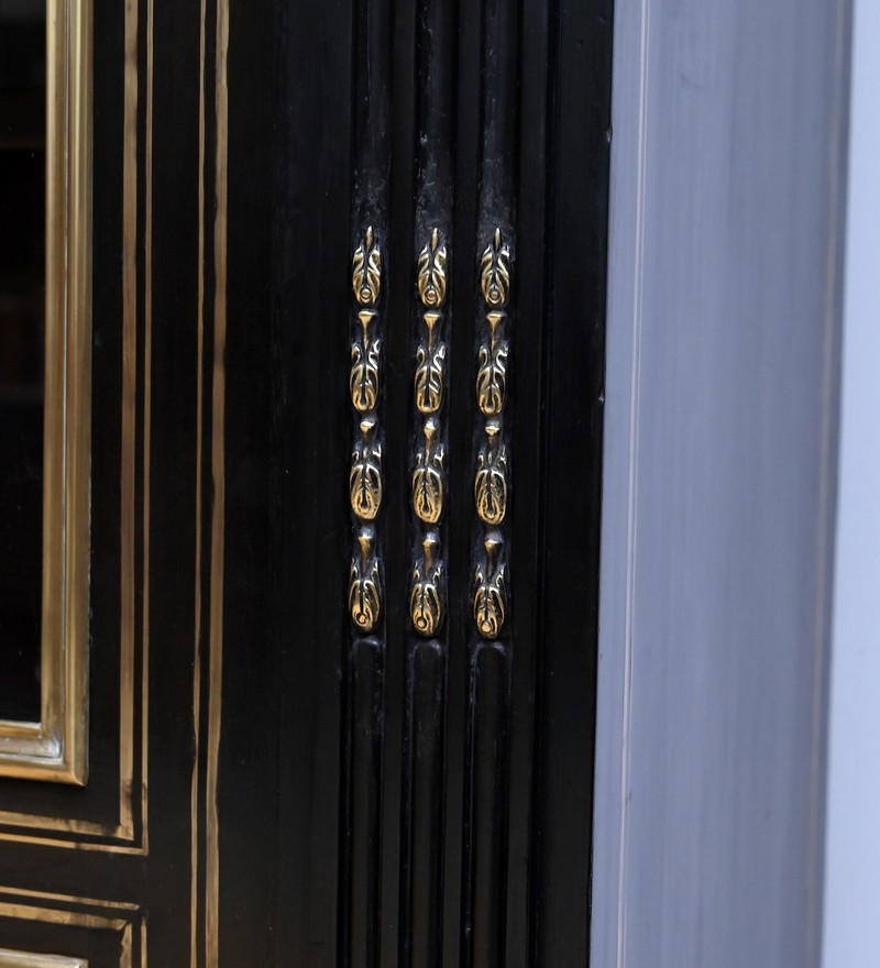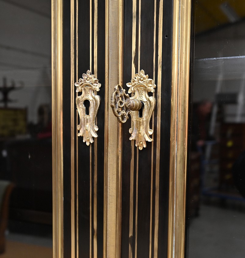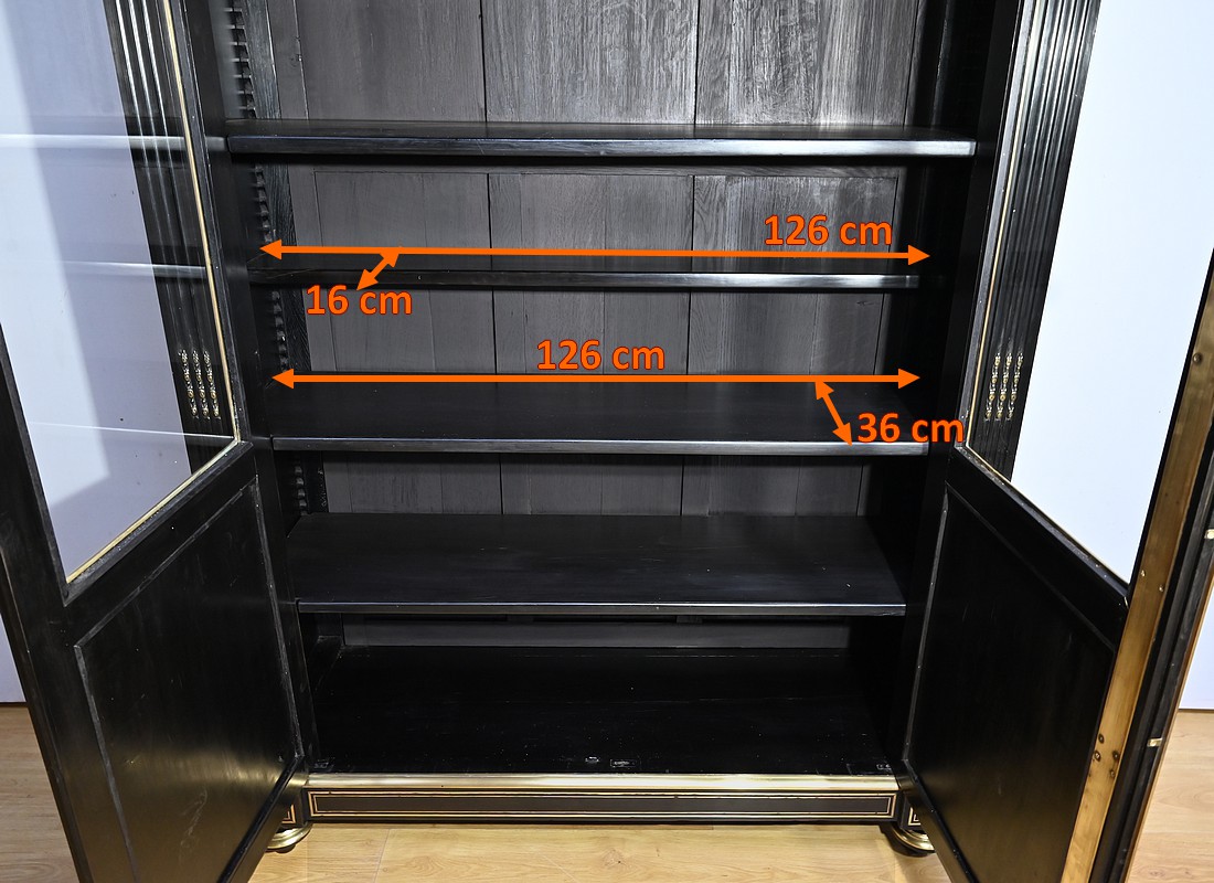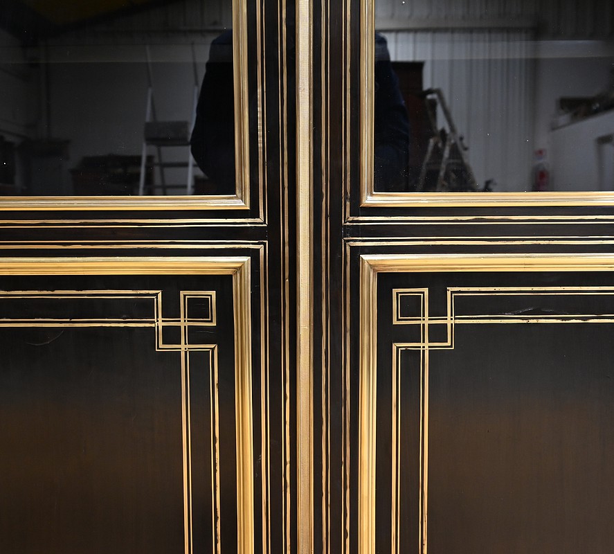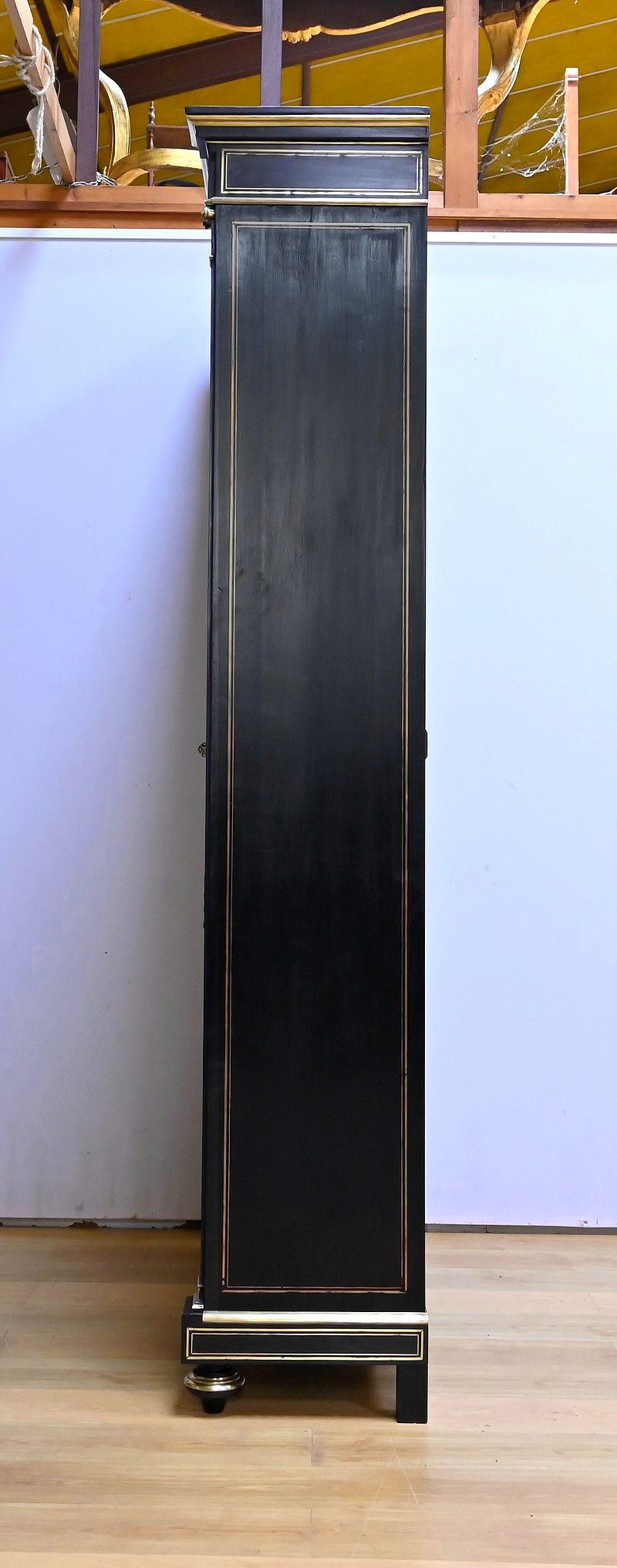 Importante bibliothèque Napoléon III en poirier noirci, ouvrant par deux portes, ornementée de nombreuses incrustations de laiton. Chaque porte présente une vitre aux deux tiers, entourée d’une baguette moulurée en partie intérieure et de plusieurs filets de laiton de différentes largeurs. En partie supérieure et sur les panneaux bas, ces incrustations entrelacées forment des coins grecs. Les entrées, clés et serrure haut et bas sont d’origine et en parfait état de fonctionnement. Un couvre joint ciselé réunit les deux portes. Cette bibliothèque est dotée de pilastres figurant des montants à cannelures arrêtées et repose sur des pieds toupie habillés de collerettes laiton.